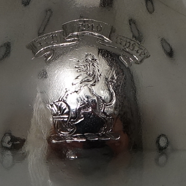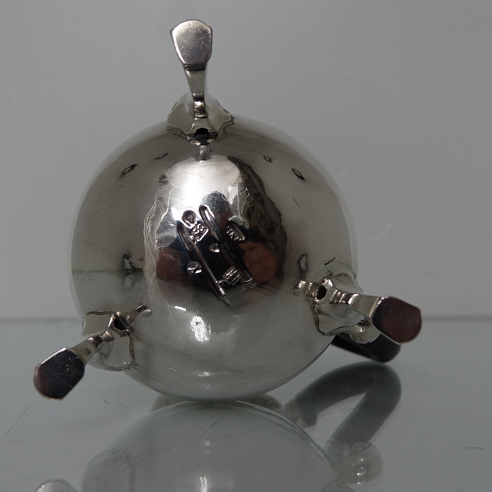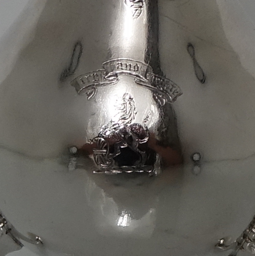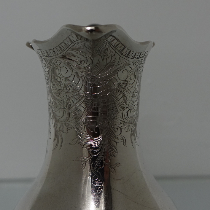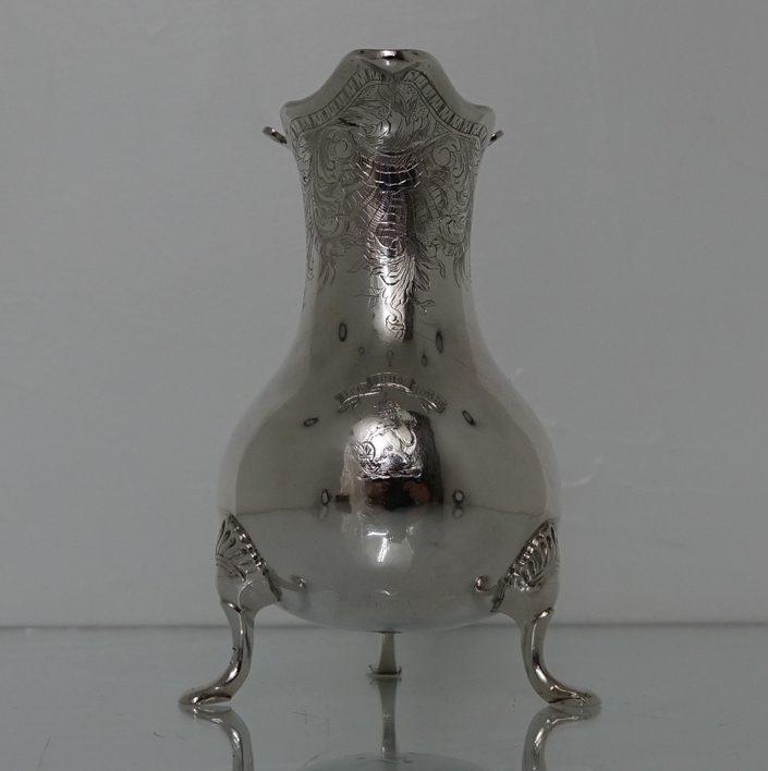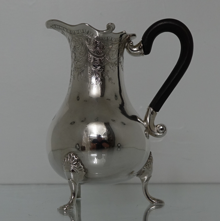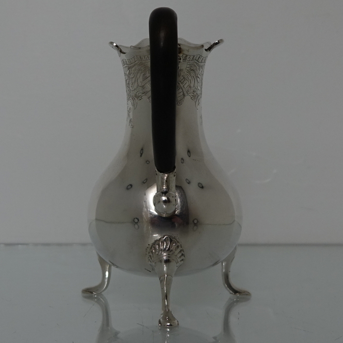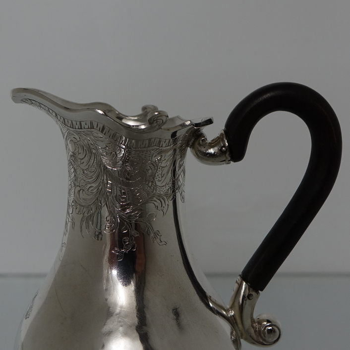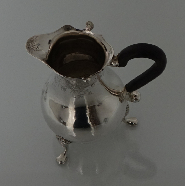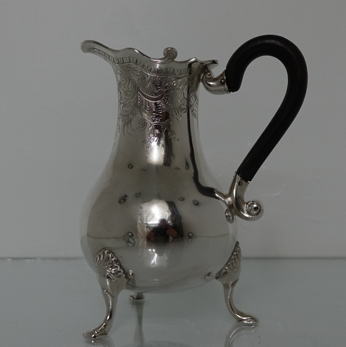 A very rare and elegant bright cut engraved cream jug with fruit wood single scroll handle. The cream jug has a beautiful upper band of elegant hand engraving for highlights and sits on three ornate peg feet. The center front of the cream jug has a stylish crest with a Latin motif above.