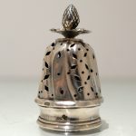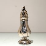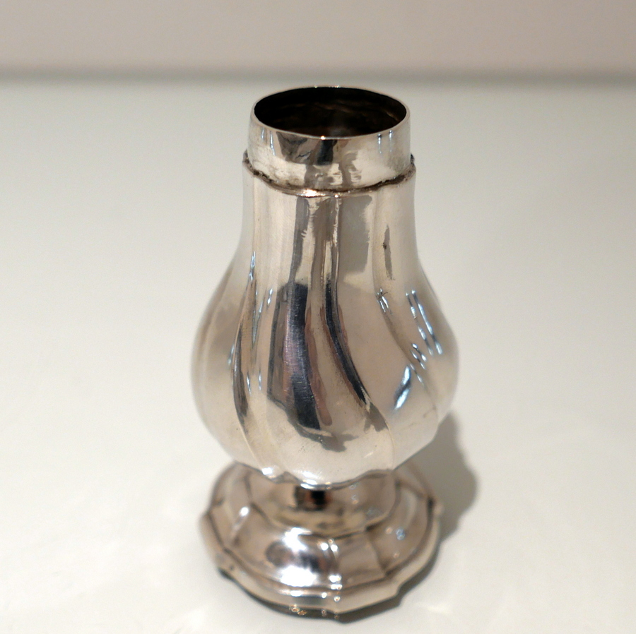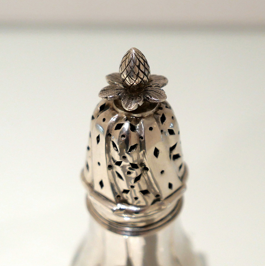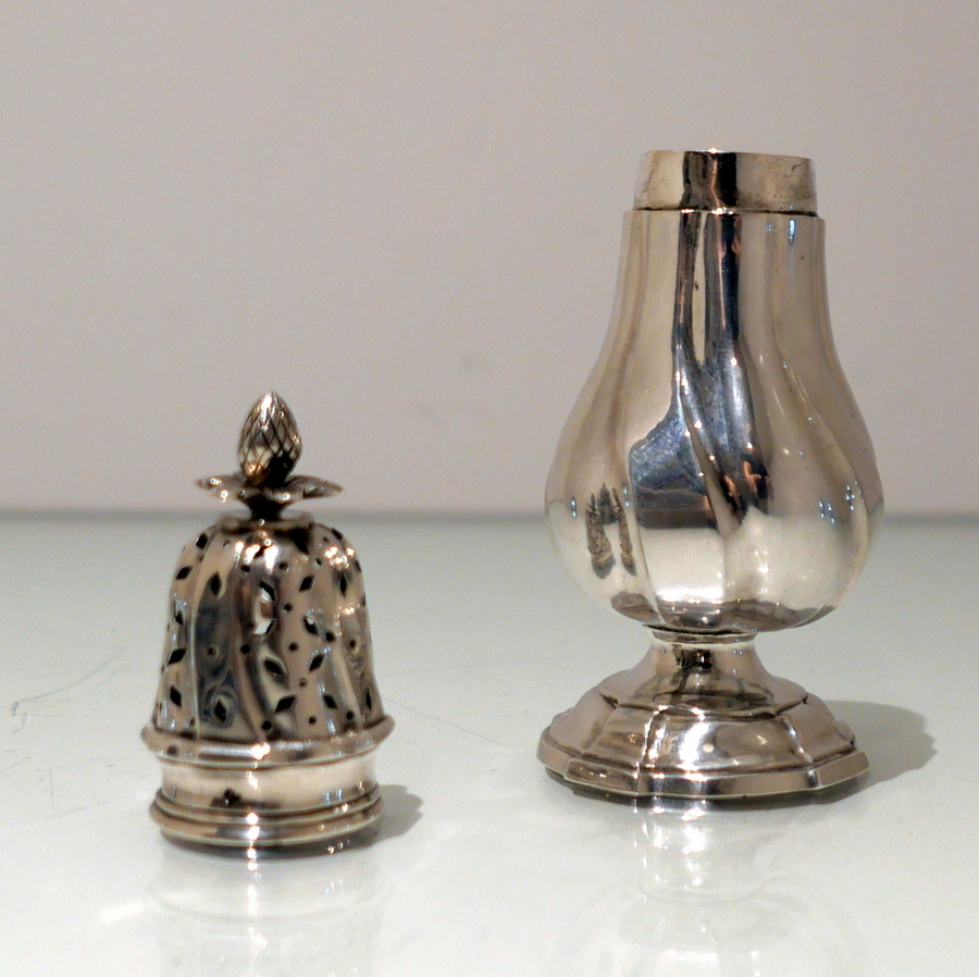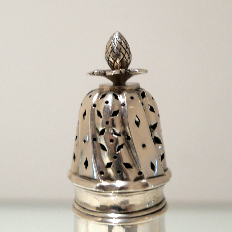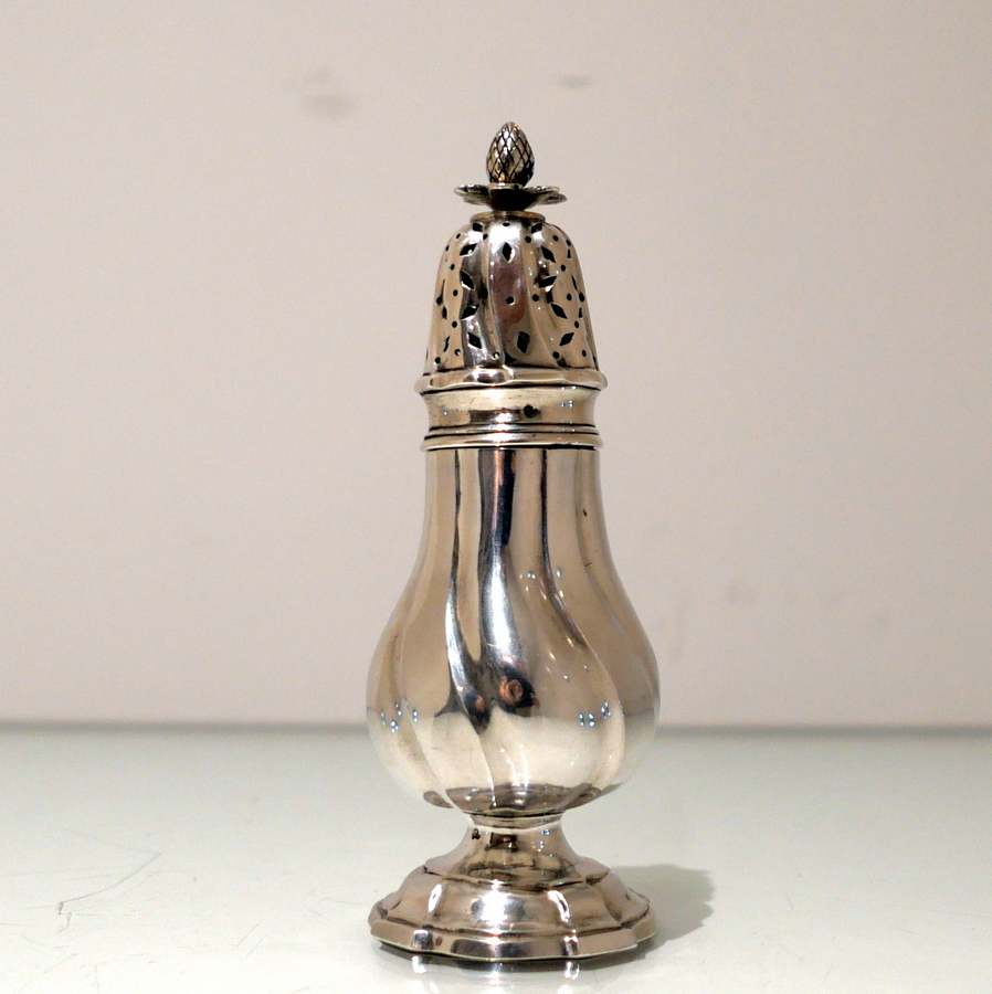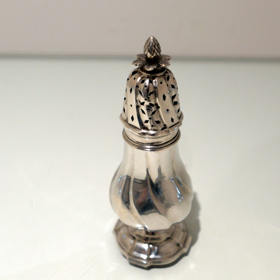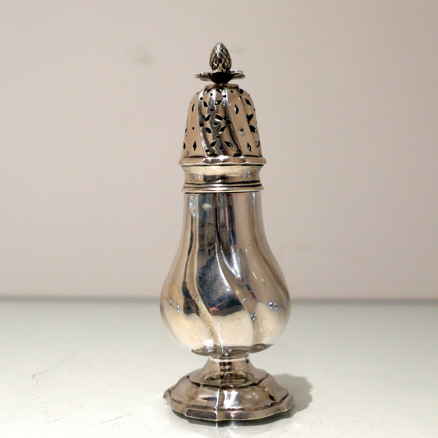 A stylish and highly collectable 18th century cast silver Dutch made sugar caster designed with an elegant spiral fluted body. Â The detachable ‘sleeve’ fitted lid is mounted with a sweet looking acorn style finial.