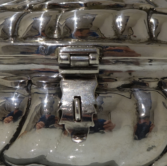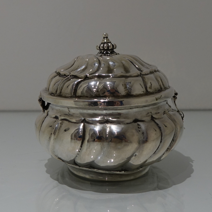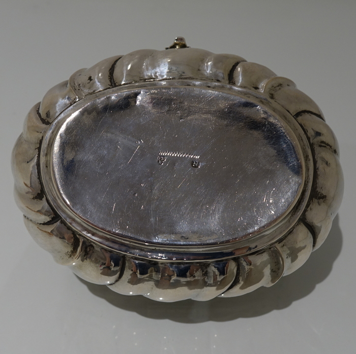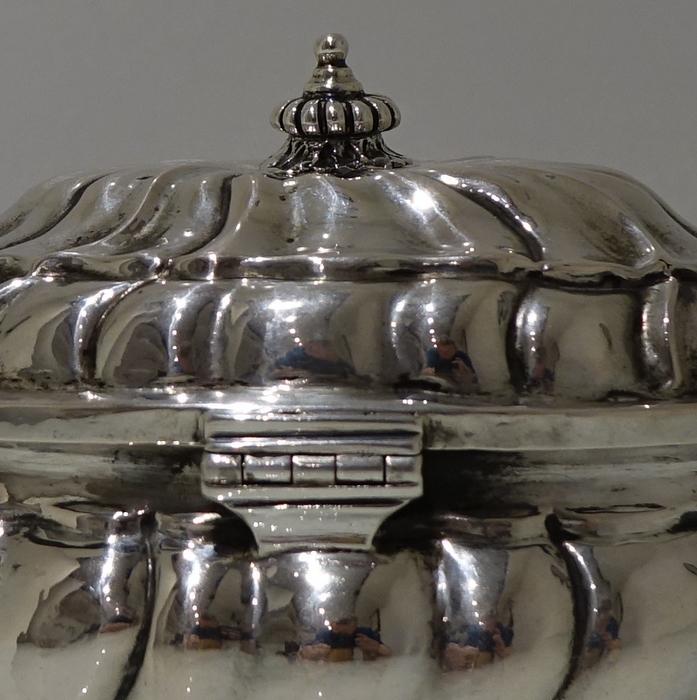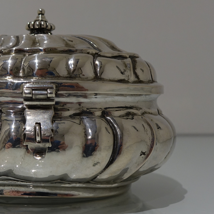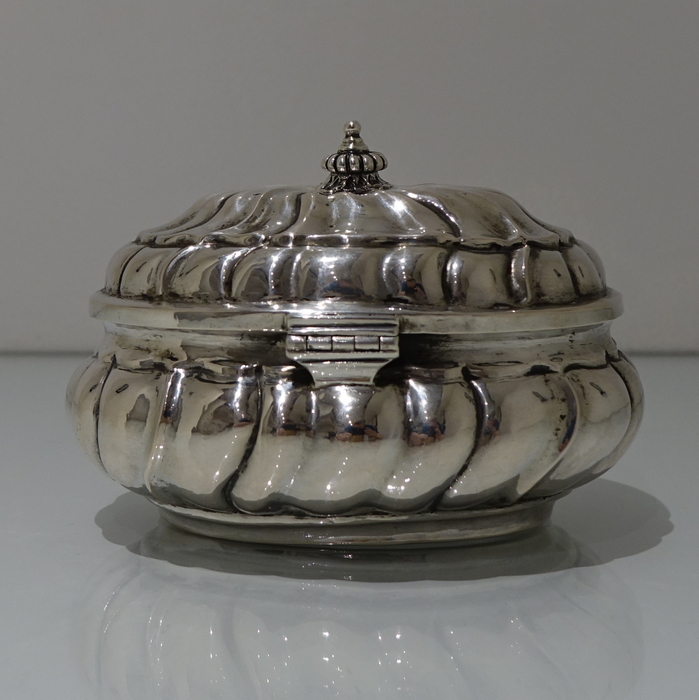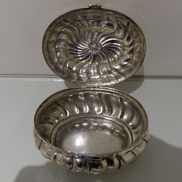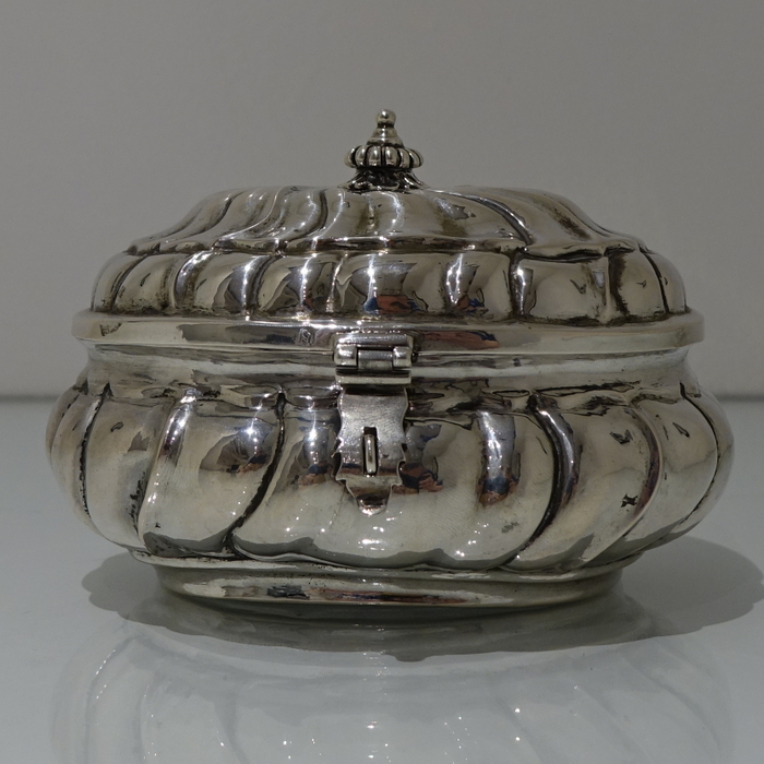 A highly collectable 18th century European silver oval box with elegant spiral fluting for decoration throughout. Â The centre front has a fixed lock and hinged clasp. Â The lid of the box is additionally hinged and crowned with a stunning acorn designed finial.
