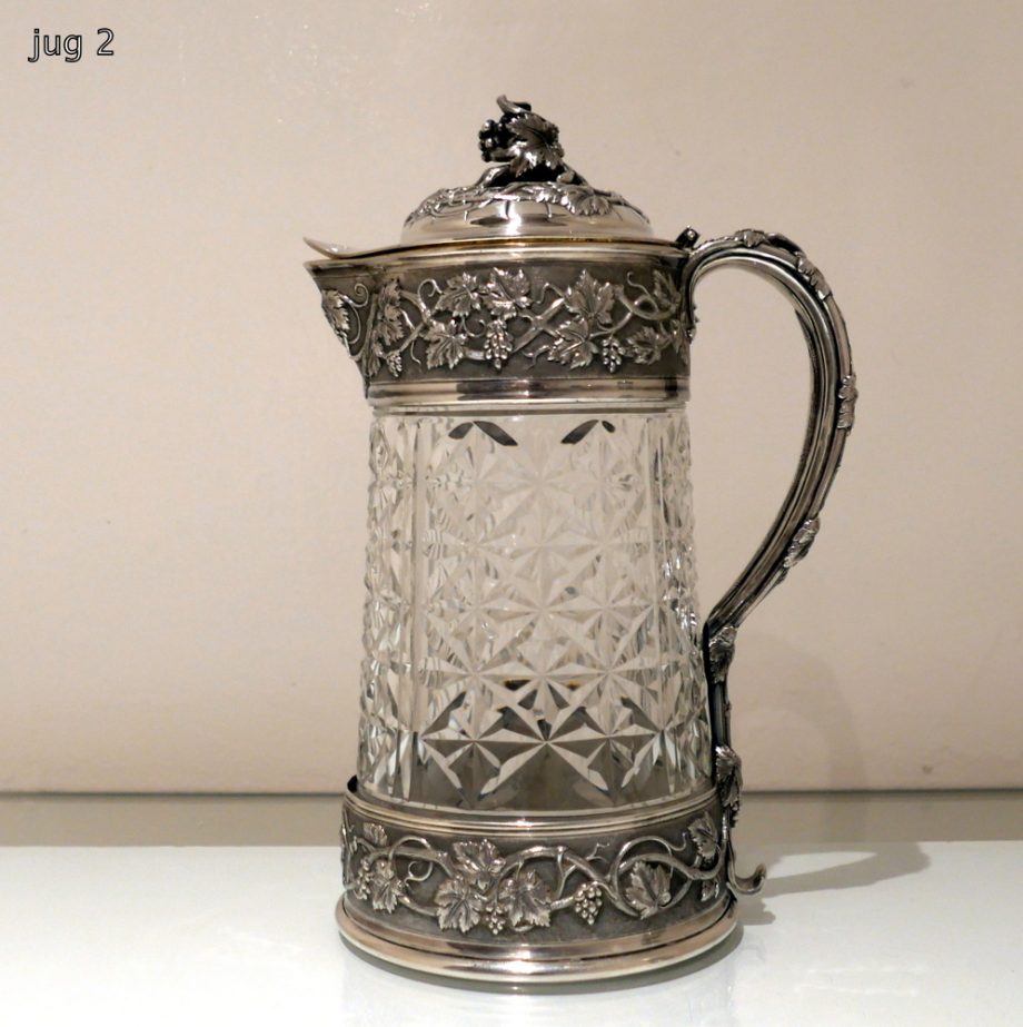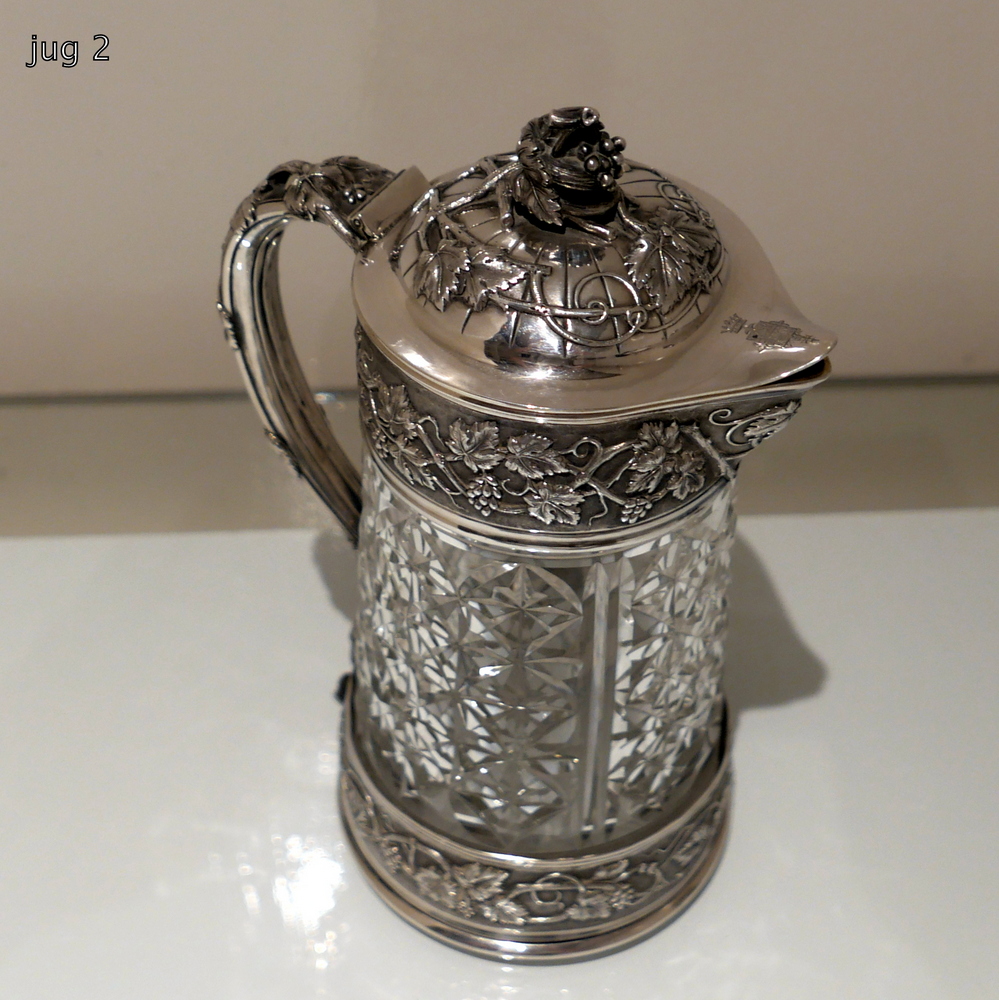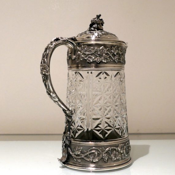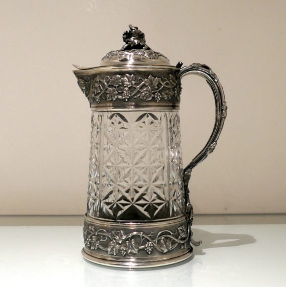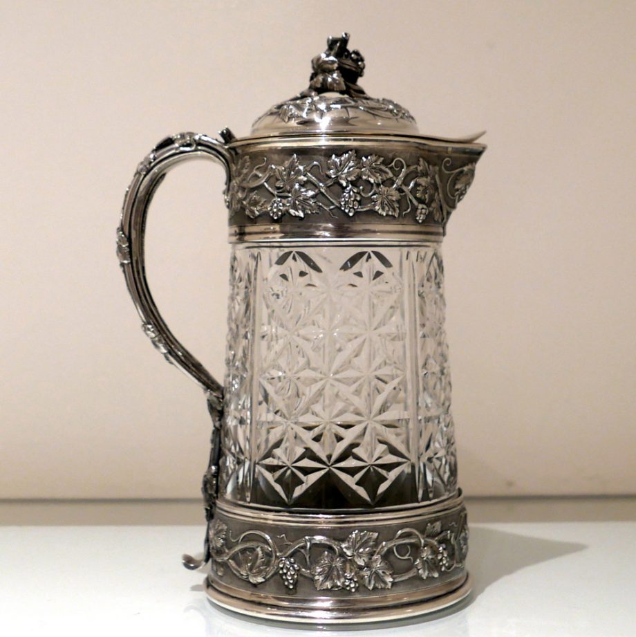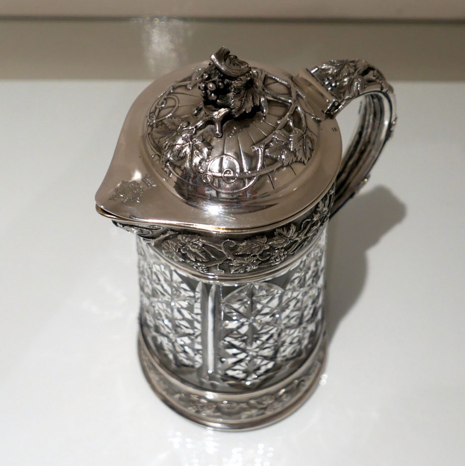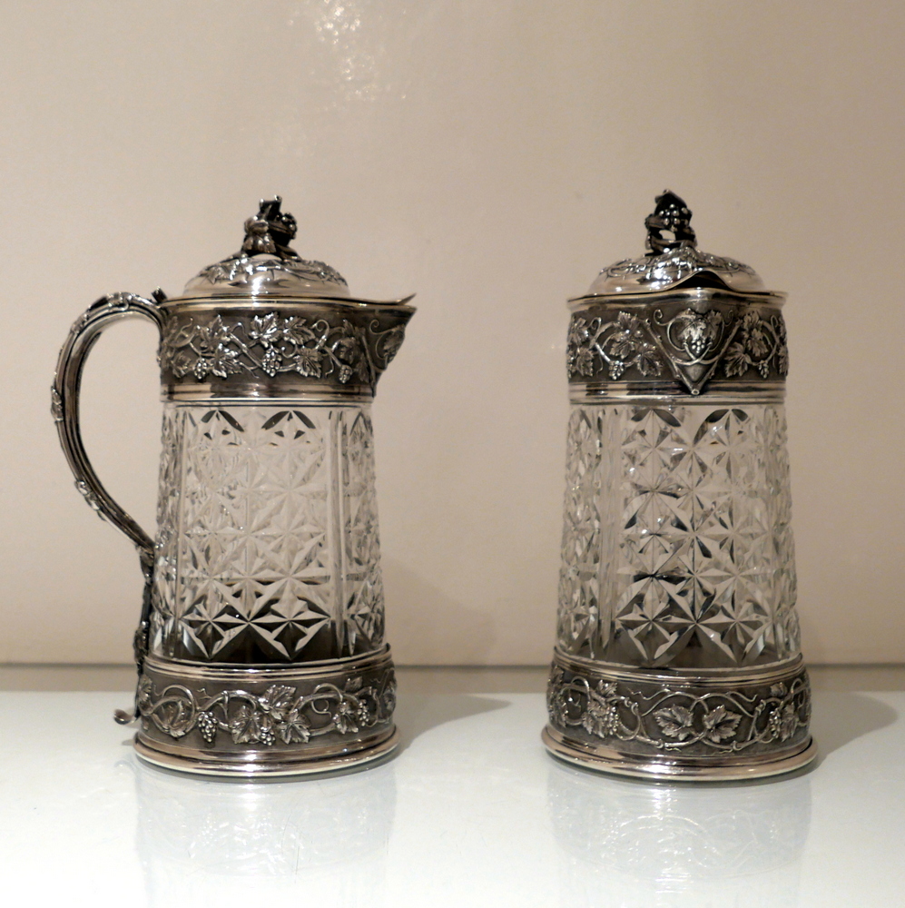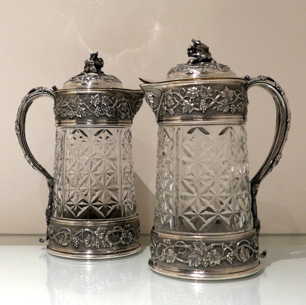 A large and very impressive pair of “Odiot” silver and crystal claret jugs handsomely decorated with grape and vine designed mounts and bases. Â The central glass bowls have decorative star cut walls. Â The lids are hinged and have elegant contemporary armorials engraved on them for importance.