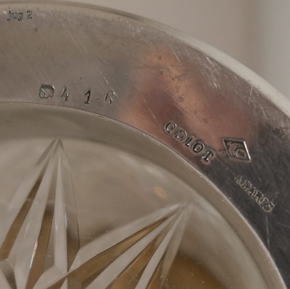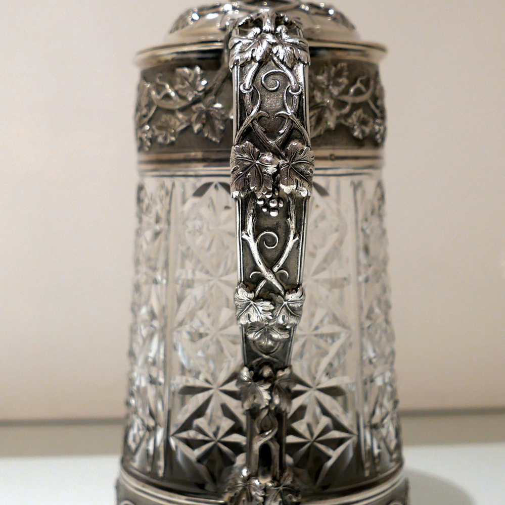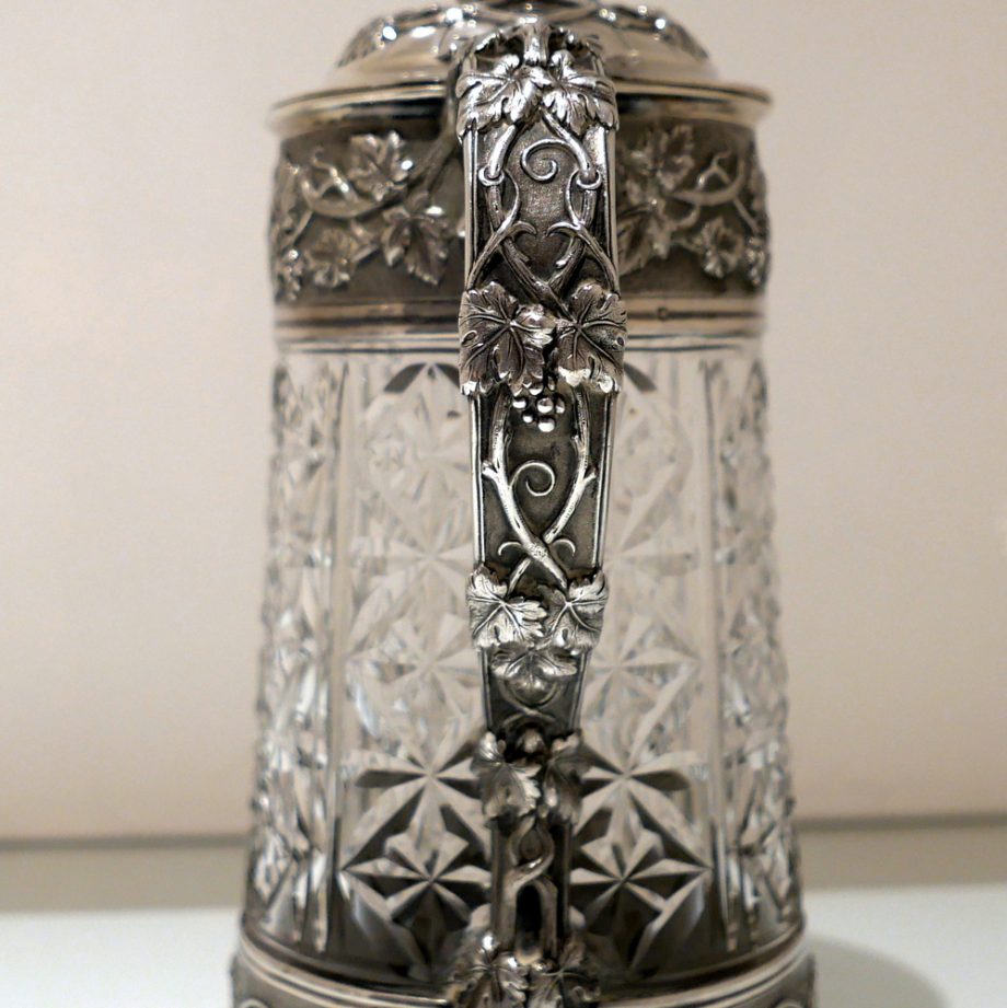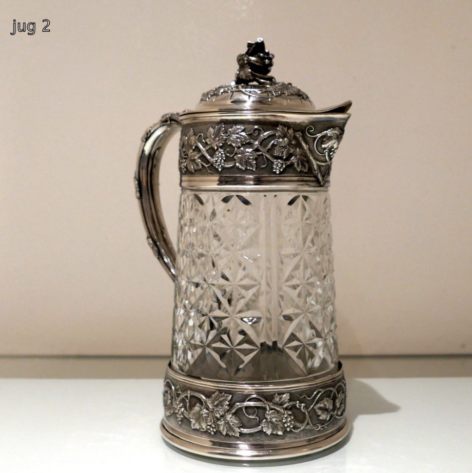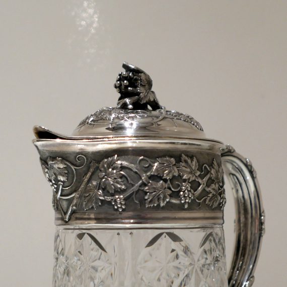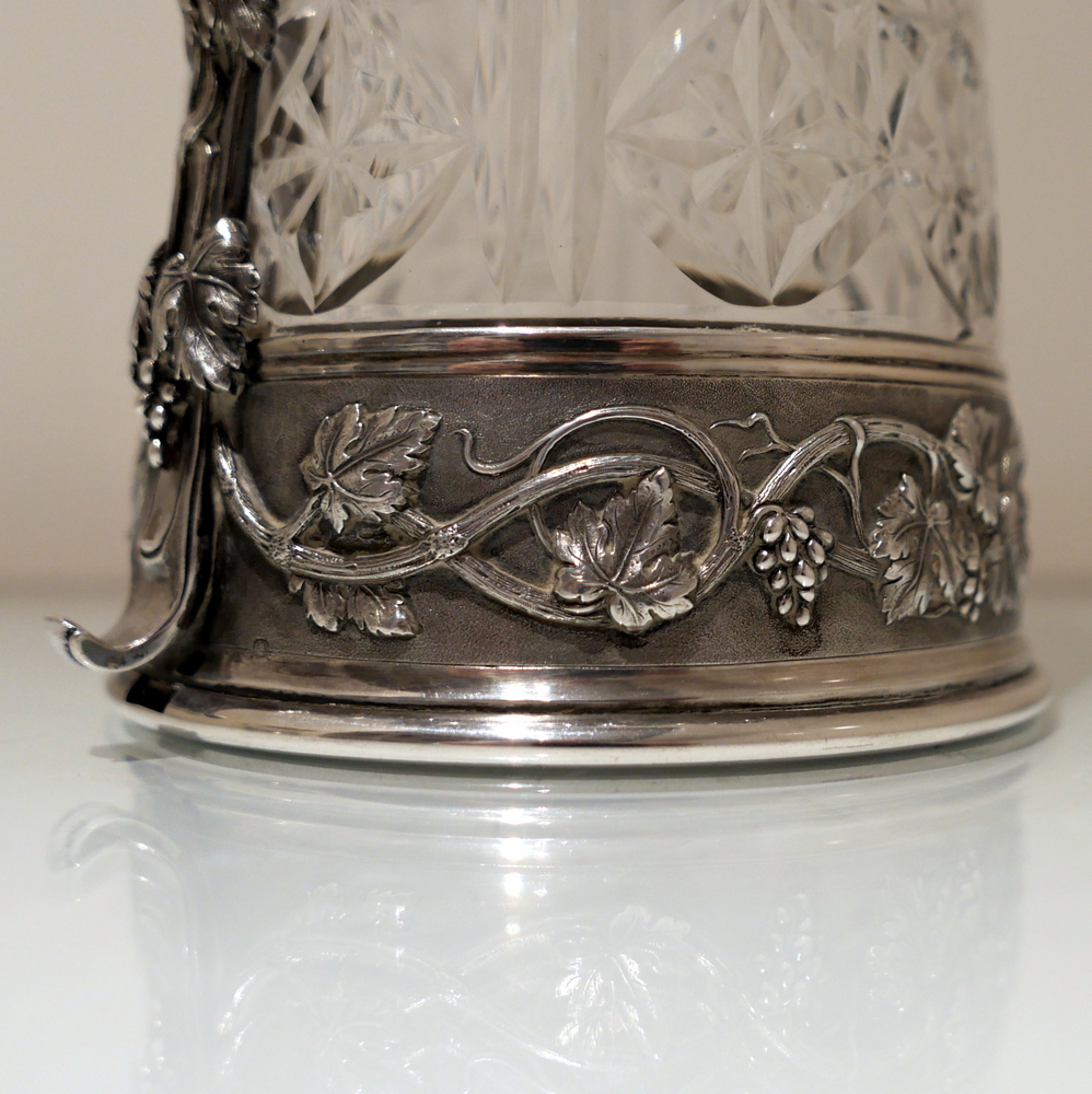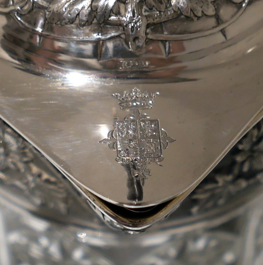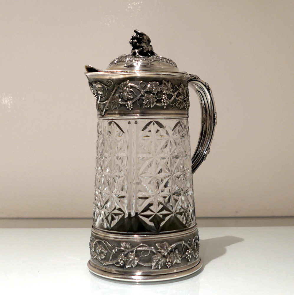 A large and very impressive pair of “Odiot” silver and crystal claret jugs handsomely decorated with grape and vine designed mounts and bases. Â The central glass bowls have decorative star cut walls. Â The lids are hinged and have elegant contemporary armorials engraved on them for importance.
