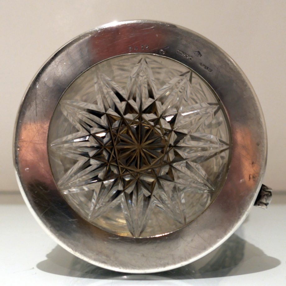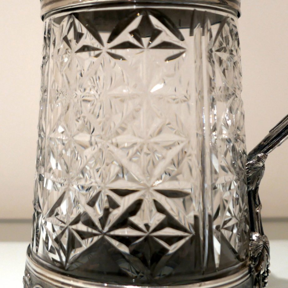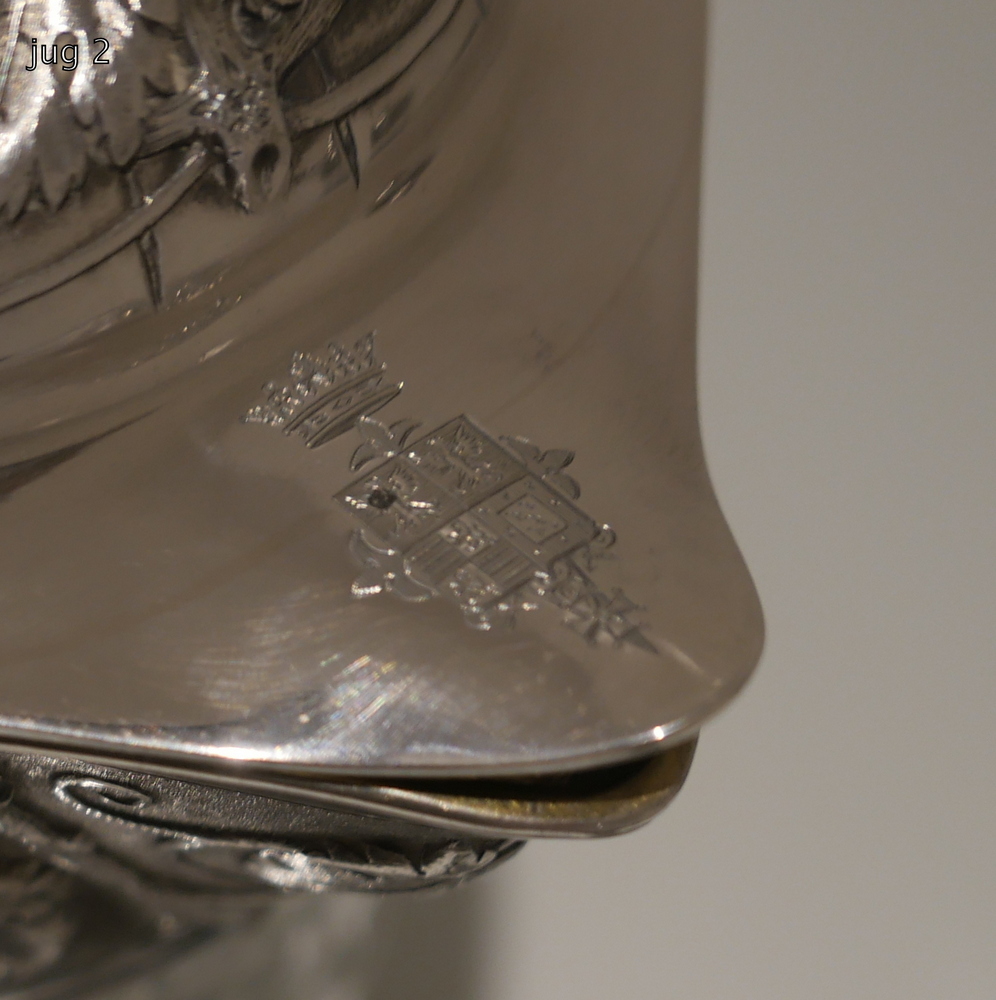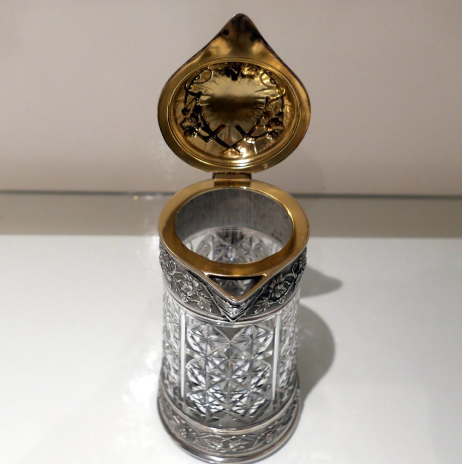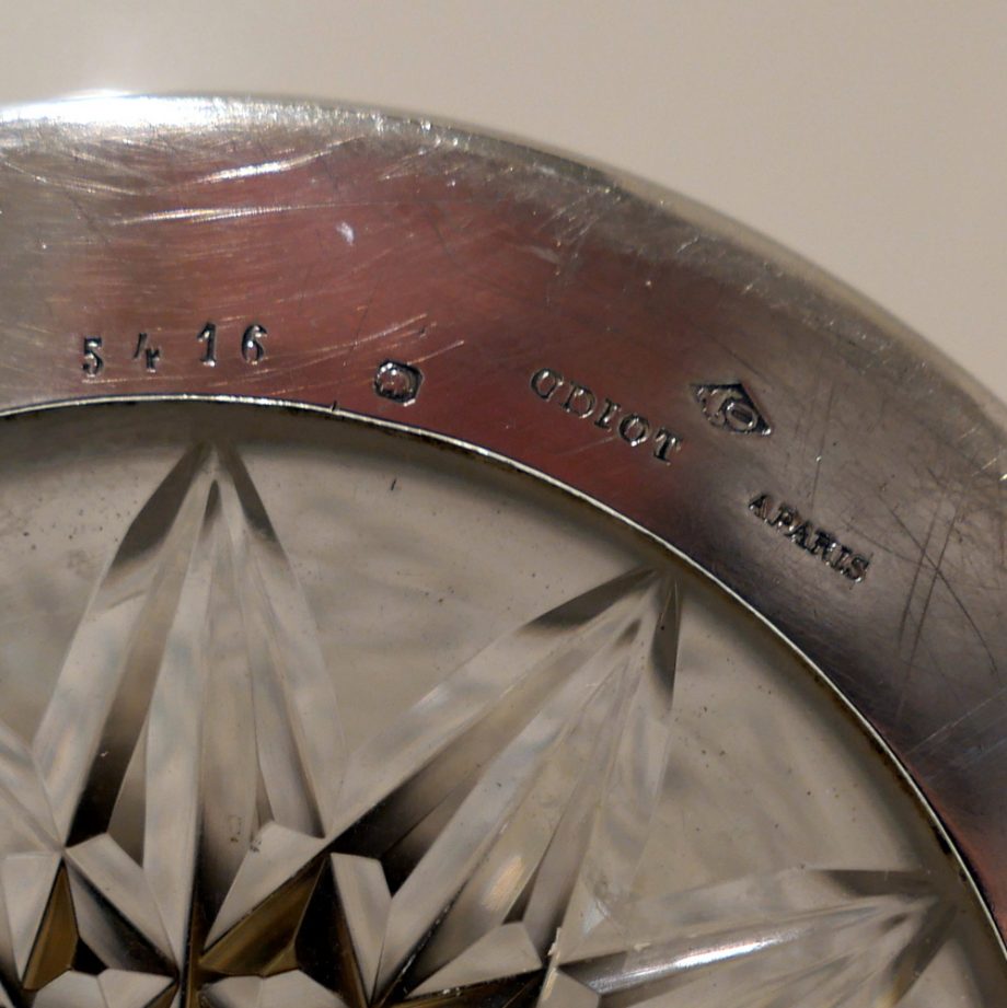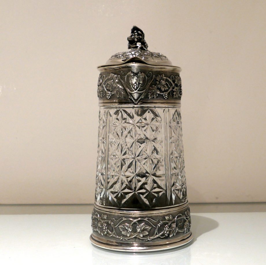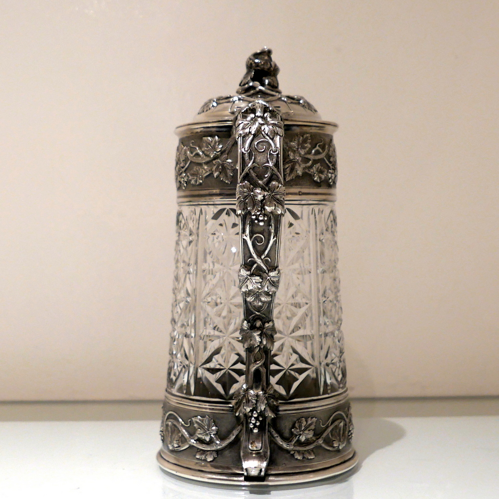 A large and very impressive pair of “Odiot” silver and crystal claret jugs handsomely decorated with grape and vine designed mounts and bases. Â The central glass bowls have decorative star cut walls. Â The lids are hinged and have elegant contemporary armorials engraved on them for importance.