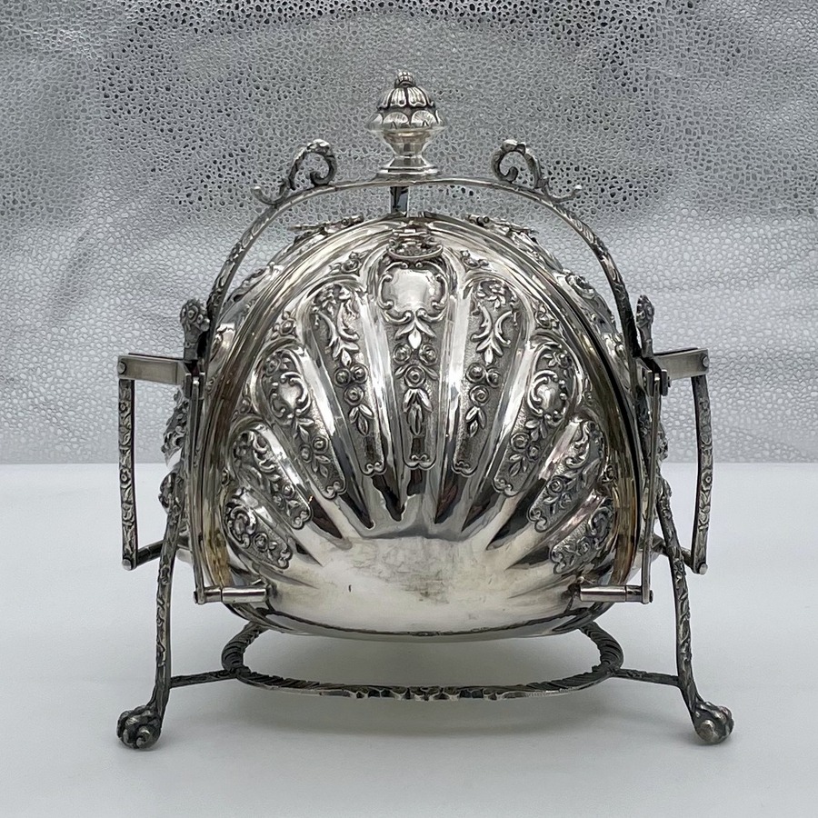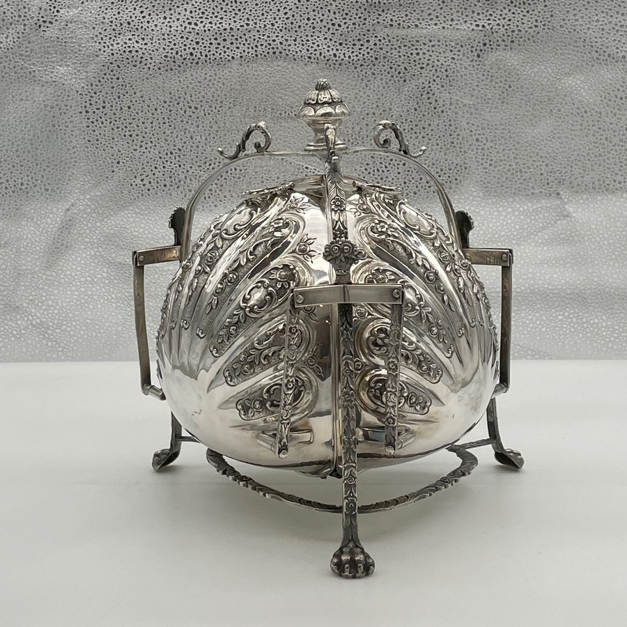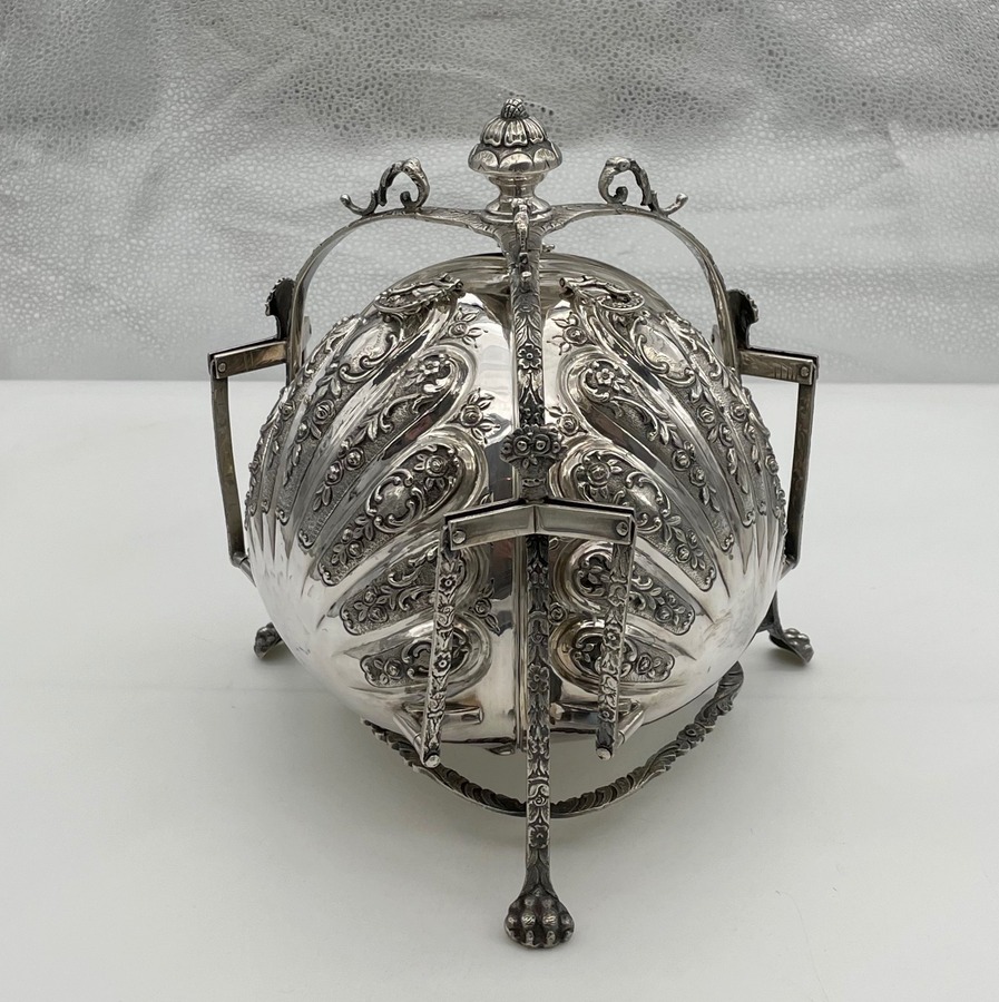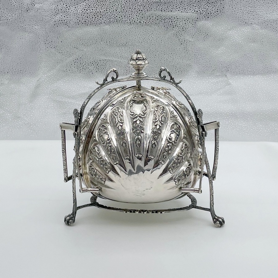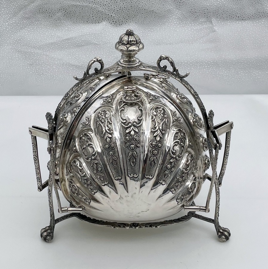 A rare and extremely desirable silver treble folding biscuit box decorated with floral embellishing which is set on a matt background for  decorative visual contrast.  The cast wire frame is set on three delightful claw feet.  The biscuit box has elegant drop ring handles and opens almost like a blooming flower.  The three sections have beautiful flip hinges lids with a spring hook fastener for securing.
