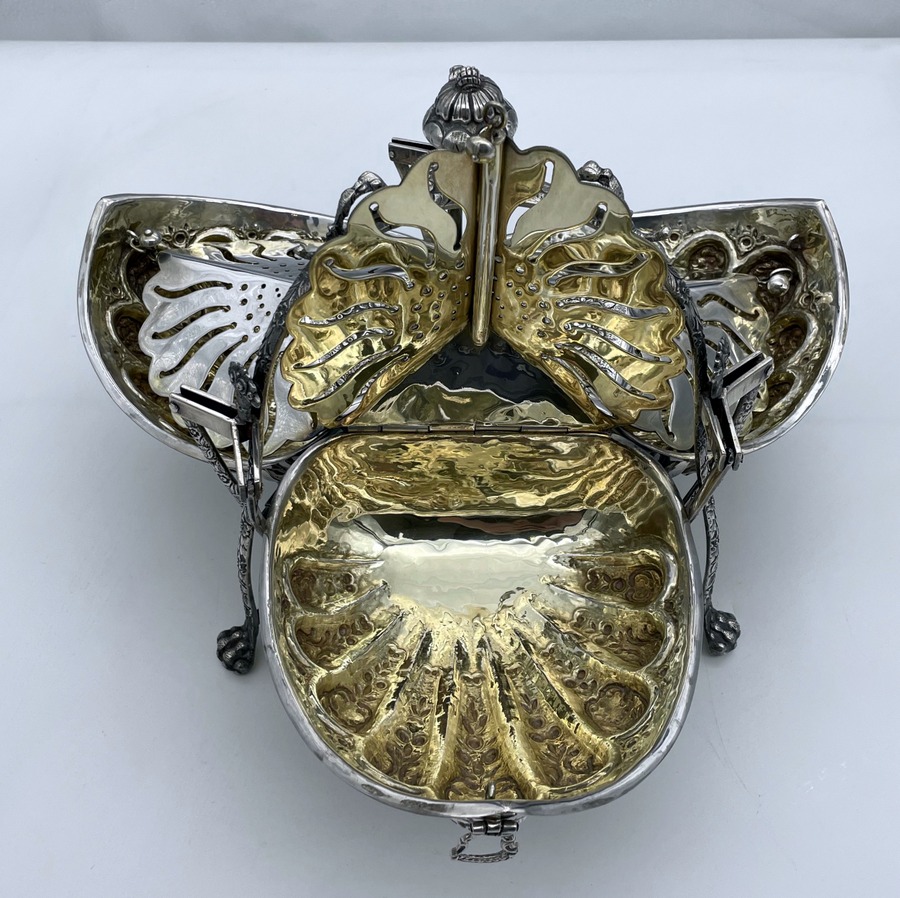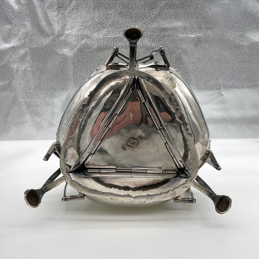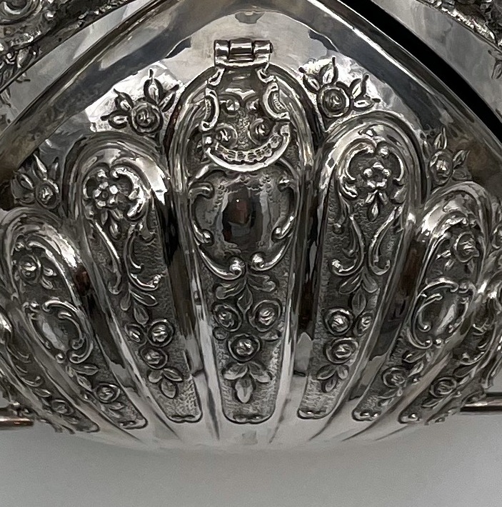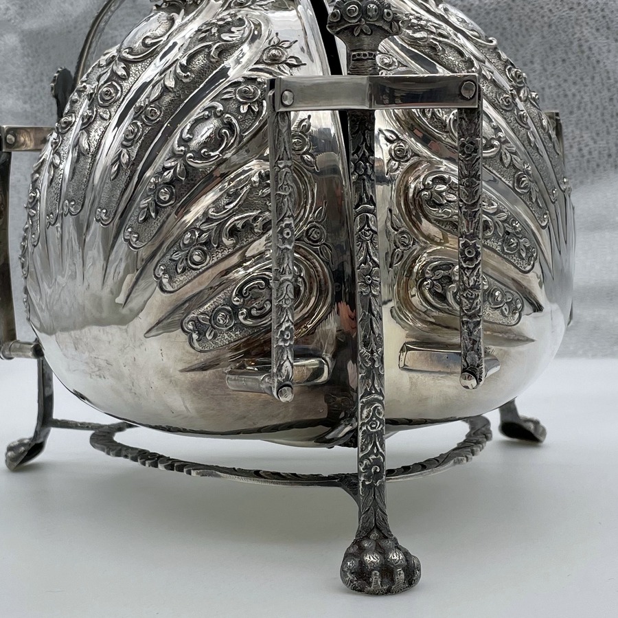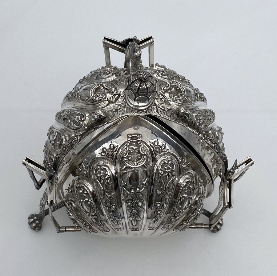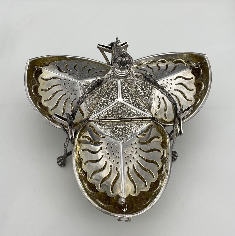 A rare and extremely desirable silver treble folding biscuit box decorated with floral embellishing which is set on a matt background for  decorative visual contrast.  The cast wire frame is set on three delightful claw feet.  The biscuit box has elegant drop ring handles and opens almost like a blooming flower.  The three sections have beautiful flip hinges lids with a spring hook fastener for securing.