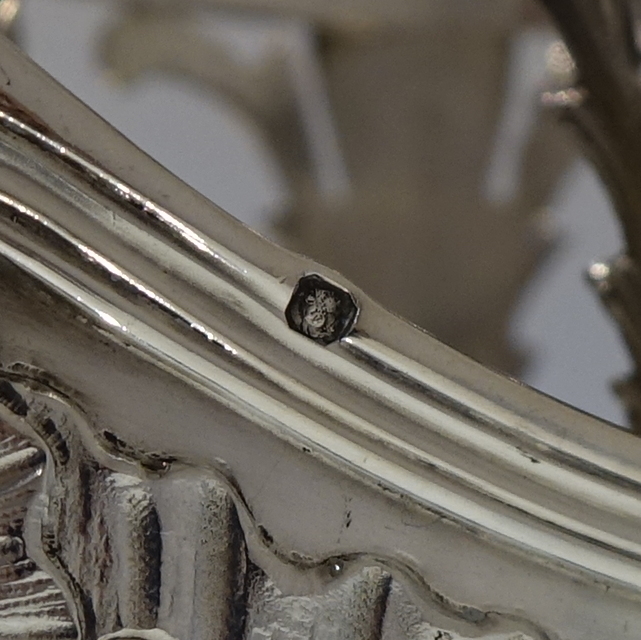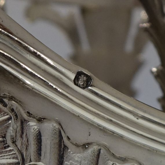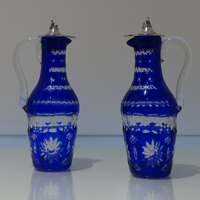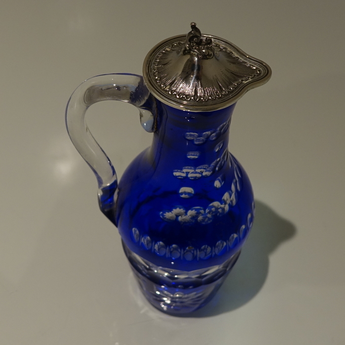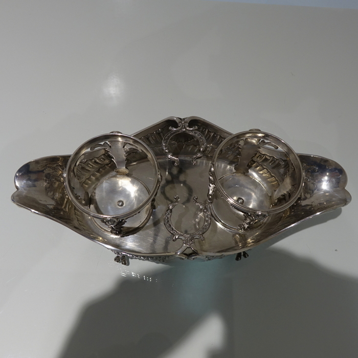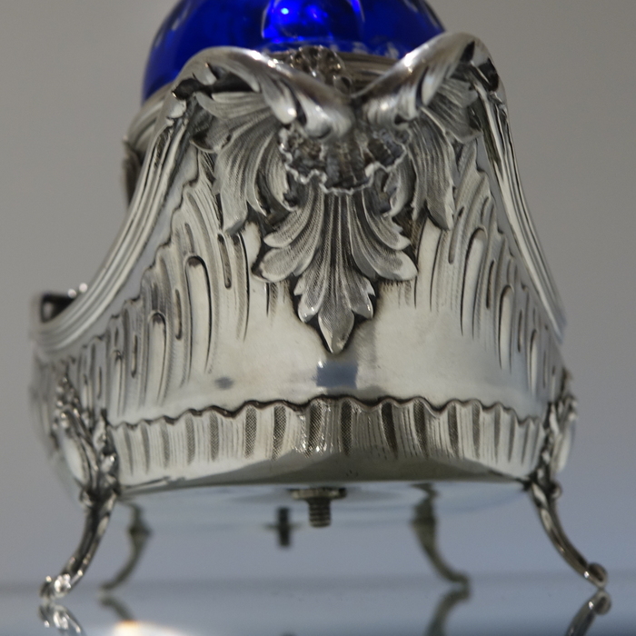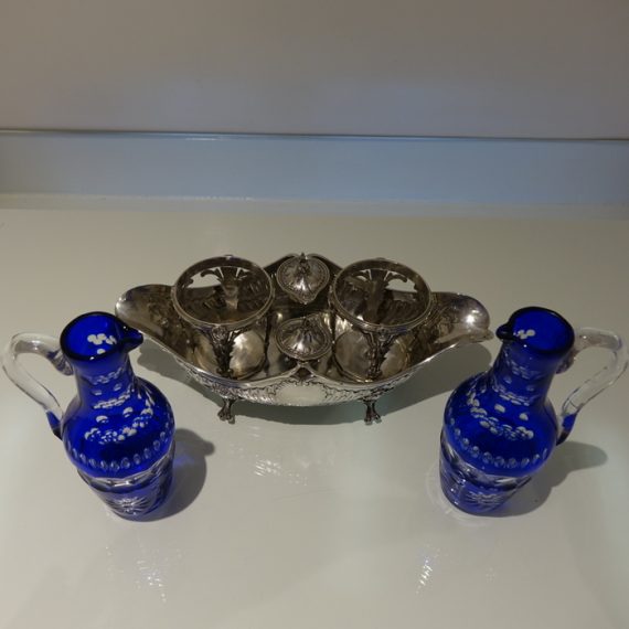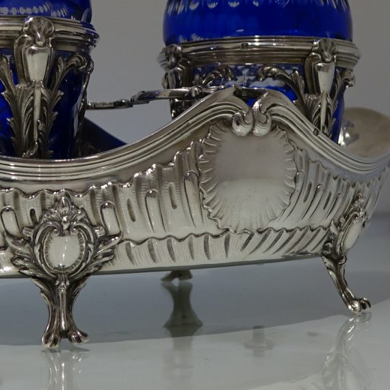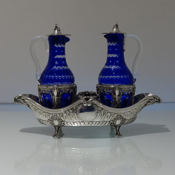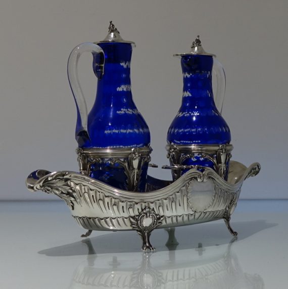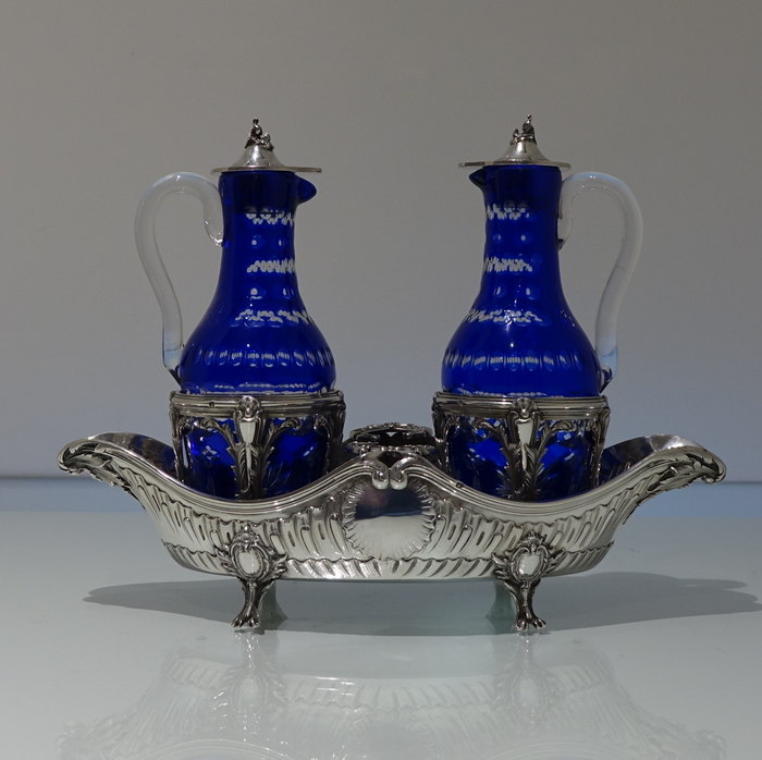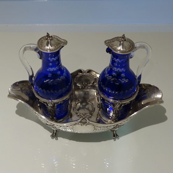 A stylish 19th century french oil and vinegar shaped oval in design sitting on four ornate feet. Â The body is elegantly decorated and has a beautiful double cartouche. Â The handles are exceptional acanthus leaf workmanship and the blue glass bottles have etching for overall highlights.
