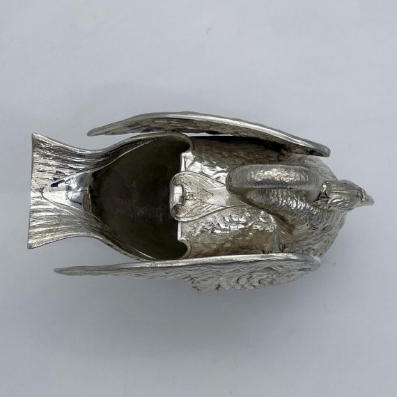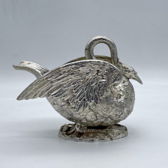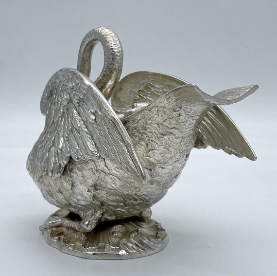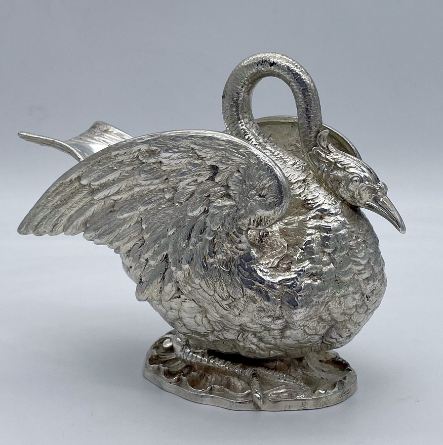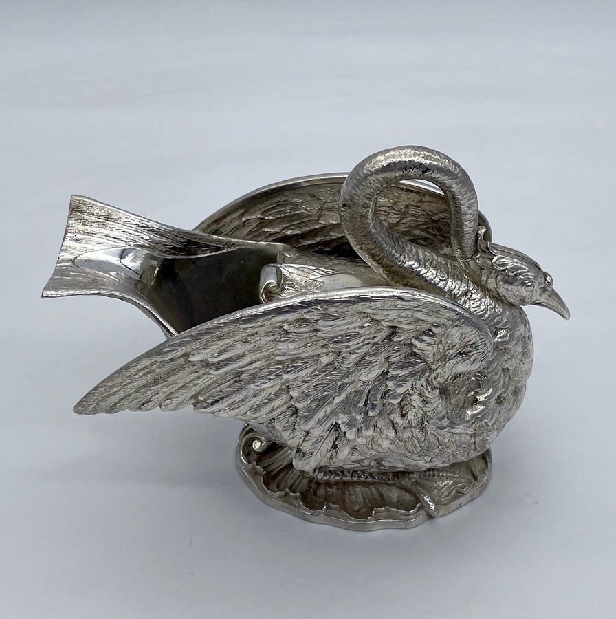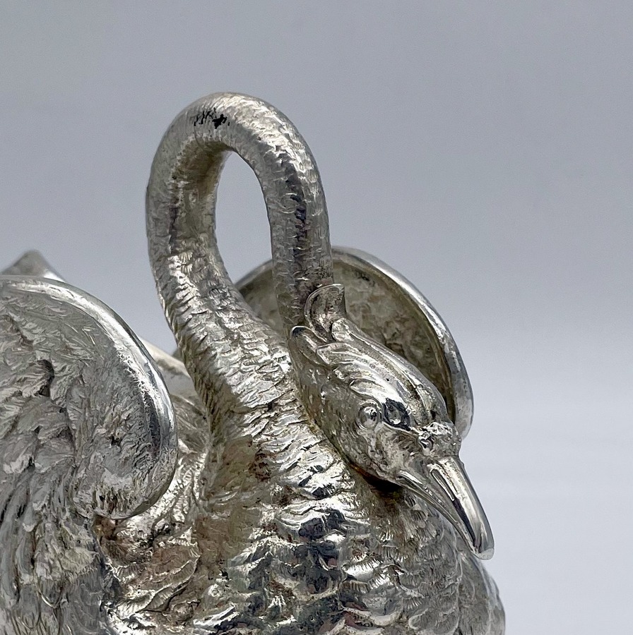 Wonderful large cast swan themed silverplate spoon warmer decorated with beautifully chased feather plumages and a delightful scrolling swan necked handle.