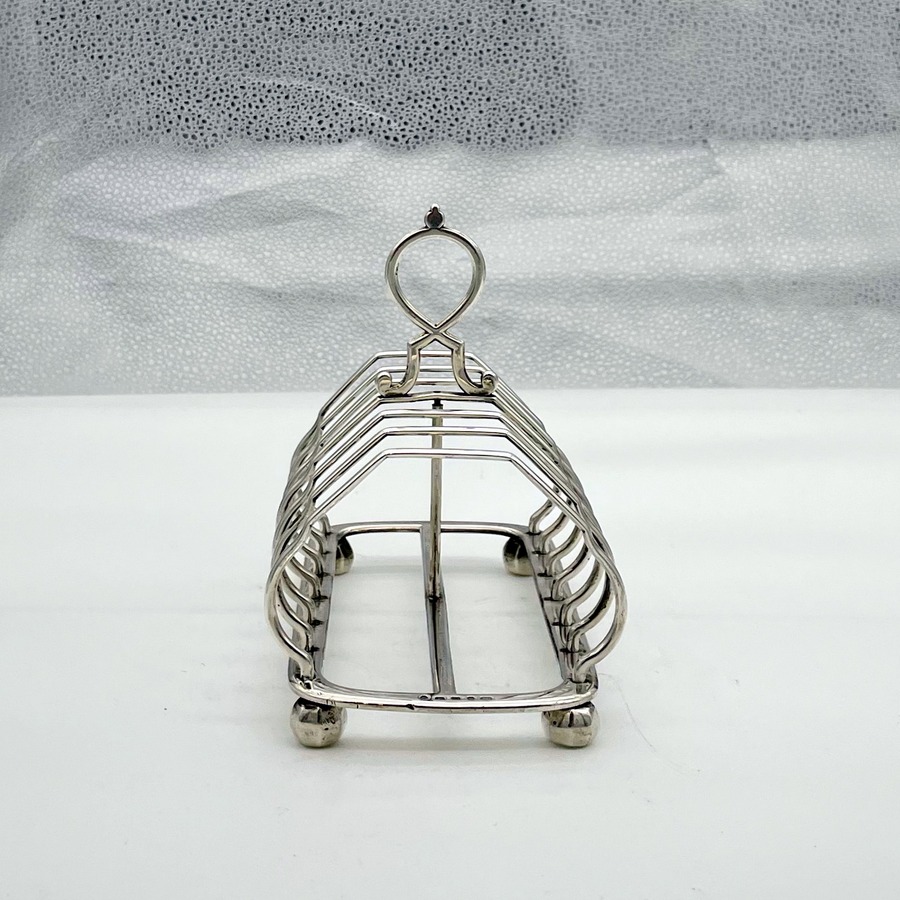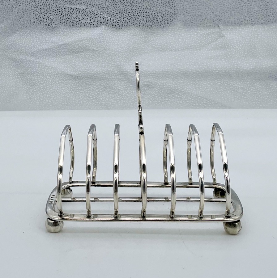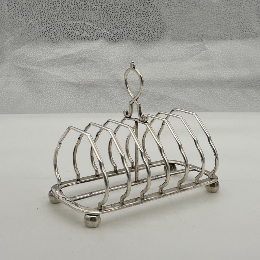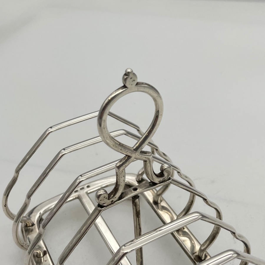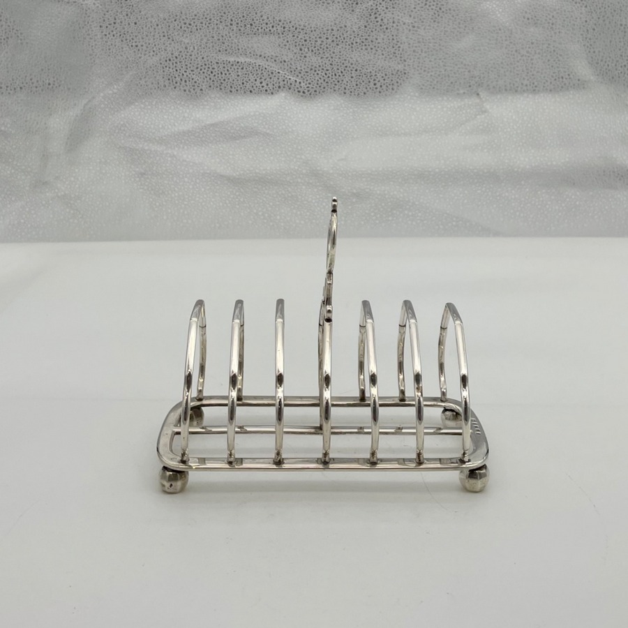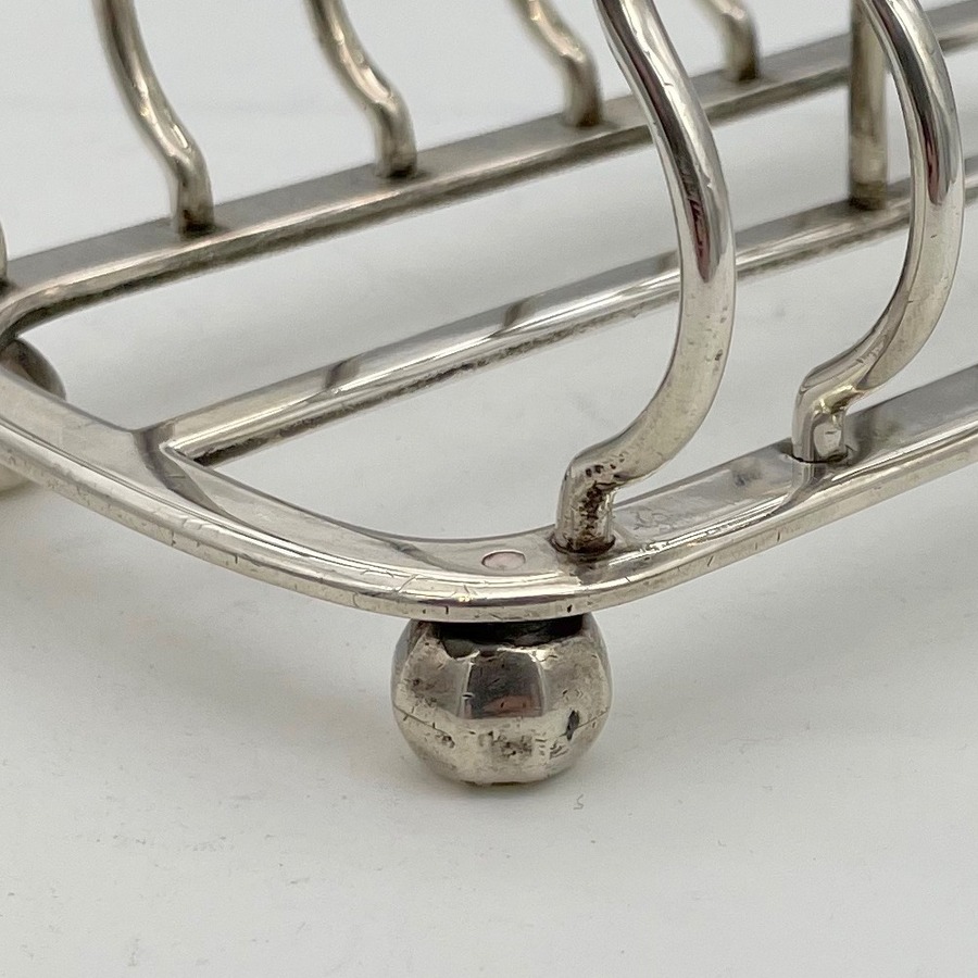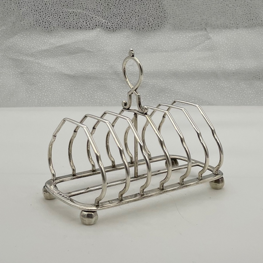 A sweet Victorian silver toast rack designed with a curved cornered rectangular frame and a stylish scrolling themed handle. Â The toast rack sits on four elegant ball feet.