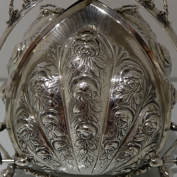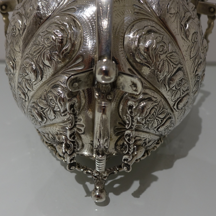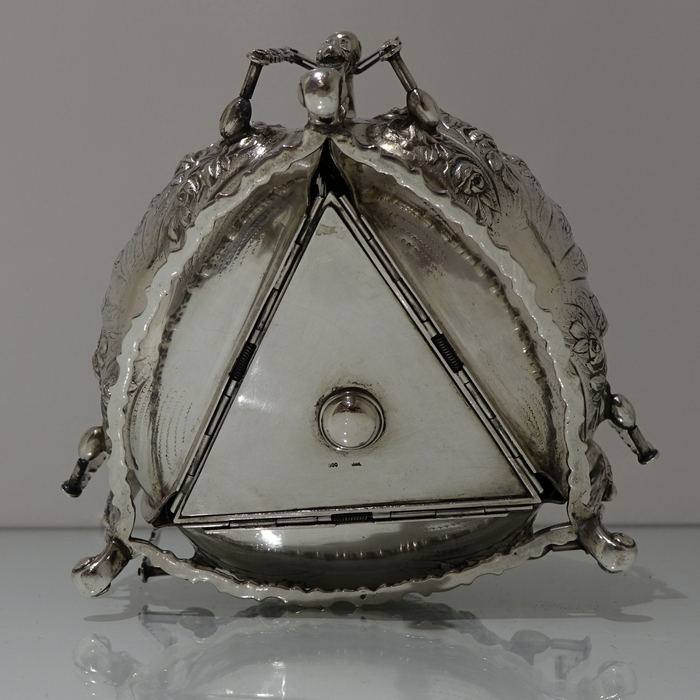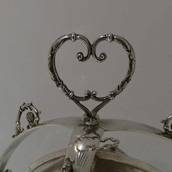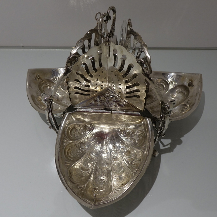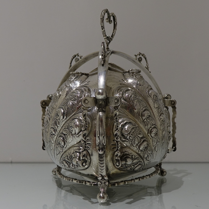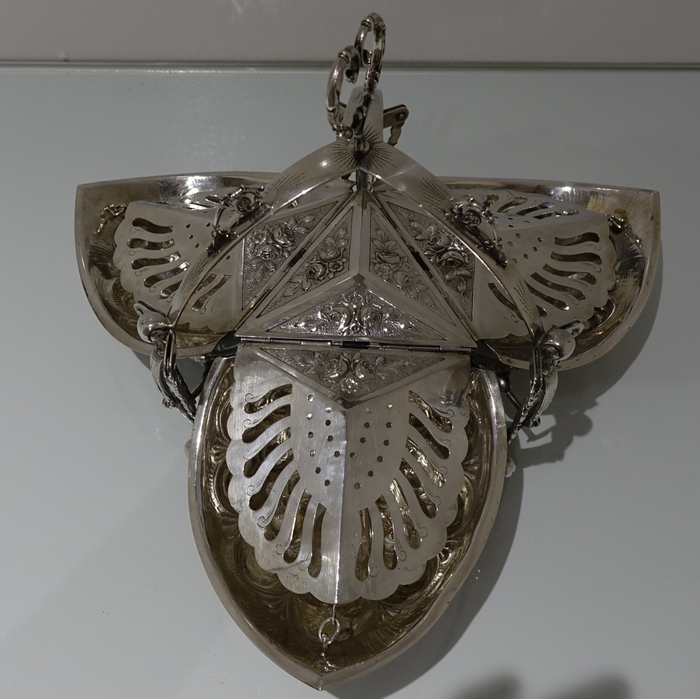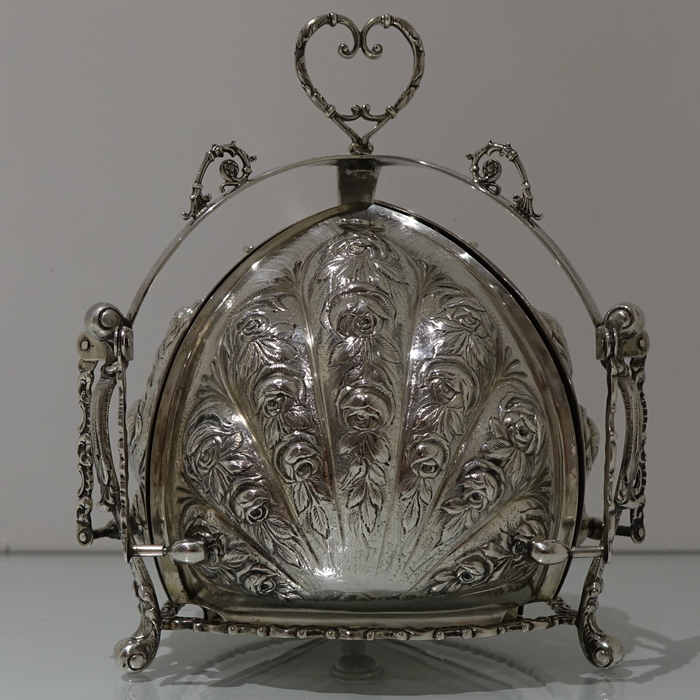 A very rare and extremely ornate triple compartment folding biscuit box floral embossed throughout with inner spring loaded dividers. Â The box sits on three stylish feet and is crowned with a heart shaped handle.