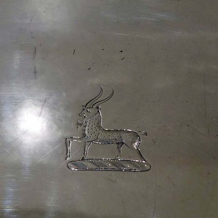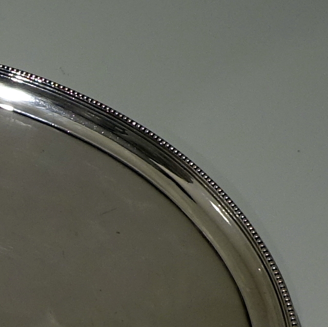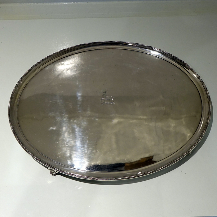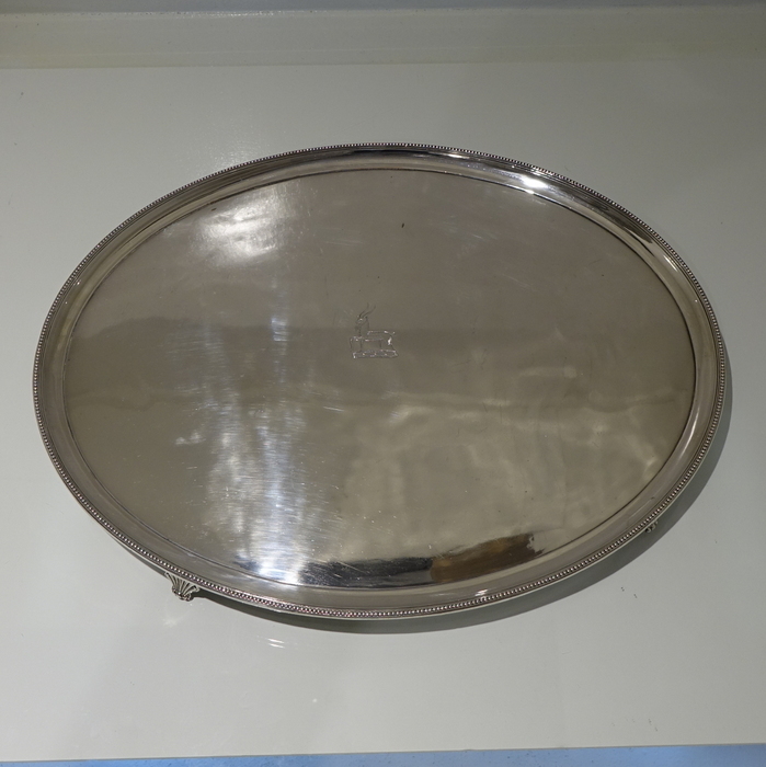 A very elegant large oval bead border salver sitting on four ornate feet. Â There is a stylish contemporary crest for importance.