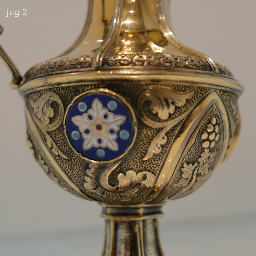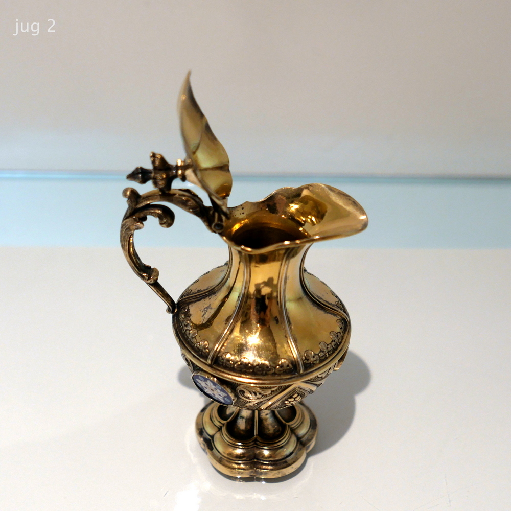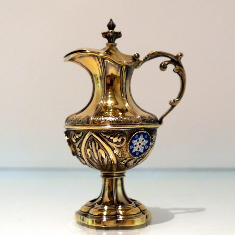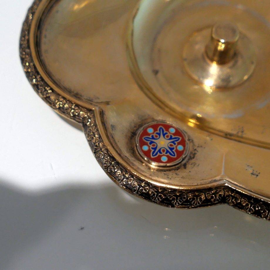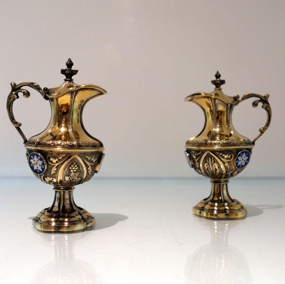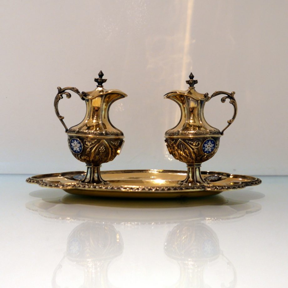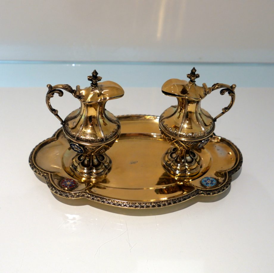 A delightful silver-gilt French altar set decorated with beautiful inset circular enamelled plaques which is then set against a matt background with foliate swirls for decorative contrast.