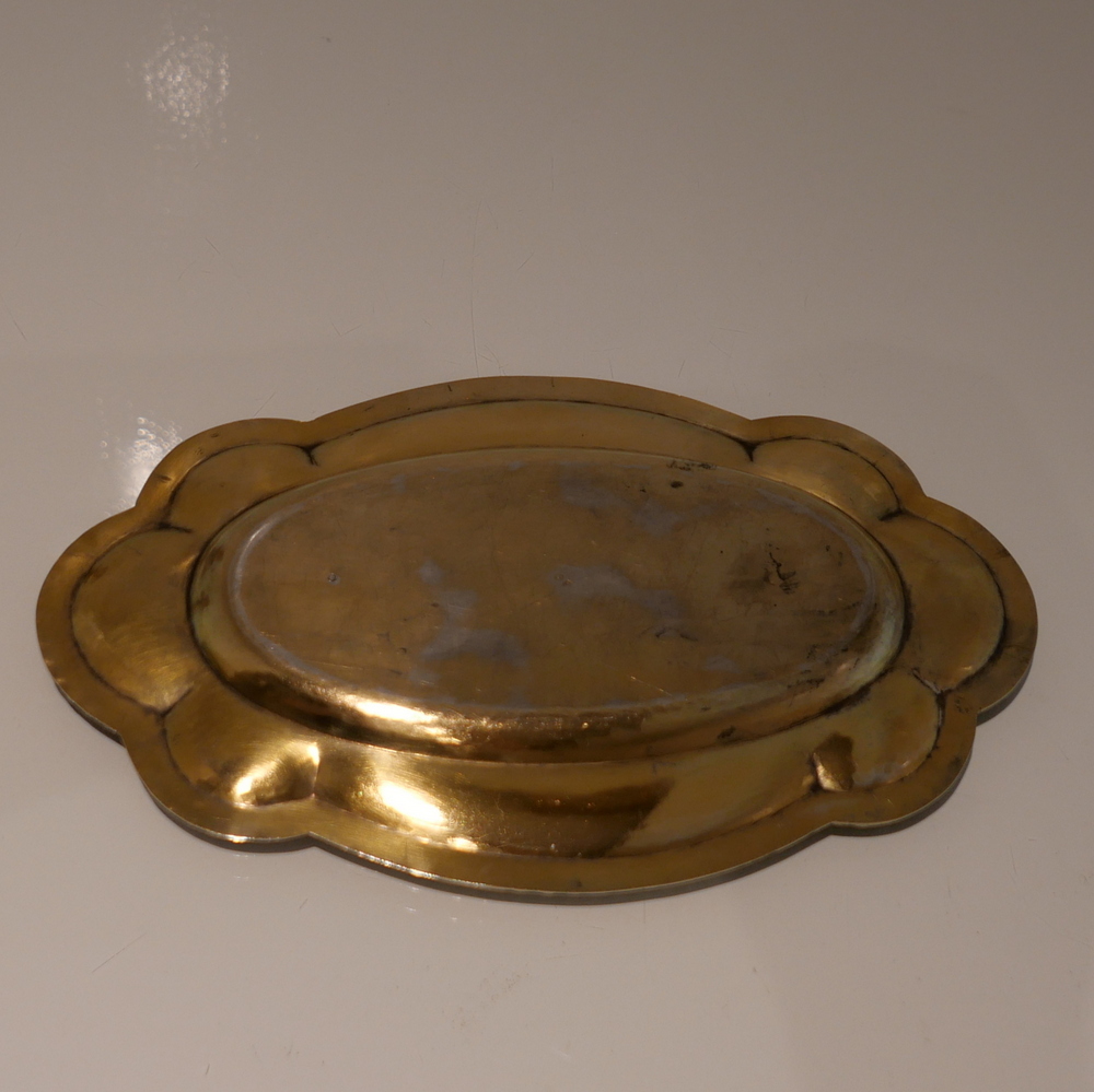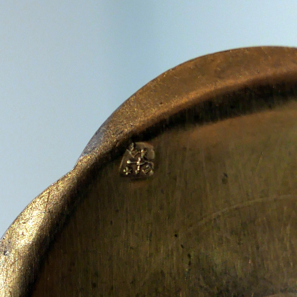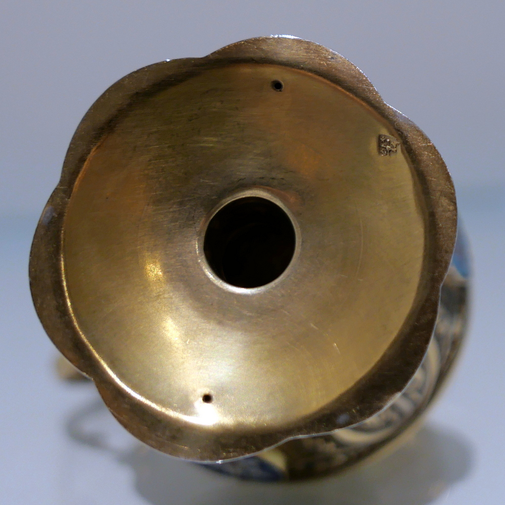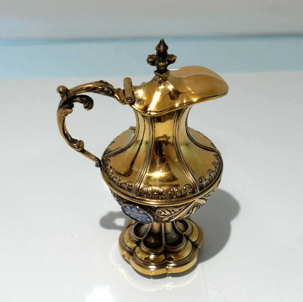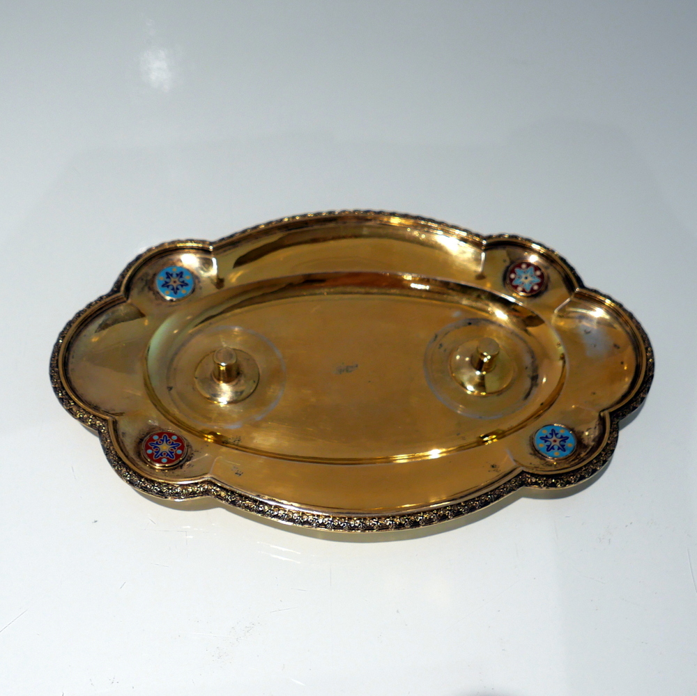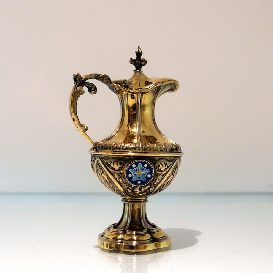 A delightful silver-gilt French altar set decorated with beautiful inset circular enamelled plaques which is then set against a matt background with foliate swirls for decorative contrast.