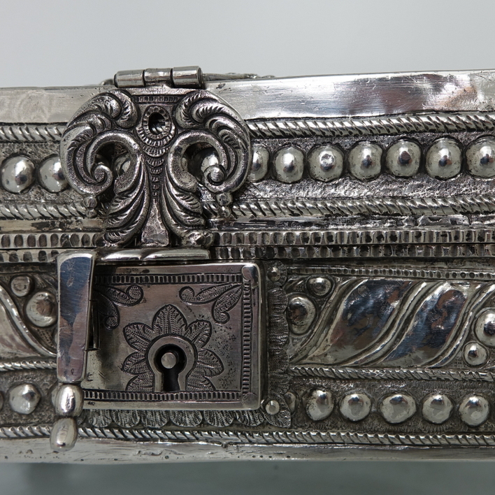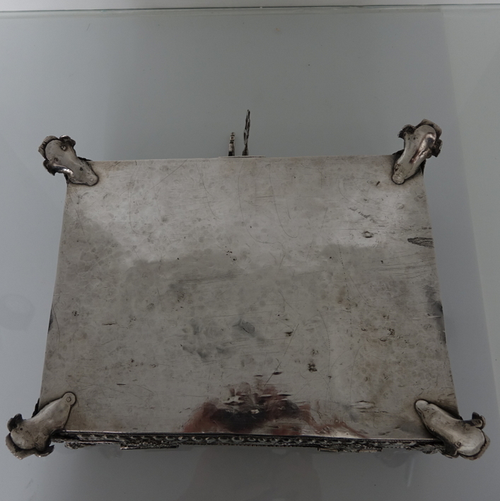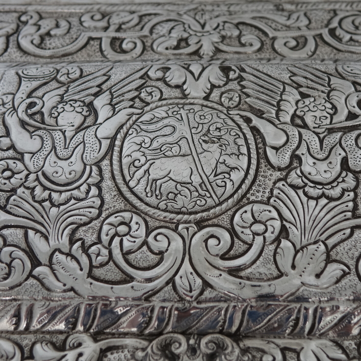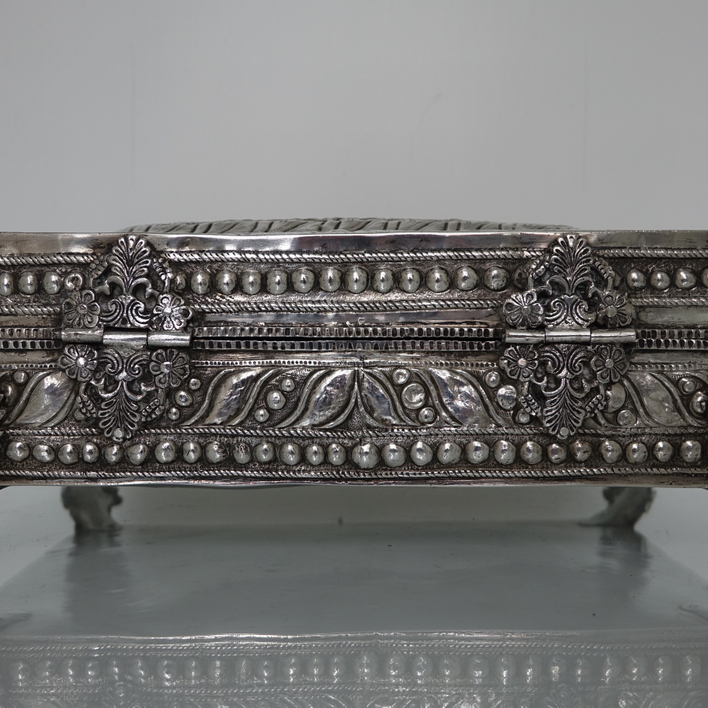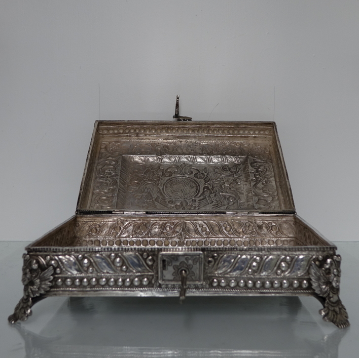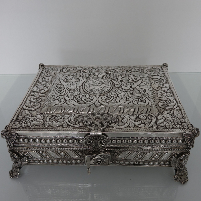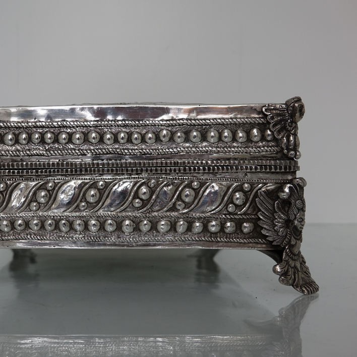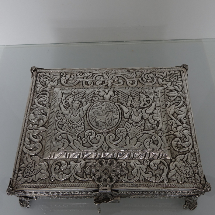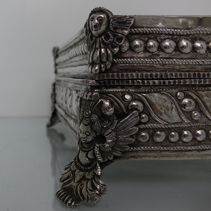 A very large ornate jewellery casket, rectangular in design. The casket has been hand decorated with floral chasing sitting on a matt finished underlay throughout. The rim of the lid and the base of the casket have large, hand-punched, bead borders for highlights. The box sits on four Inca-style, winged figural feet. The casket has a very beautiful designed lock and key for even more decorative style.