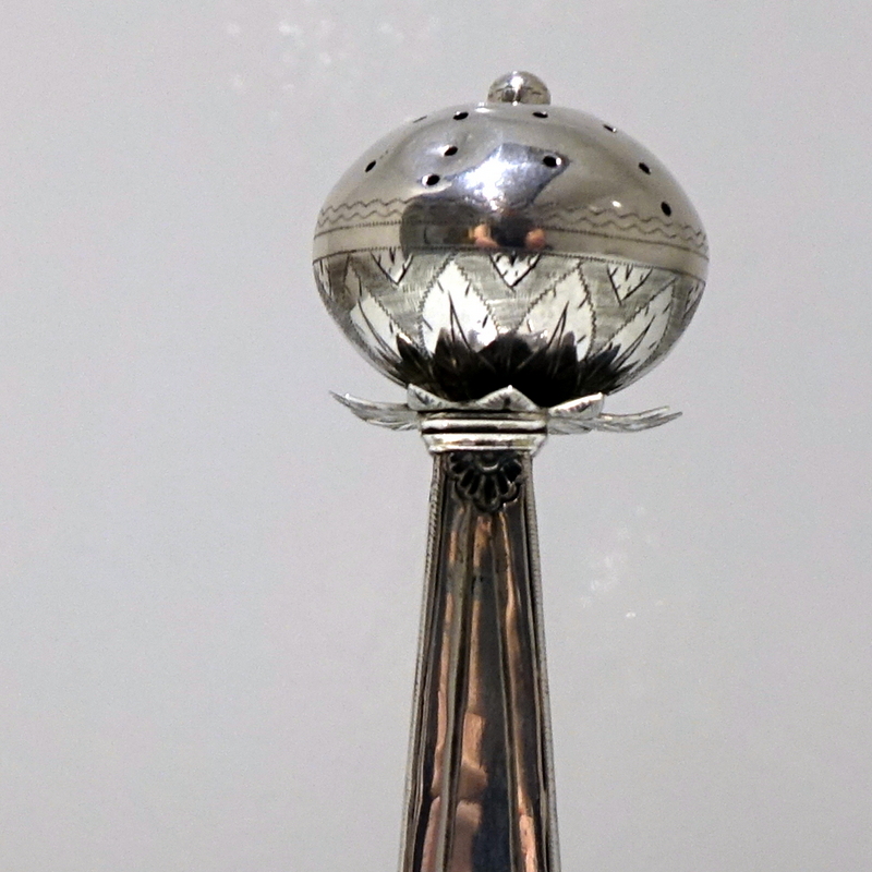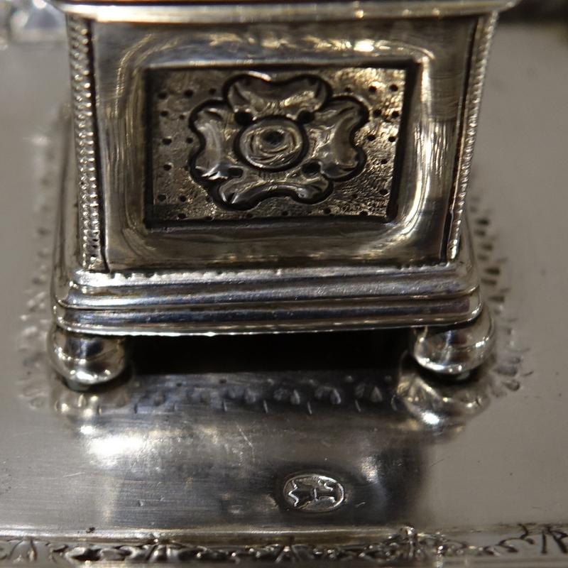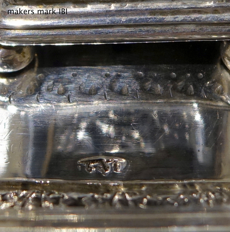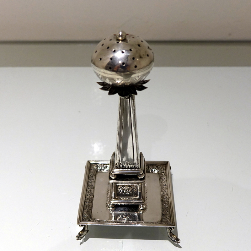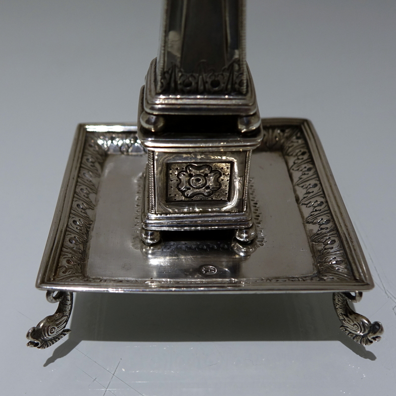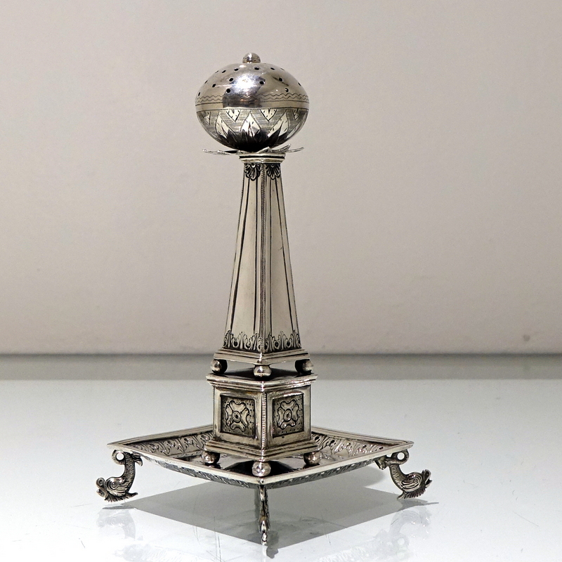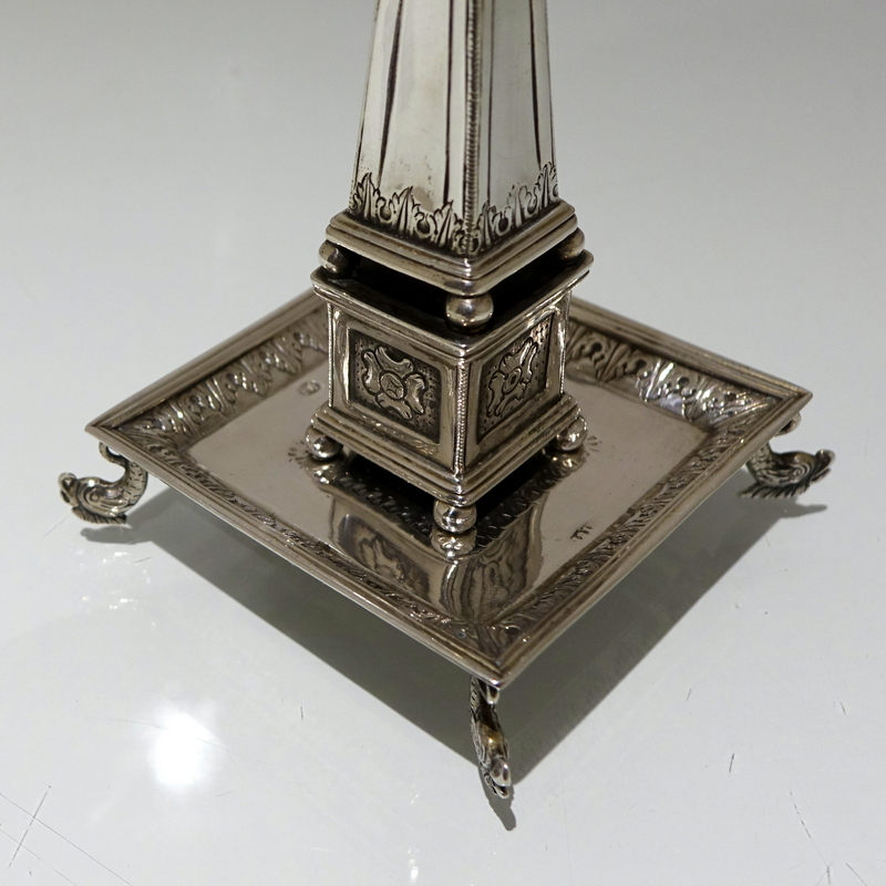 A beautiful early 19th century Portuguese silver tooth pick holder decorated with ornate outer borders to the inner base which then sits on four sea serpent themed feet. Â The tapering three sided stem is mounted on four ball feet and held aloft by a decorative cubed pedestal.