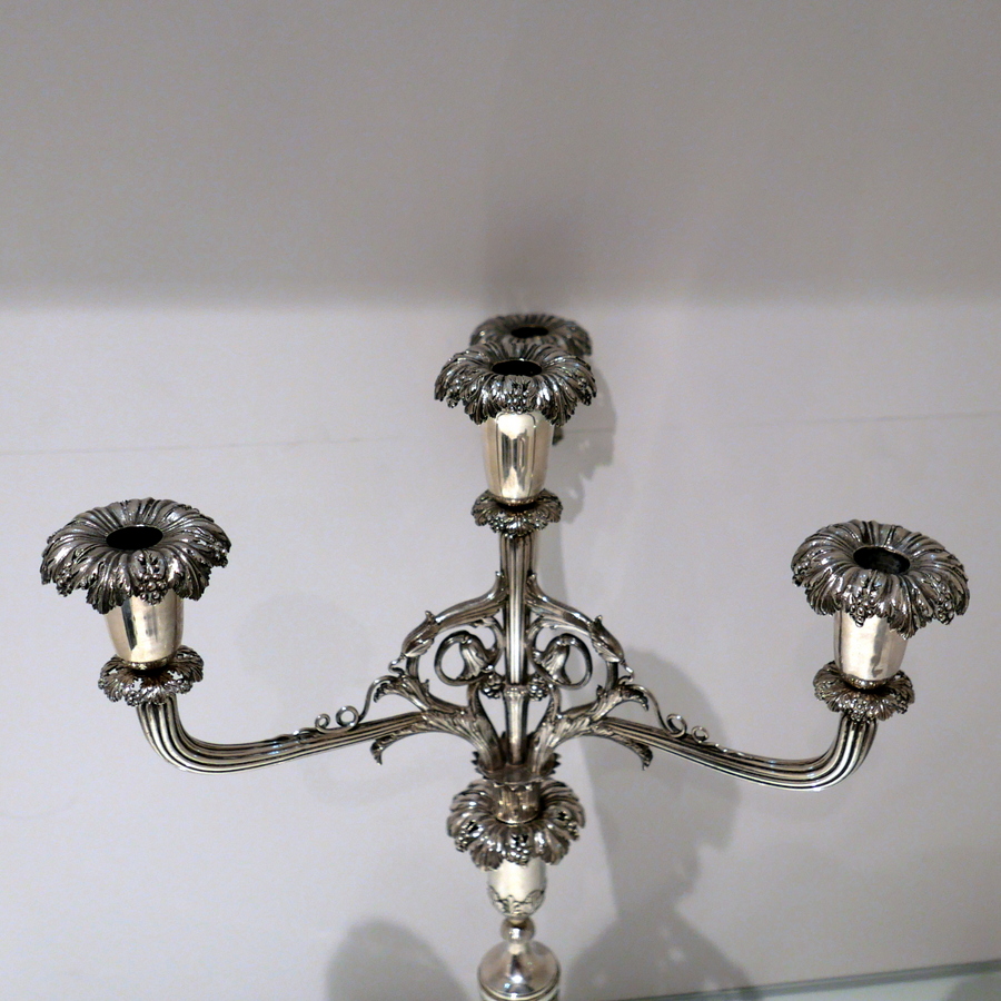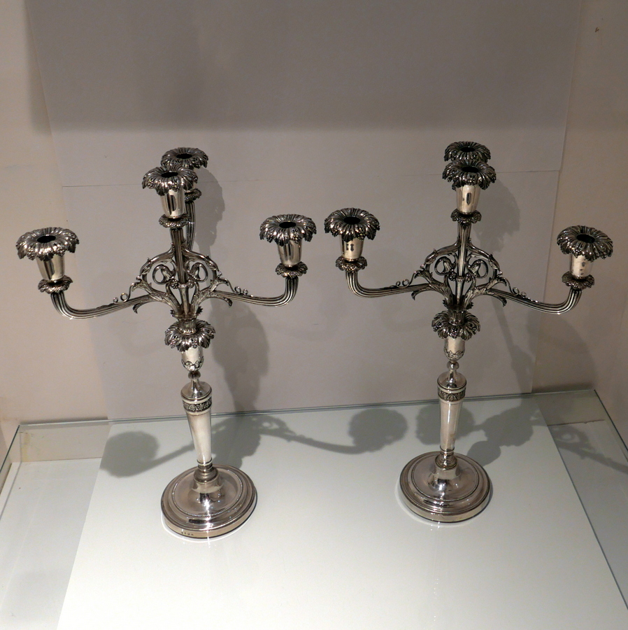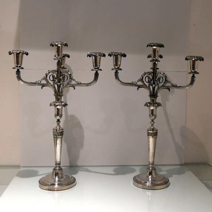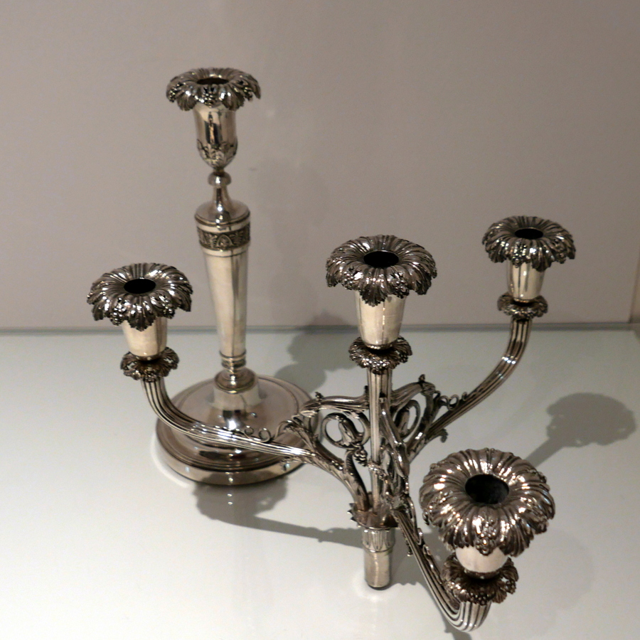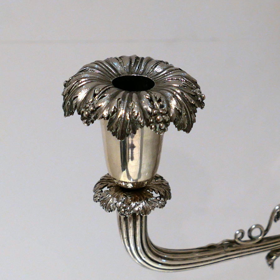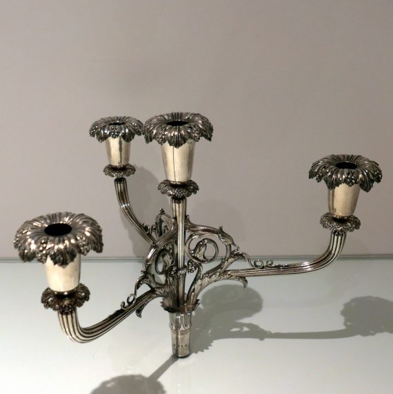 A truly magnificent and incredibly rare pair of early 19th century cast Italian made four light candelabra designed with the highly desirable ‘straight reed decorated’ branches, plain formed capitals and flowing grape and vine sconces. The circular bases, stems and lower capitals have decorative designs alternating plain formed craftsmanship for a stunning visual contrast.