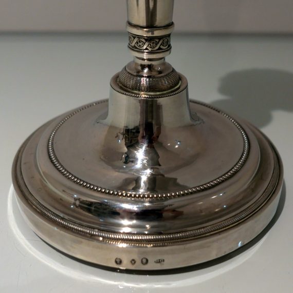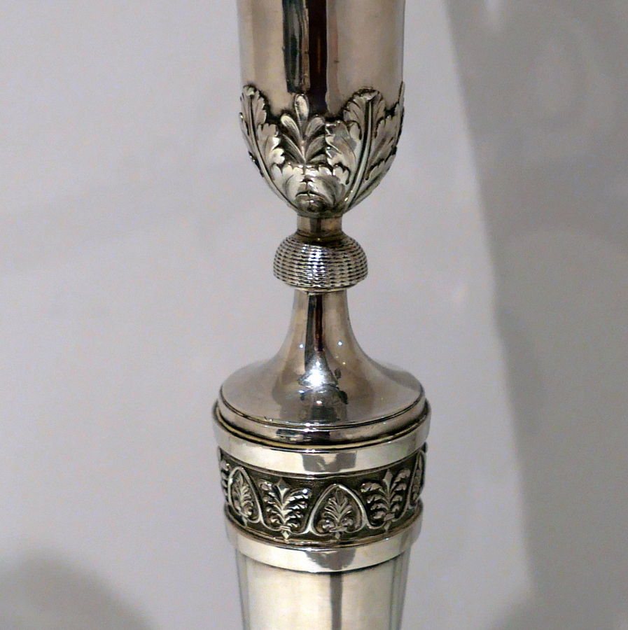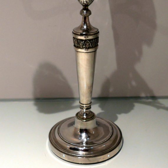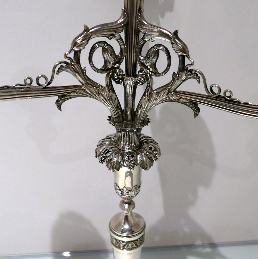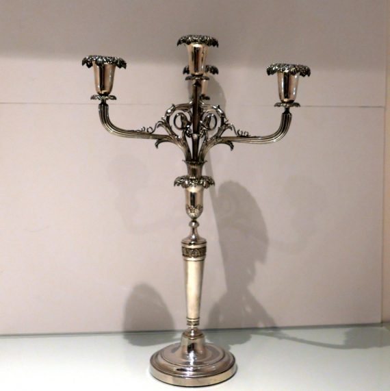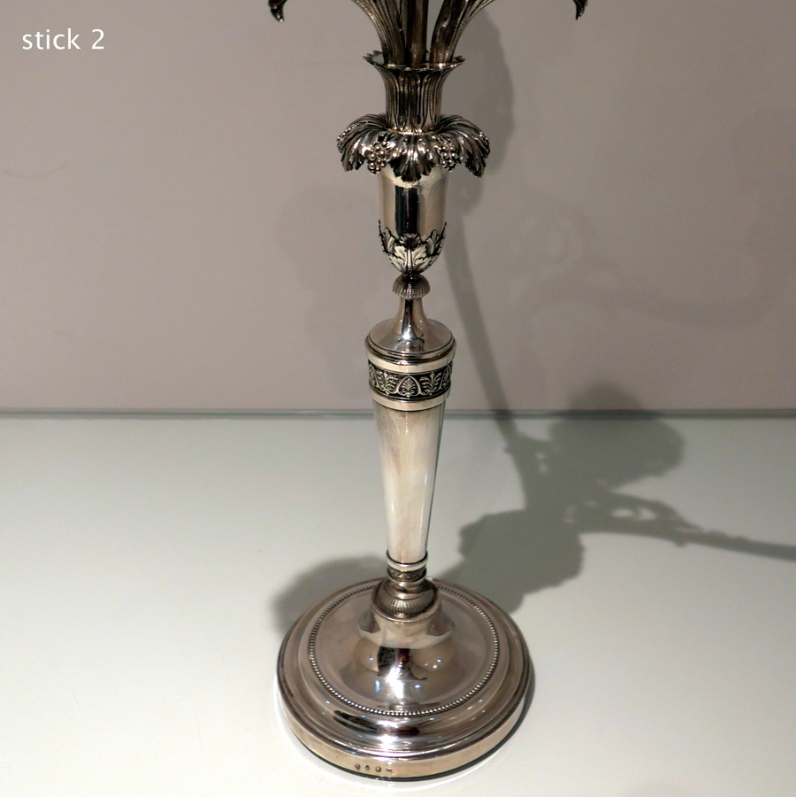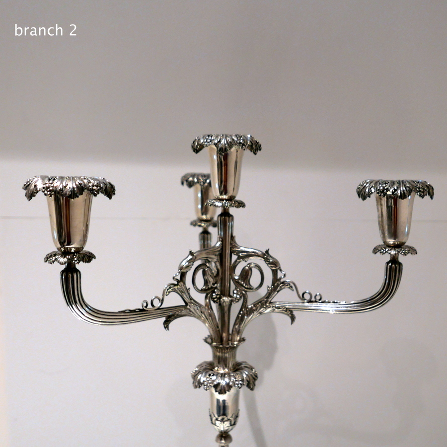 A truly magnificent and incredibly rare pair of early 19th century cast Italian made four light candelabra designed with the highly desirable ‘straight reed decorated’ branches, plain formed capitals and flowing grape and vine sconces. The circular bases, stems and lower capitals have decorative designs alternating plain formed craftsmanship for a stunning visual contrast.