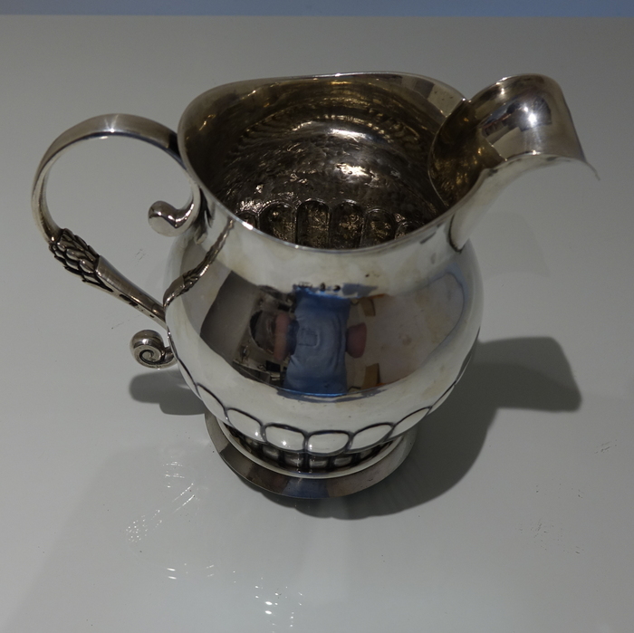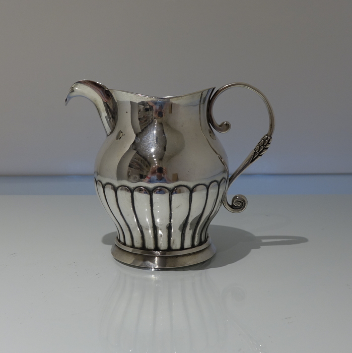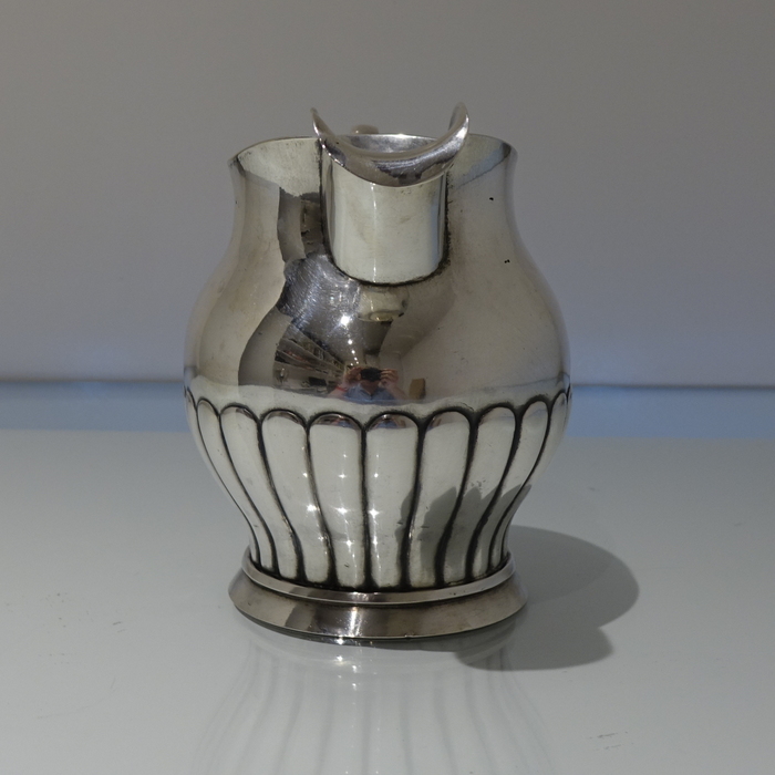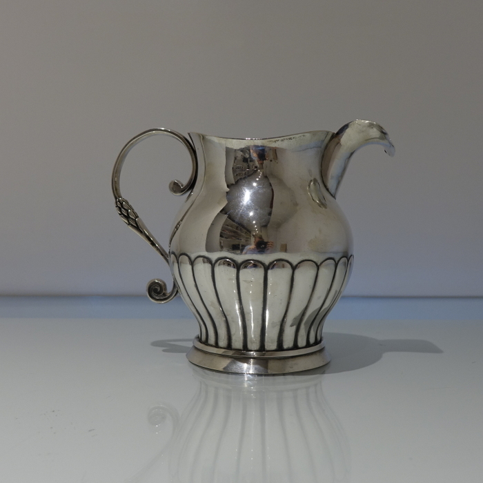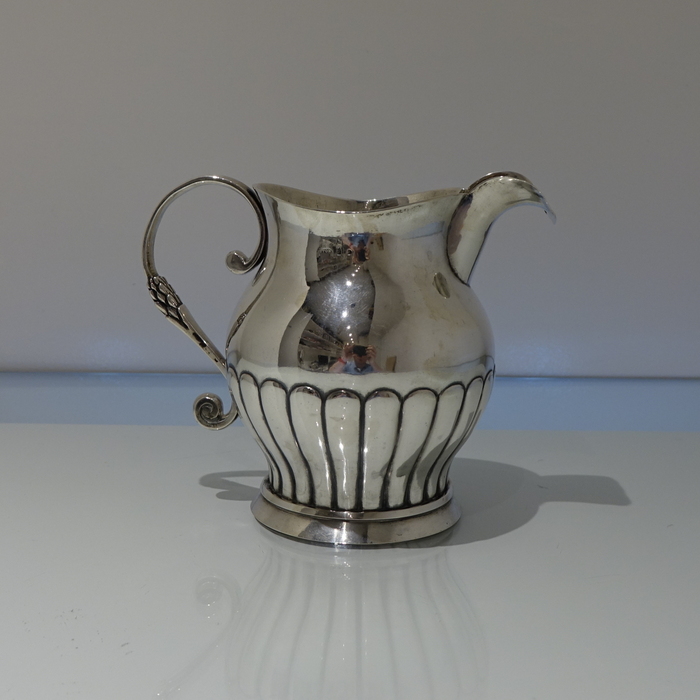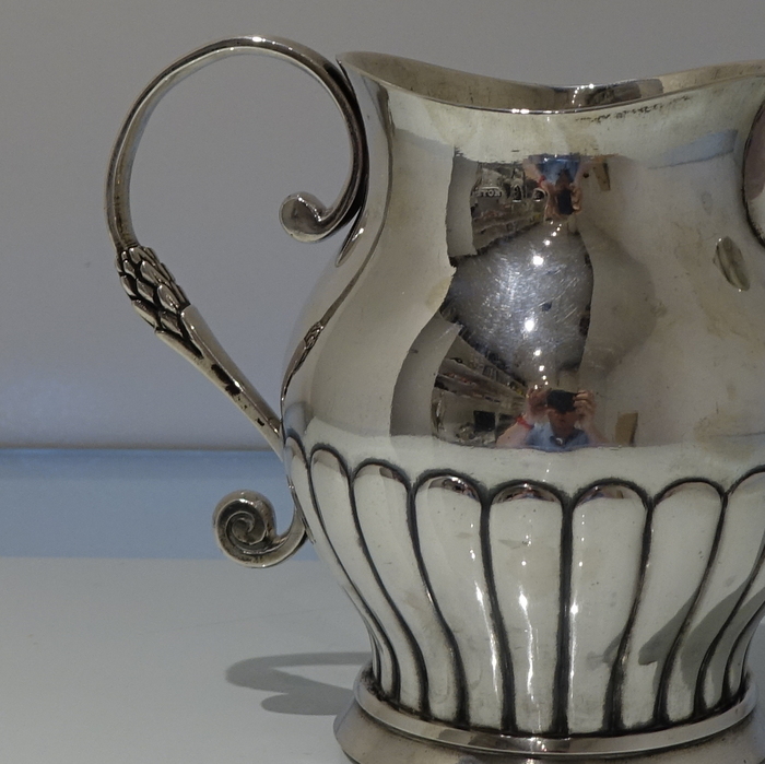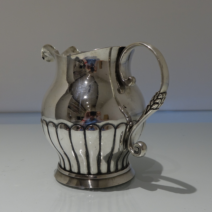 A very good quality continental 19th century half fluted European silver jug with an applied decorative scroll handle.