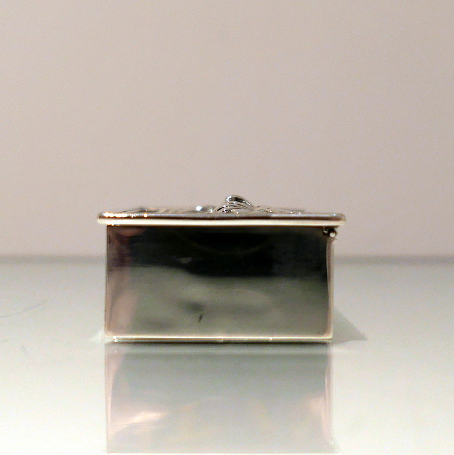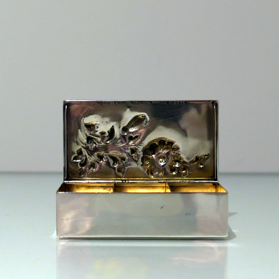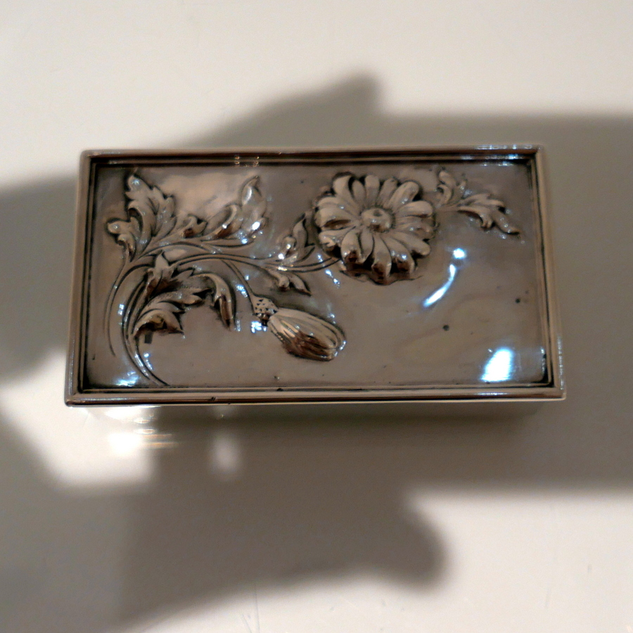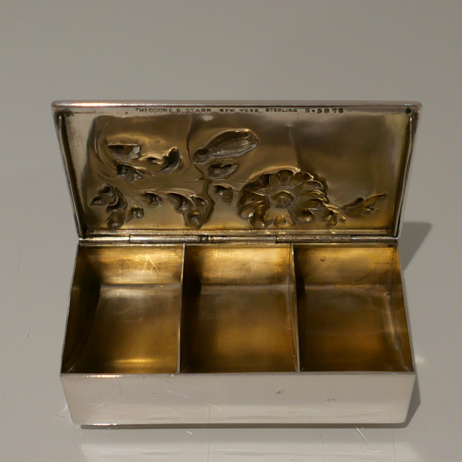 A stylish early 20th century sterling silver triple stamp box designed with an elegant plain formed rectangular body and a beautiful ornate floral moulded hinged lid. Â The inside of the stamp box has been gilded for decorative contrast.