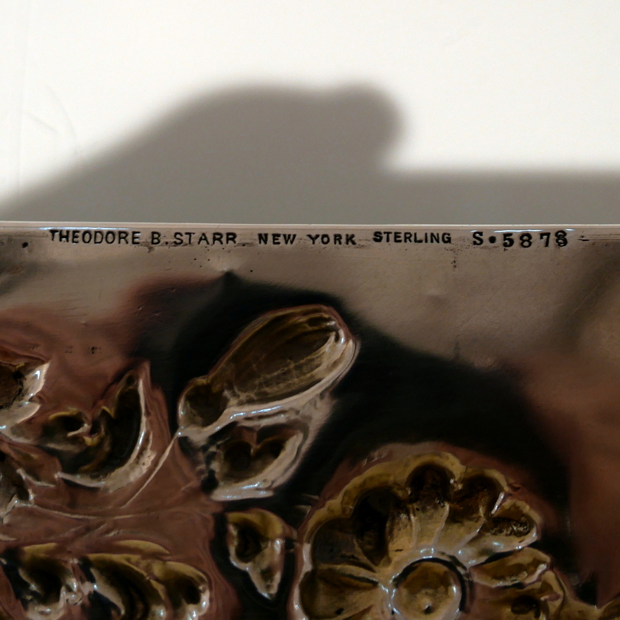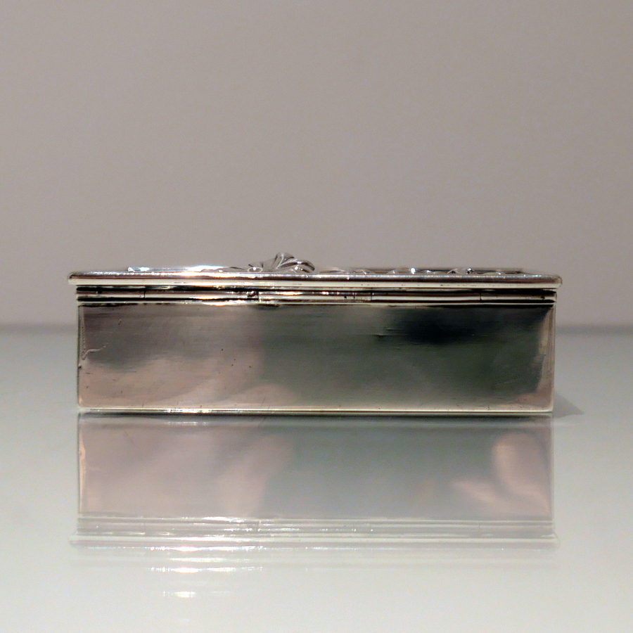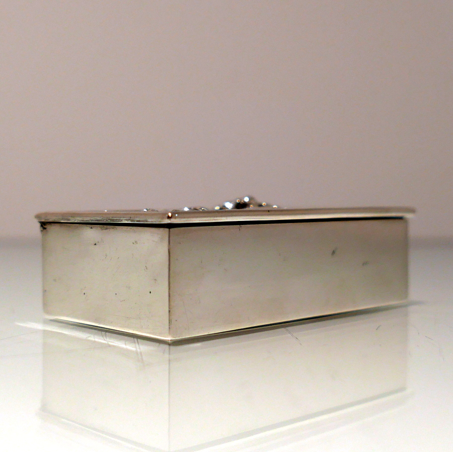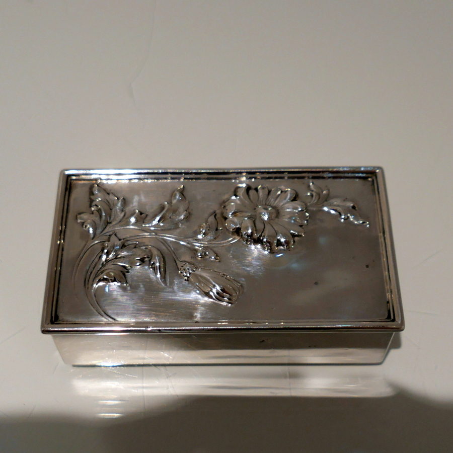 A stylish early 20th century sterling silver triple stamp box designed with an elegant plain formed rectangular body and a beautiful ornate floral moulded hinged lid. Â The inside of the stamp box has been gilded for decorative contrast.