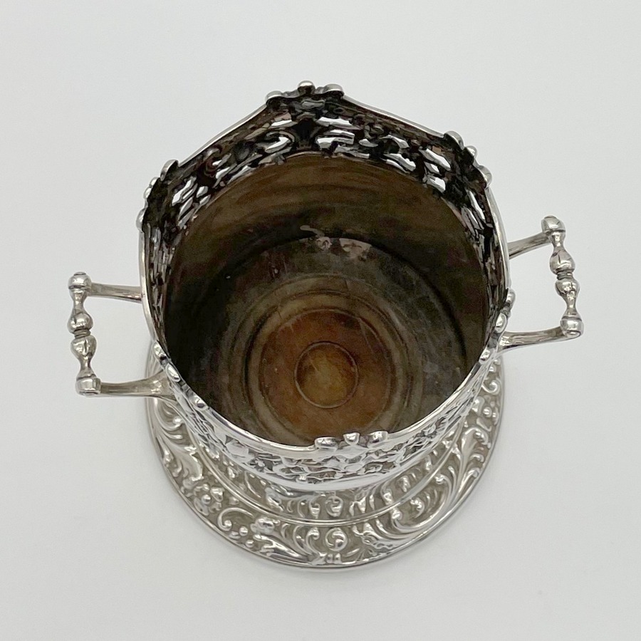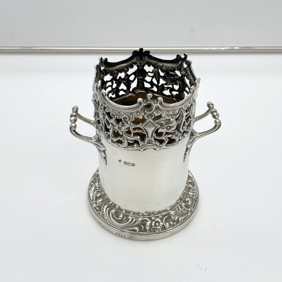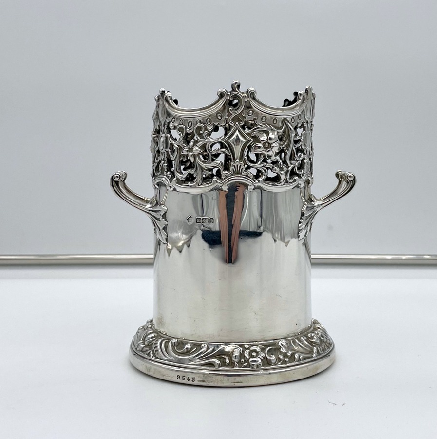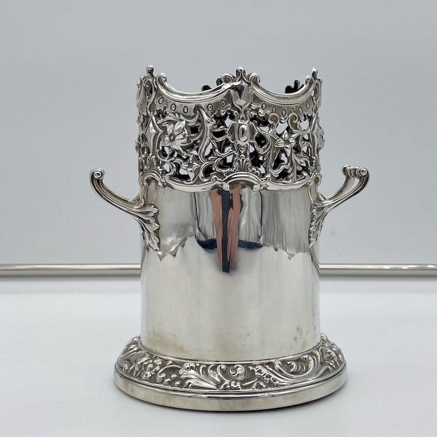 A beautiful early Edwardian sterling silver siphon stand decorated with stylishly intricate floral piercing to the upper section and a contrasting plain formed design to the lower base. The border has a delightful wavy edge and the fruitwood coaster base has additonal decorative outer floral mouldings.