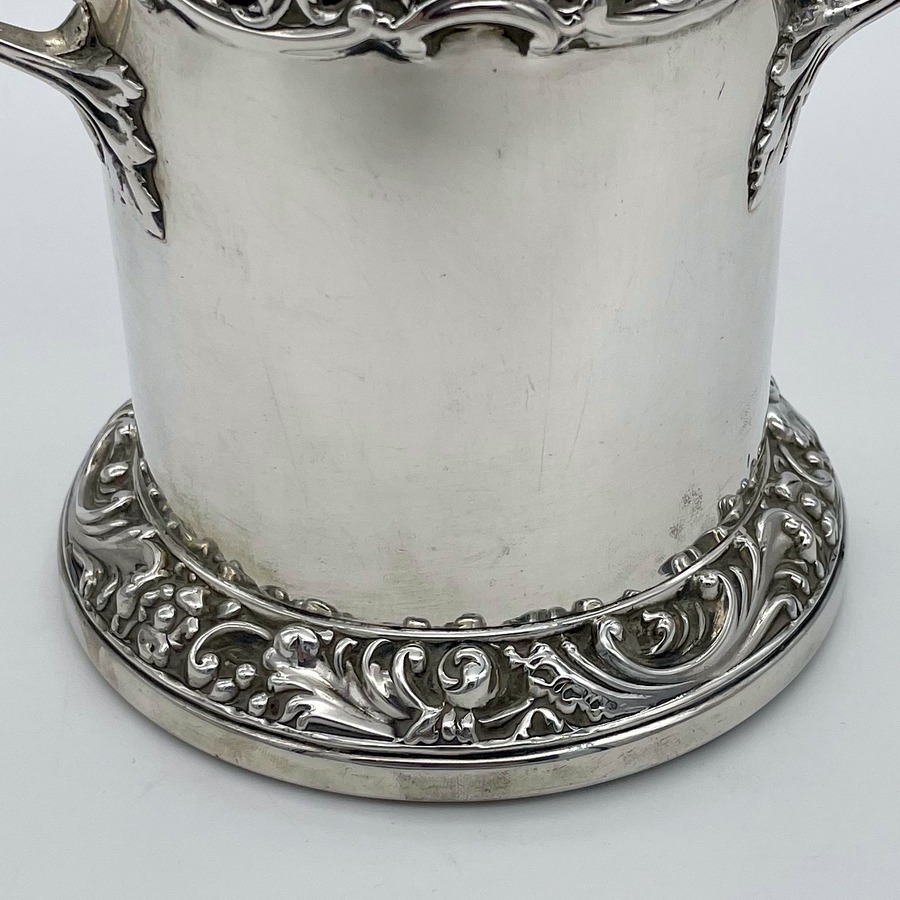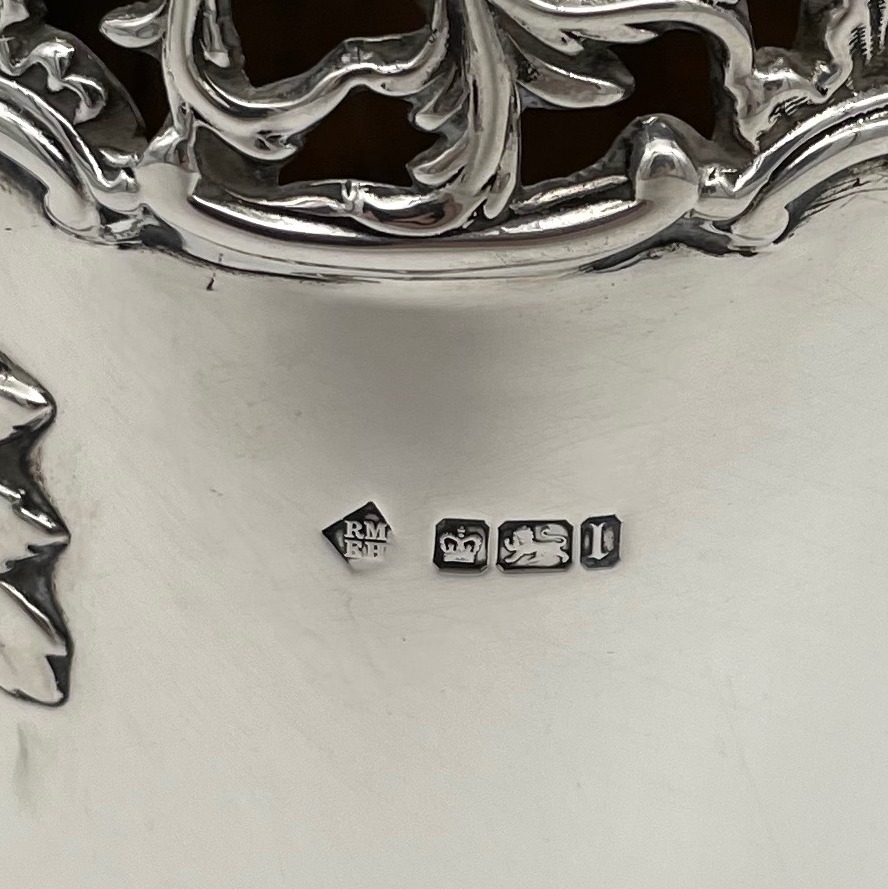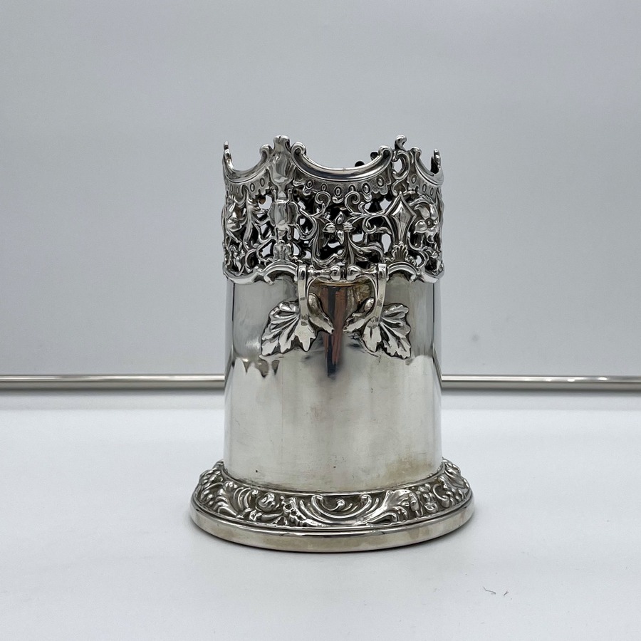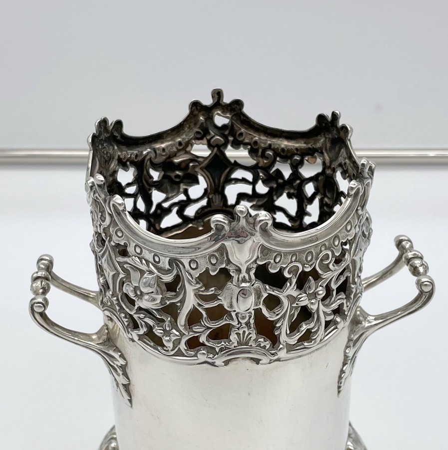 A beautiful early Edwardian sterling silver siphon stand decorated with stylishly intricate floral piercing to the upper section and a contrasting plain formed design to the lower base. The border has a delightful wavy edge and the fruitwood coaster base has additonal decorative outer floral mouldings.
