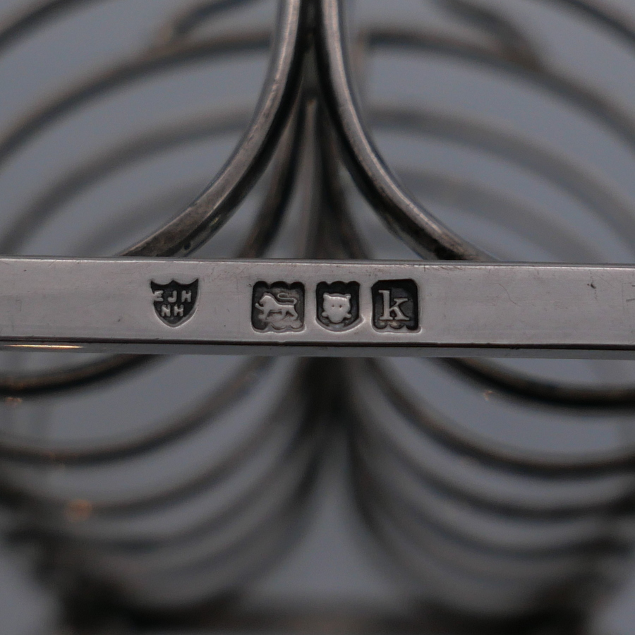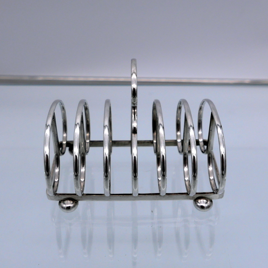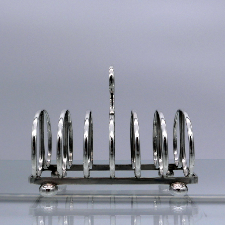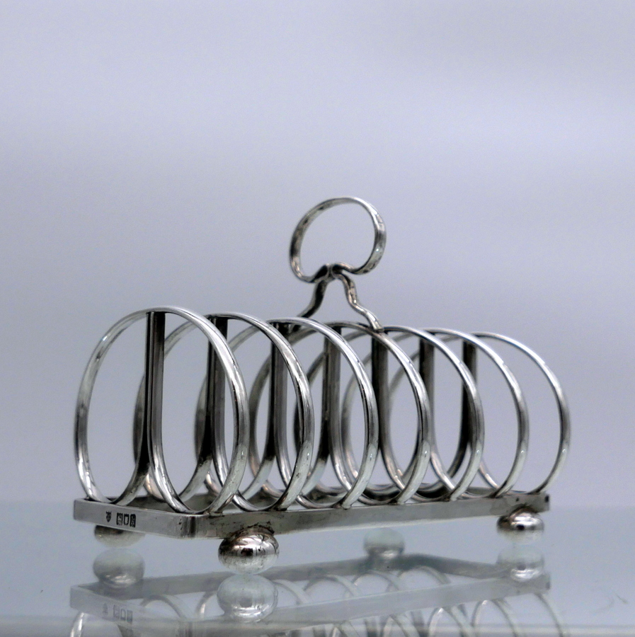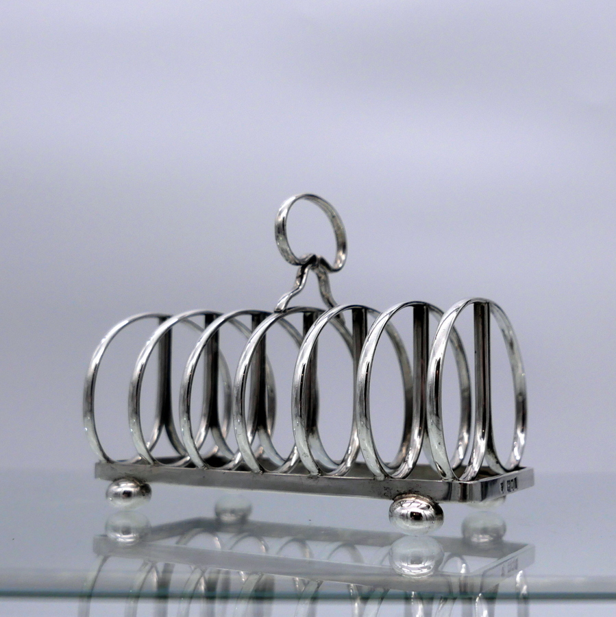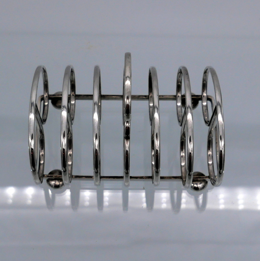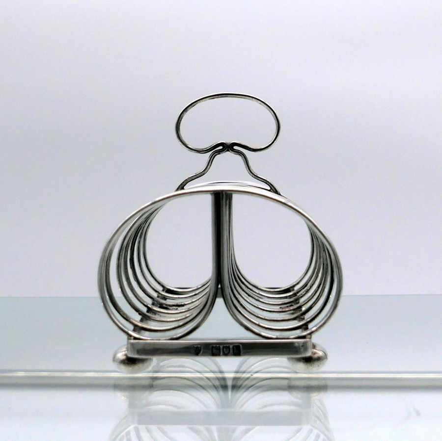 A stylish wire formed sterling silver Edwardian plain formed seven bar toast rack shaped with elegant curvaceous bars assembled onto an oblong frame.