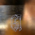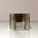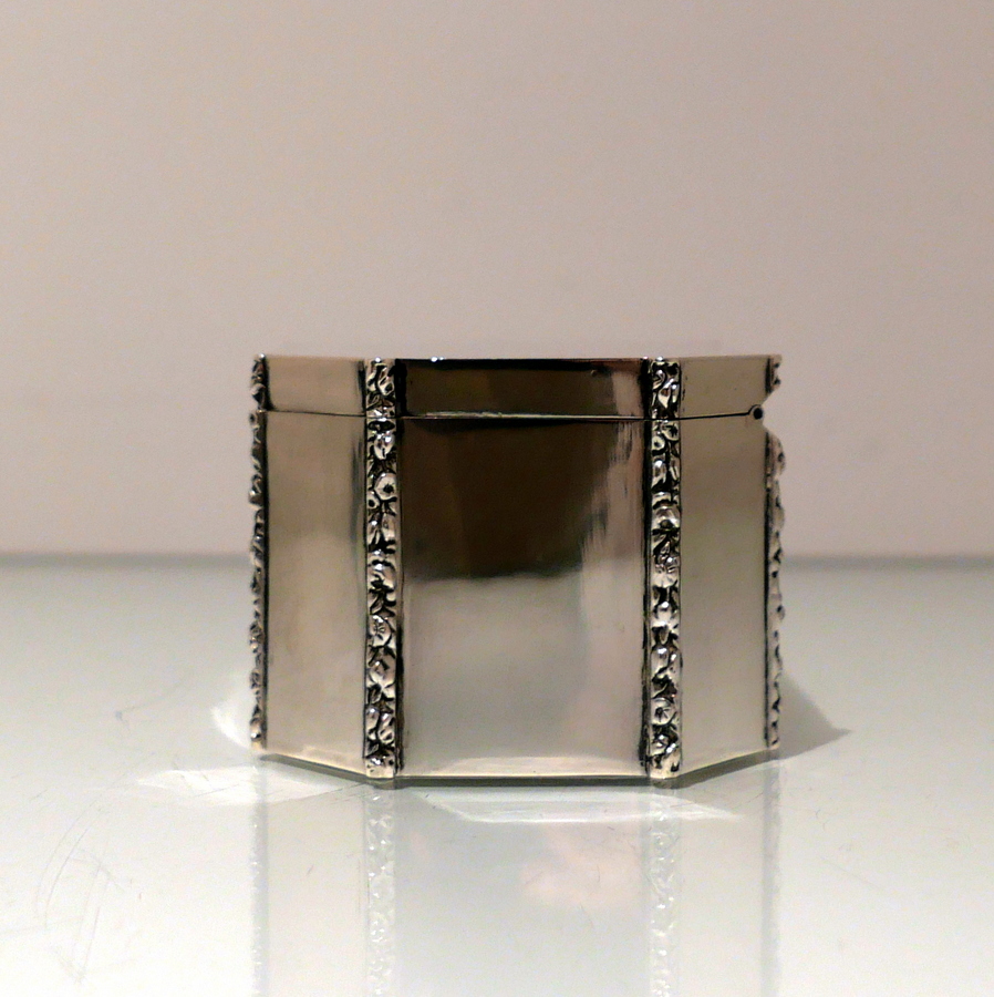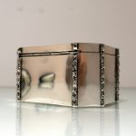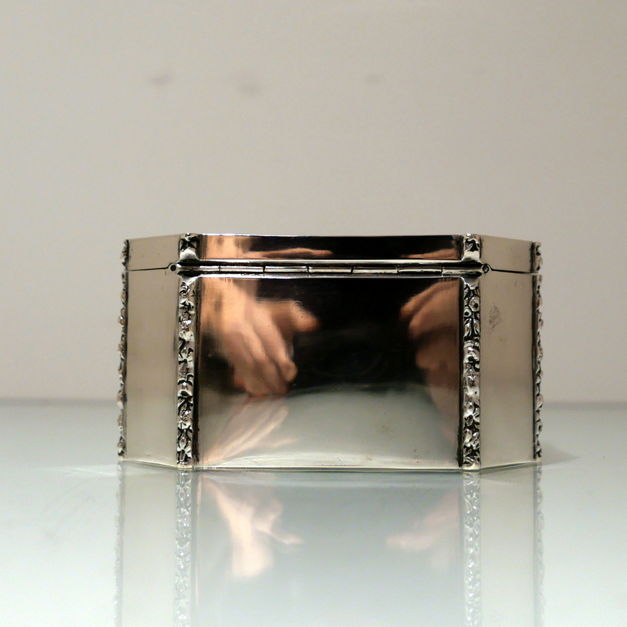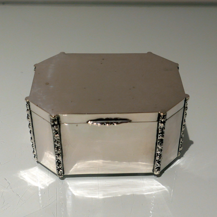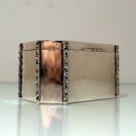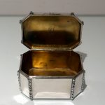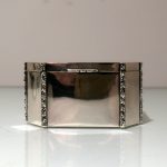 A stylish early 20th century shaped rectangular panelled silver box designed with alternating ornate vertical struts and an elegant hinged lid. Â The inside has been gilded and engraved with contemporary entwined initial for importance.