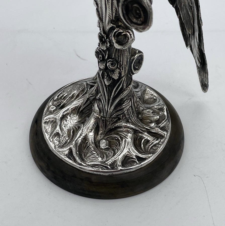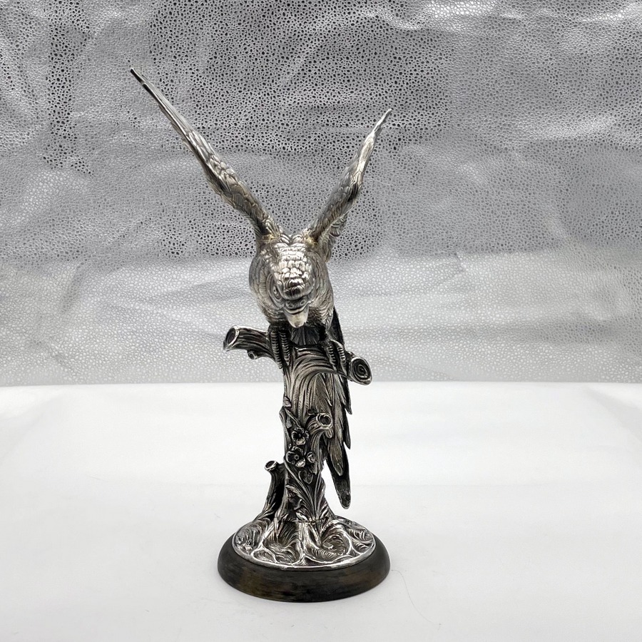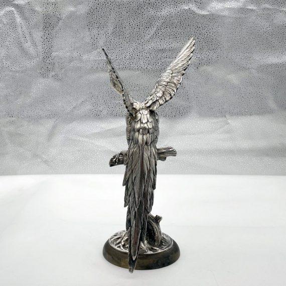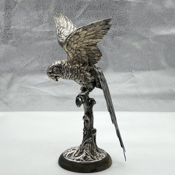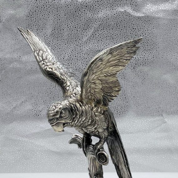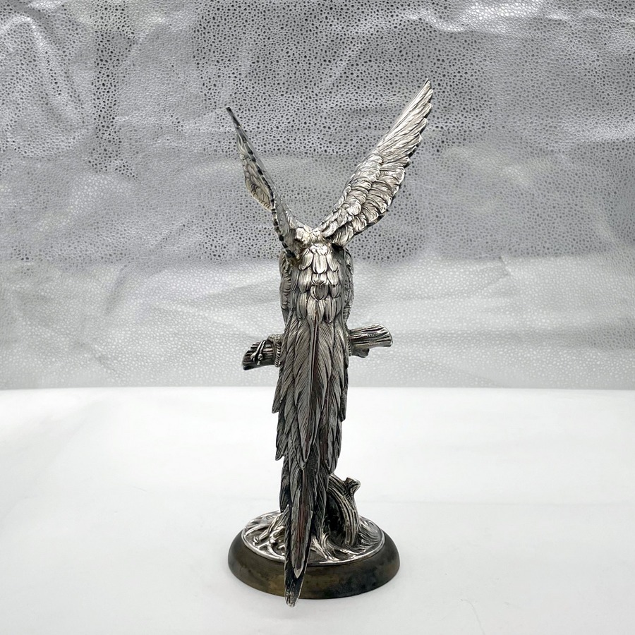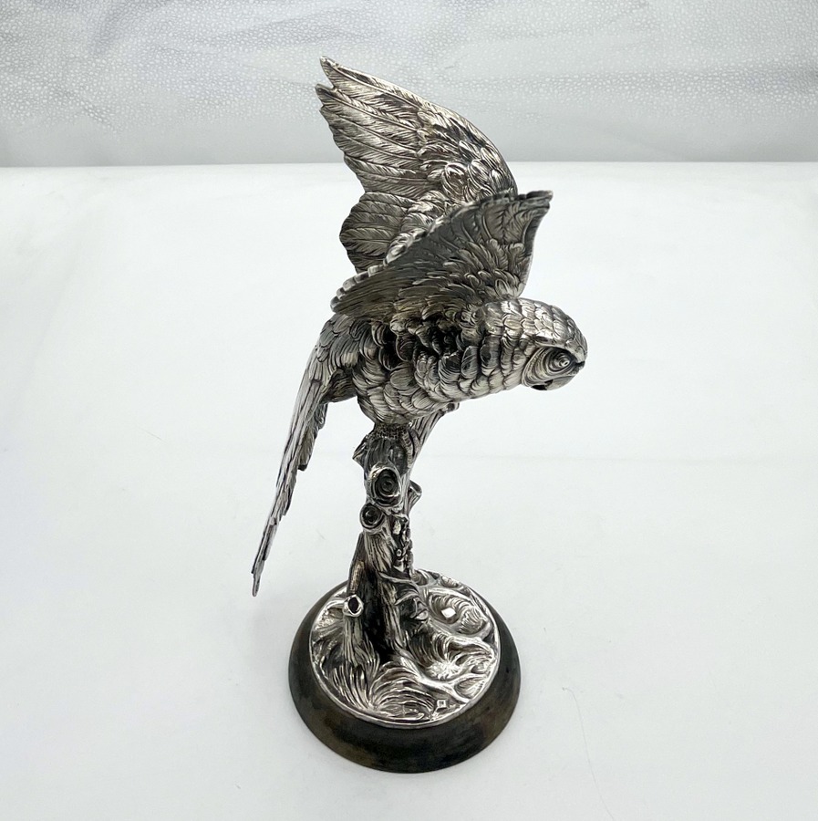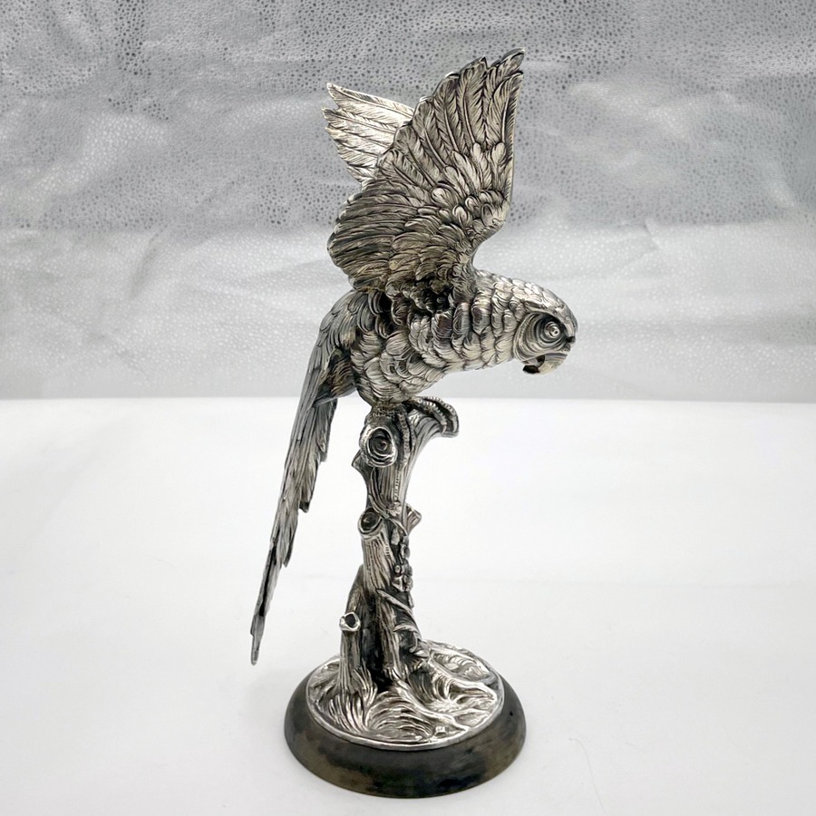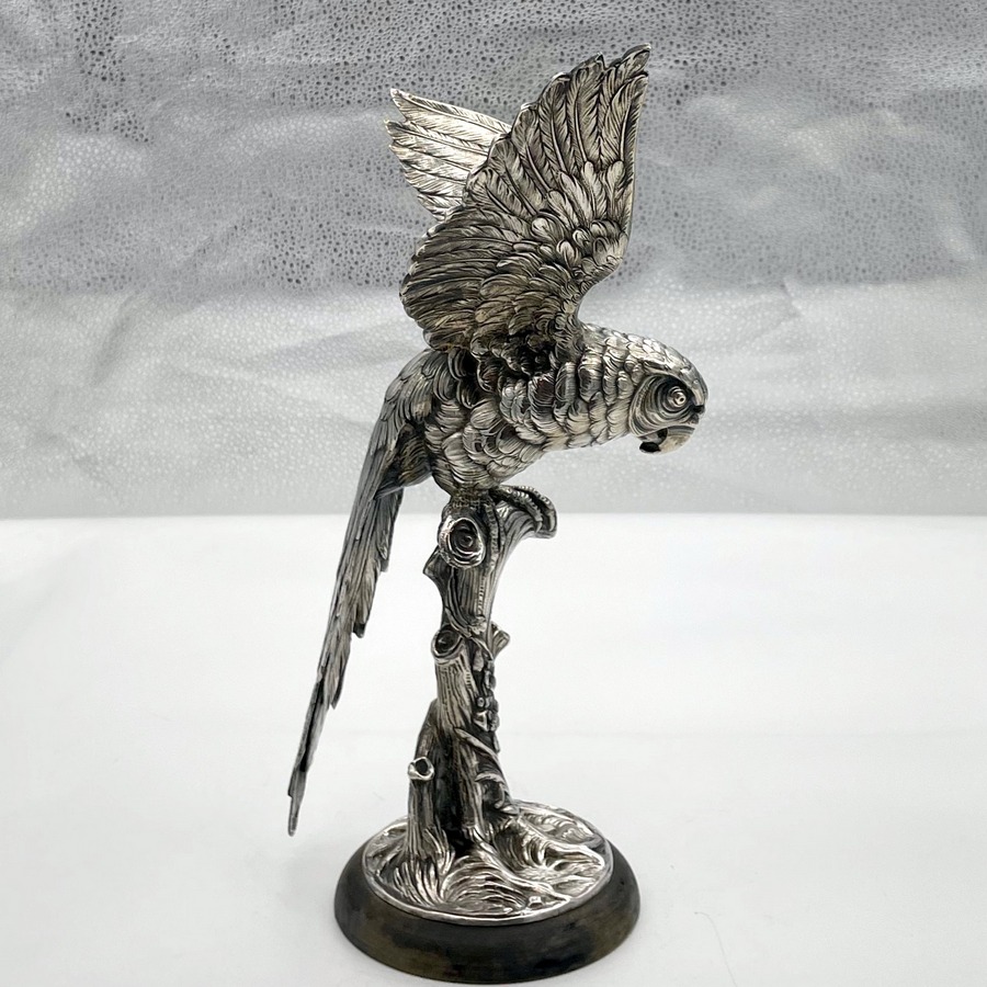 A fabulous and highly collectable modelled silver parrot beautifully perched on a raised pedestal naturalistic foot. The parrot has strikingly detailed life like features with spreadeagled wings.