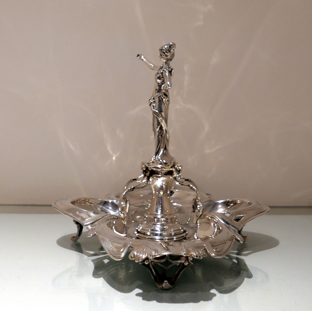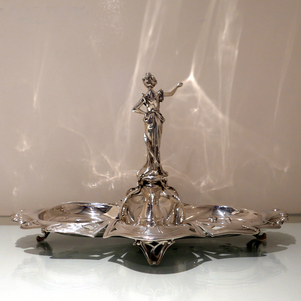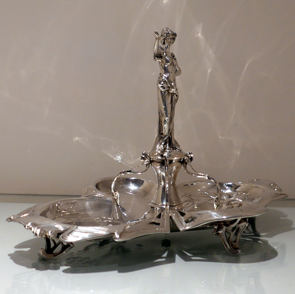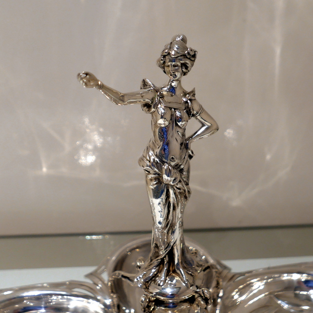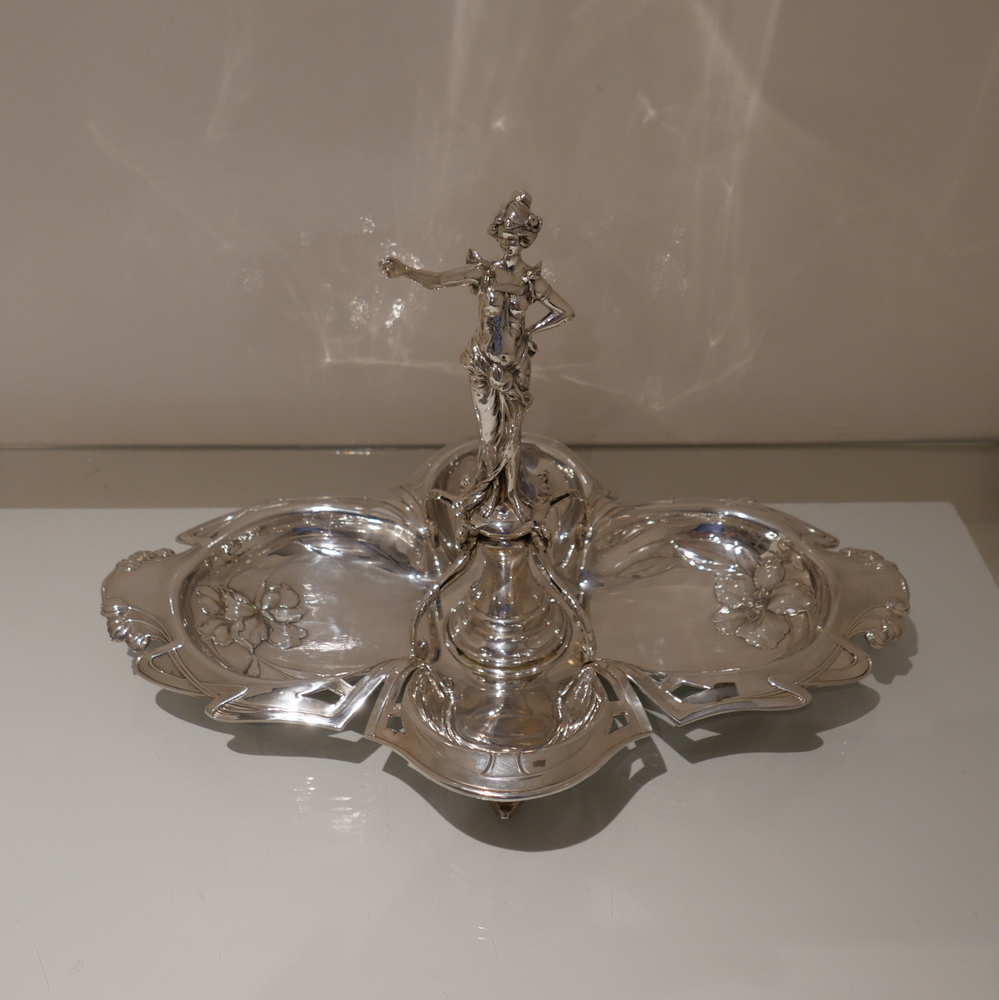 A beautiful large late 19th century art nouveau silver centrepiece decorated with inner beautiful floral motifs. Â The base is elegantly shaped for imaginative styling. Â The stunning figural handle (greeting lady) is raised on a pedestal plinth as the central decorative theme.