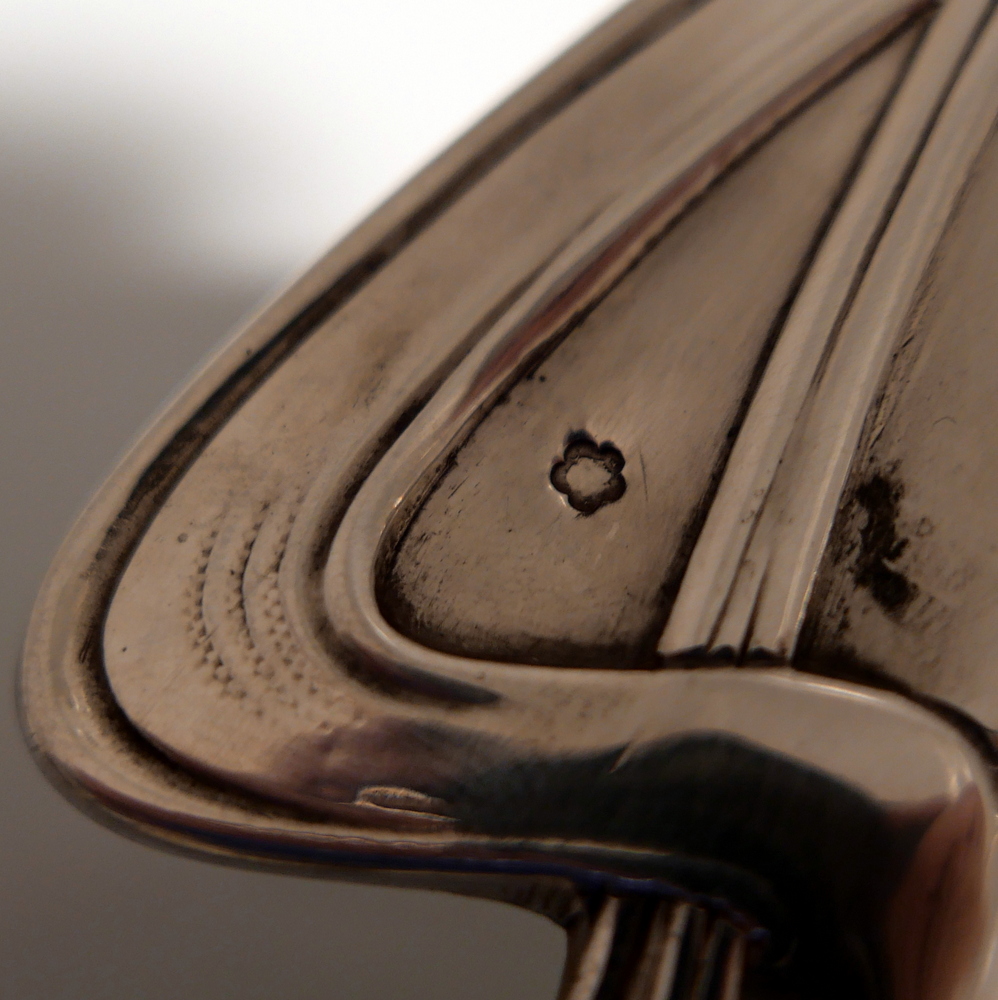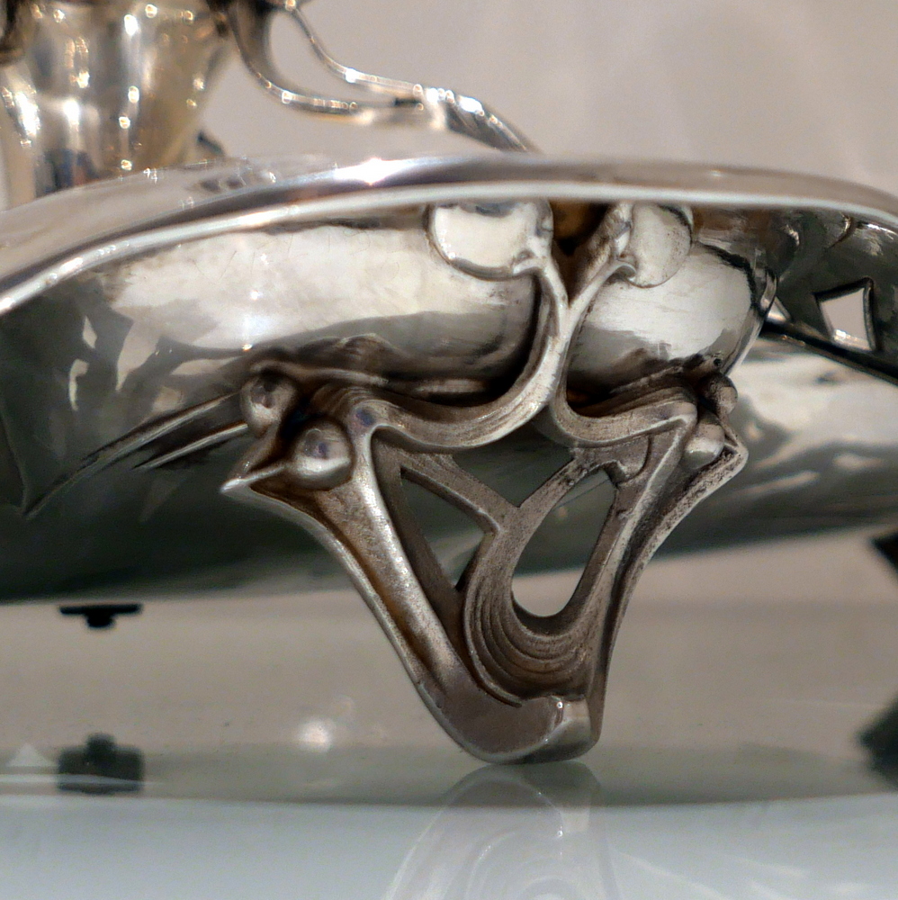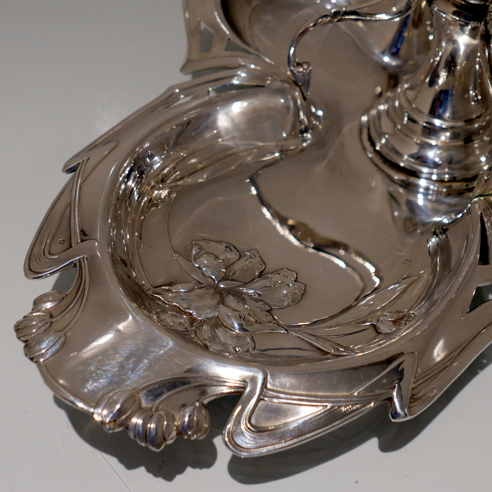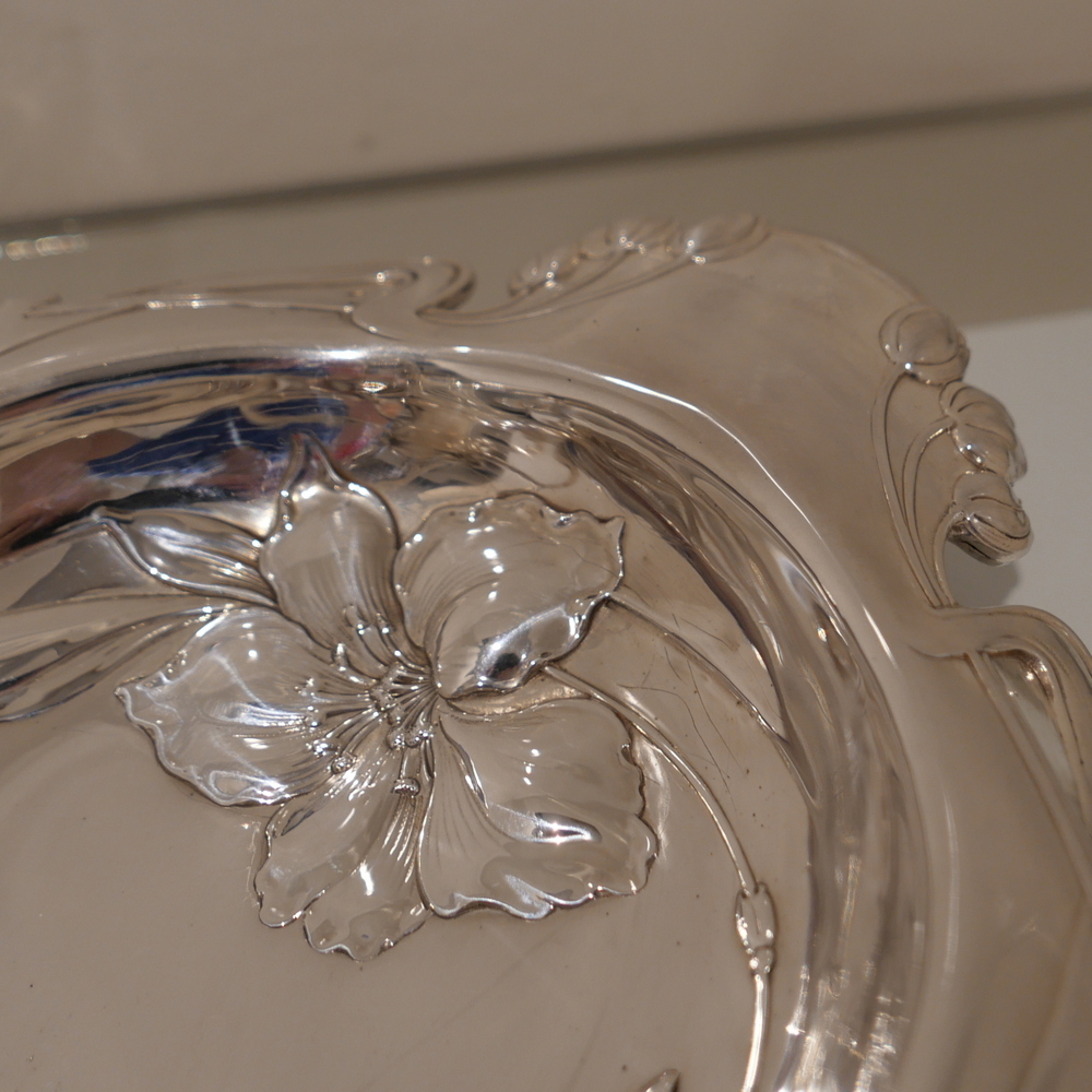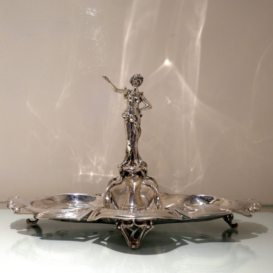 A beautiful large late 19th century art nouveau silver centrepiece decorated with inner beautiful floral motifs. Â The base is elegantly shaped for imaginative styling. Â The stunning figural handle (greeting lady) is raised on a pedestal plinth as the central decorative theme.