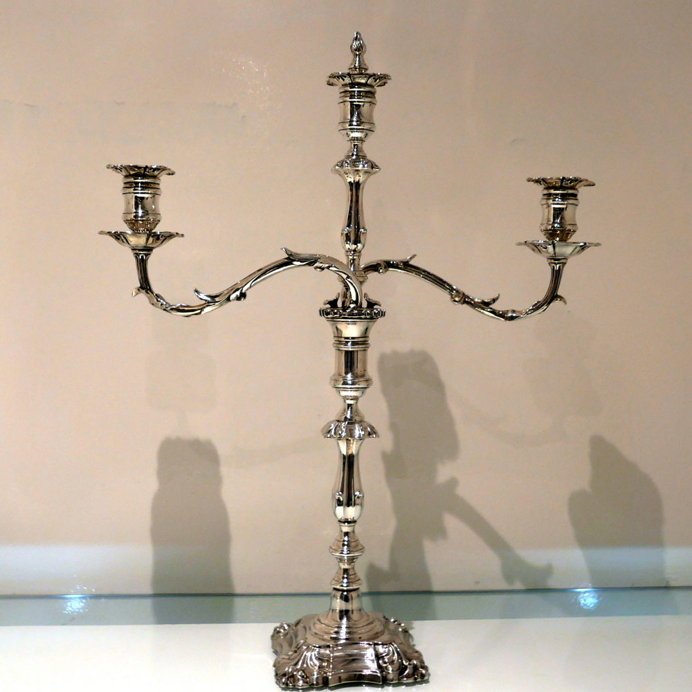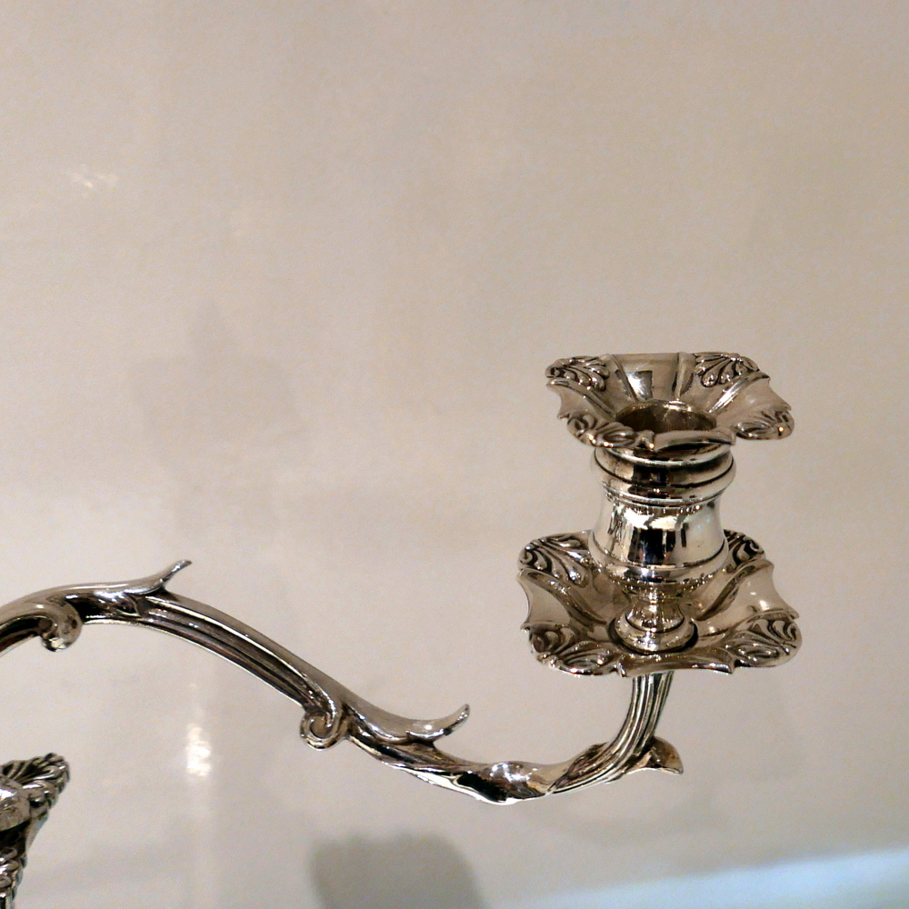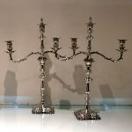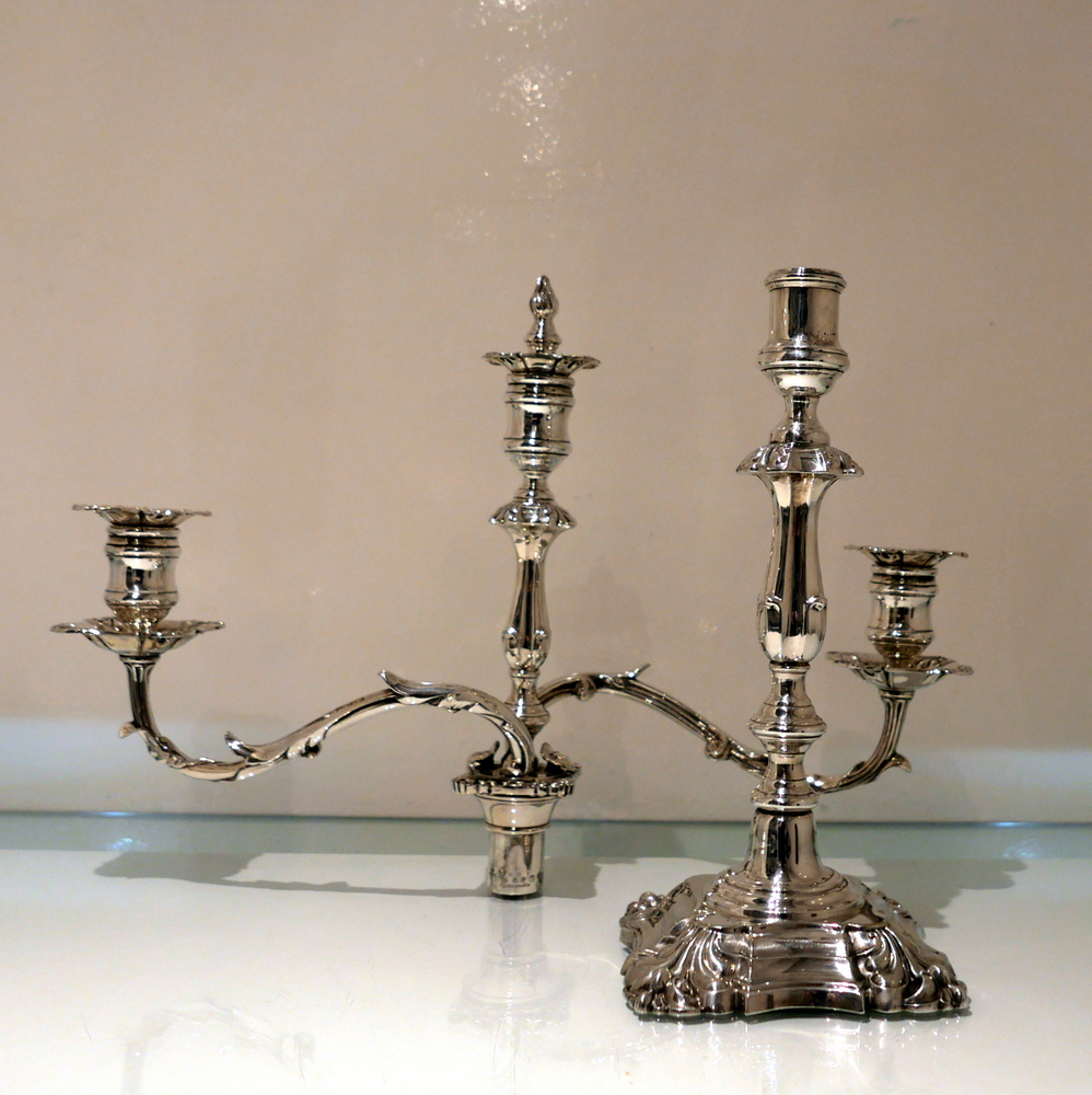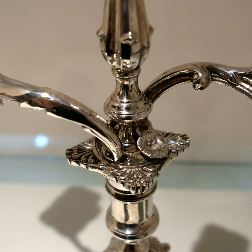 A stunning pair of three light Victorian plate candelabra made by the highly renowned manufacturer Elkington & Co.  The bases are shaped square and have elegant shell designs at the angles.  The branches have a  naturalistic theme and interchange into a single 5 light candelabrum.