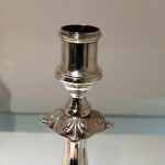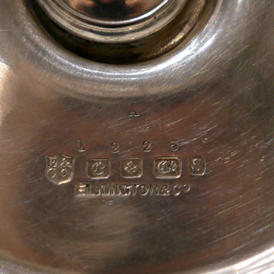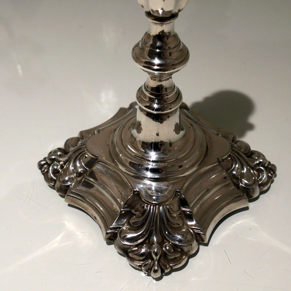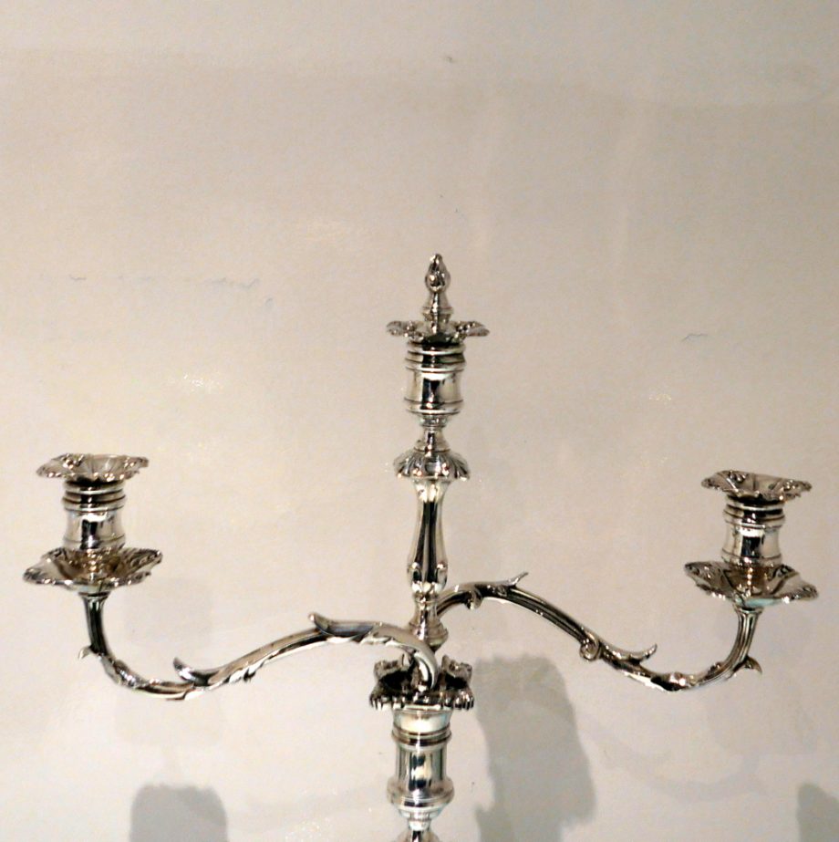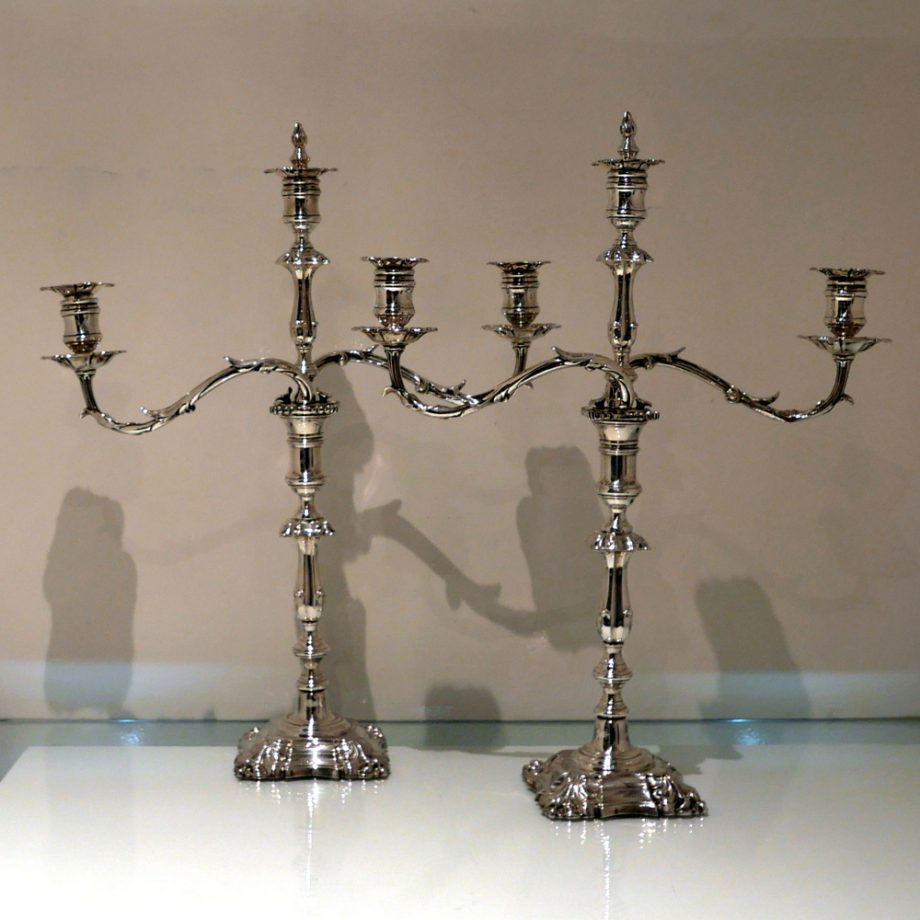 A stunning pair of three light Victorian plate candelabra made by the highly renowned manufacturer Elkington & Co.  The bases are shaped square and have elegant shell designs at the angles.  The branches have a  naturalistic theme and interchange into a single 5 light candelabrum.