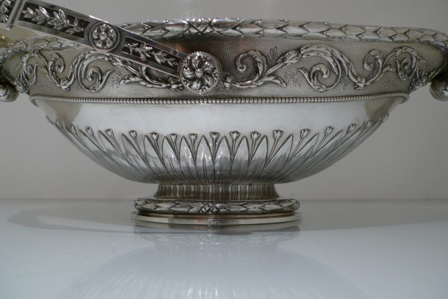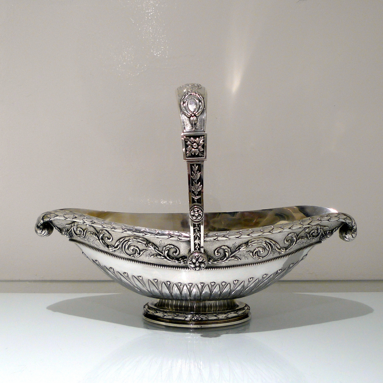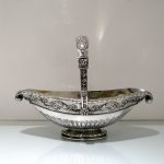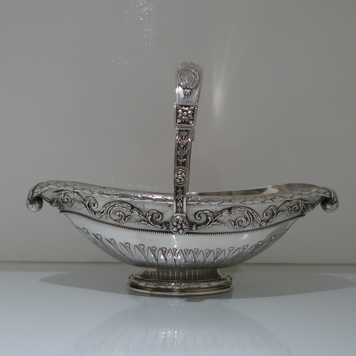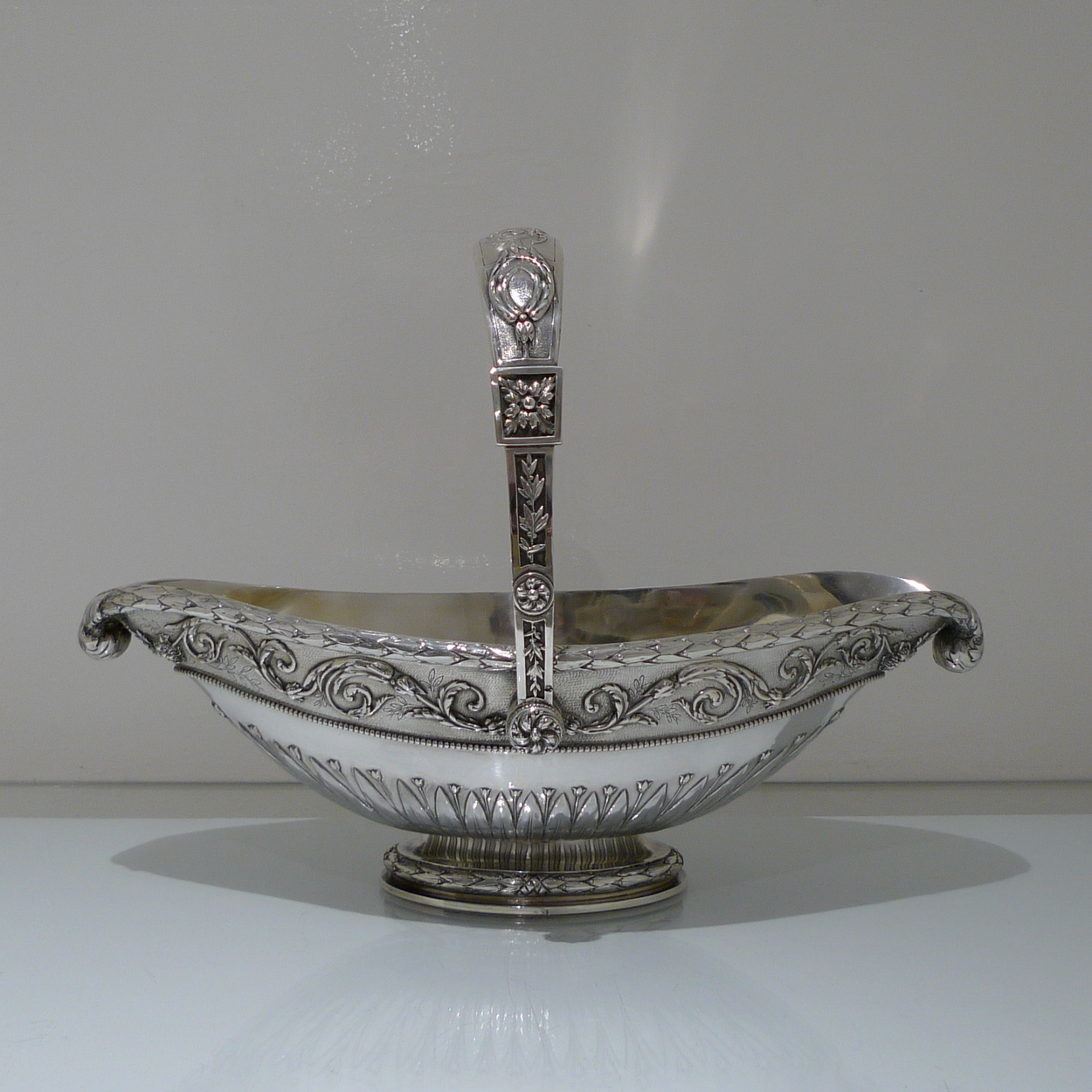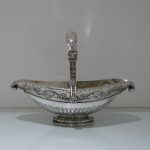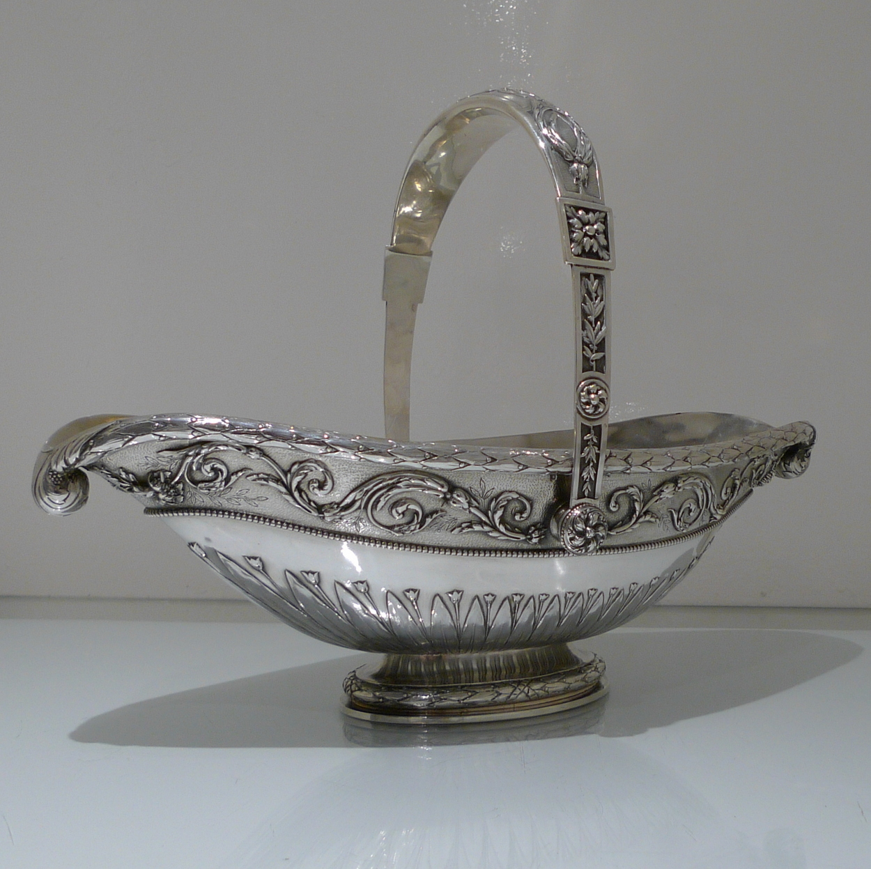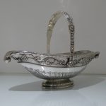 A truly stunning and incredibly large swing handled basket decorated with an ornate applied upper floral border which is set on a matt background and highlighted by an elegant bead border. Â The oval foot and lower section of the bowl has additional decoration for lowlights.