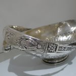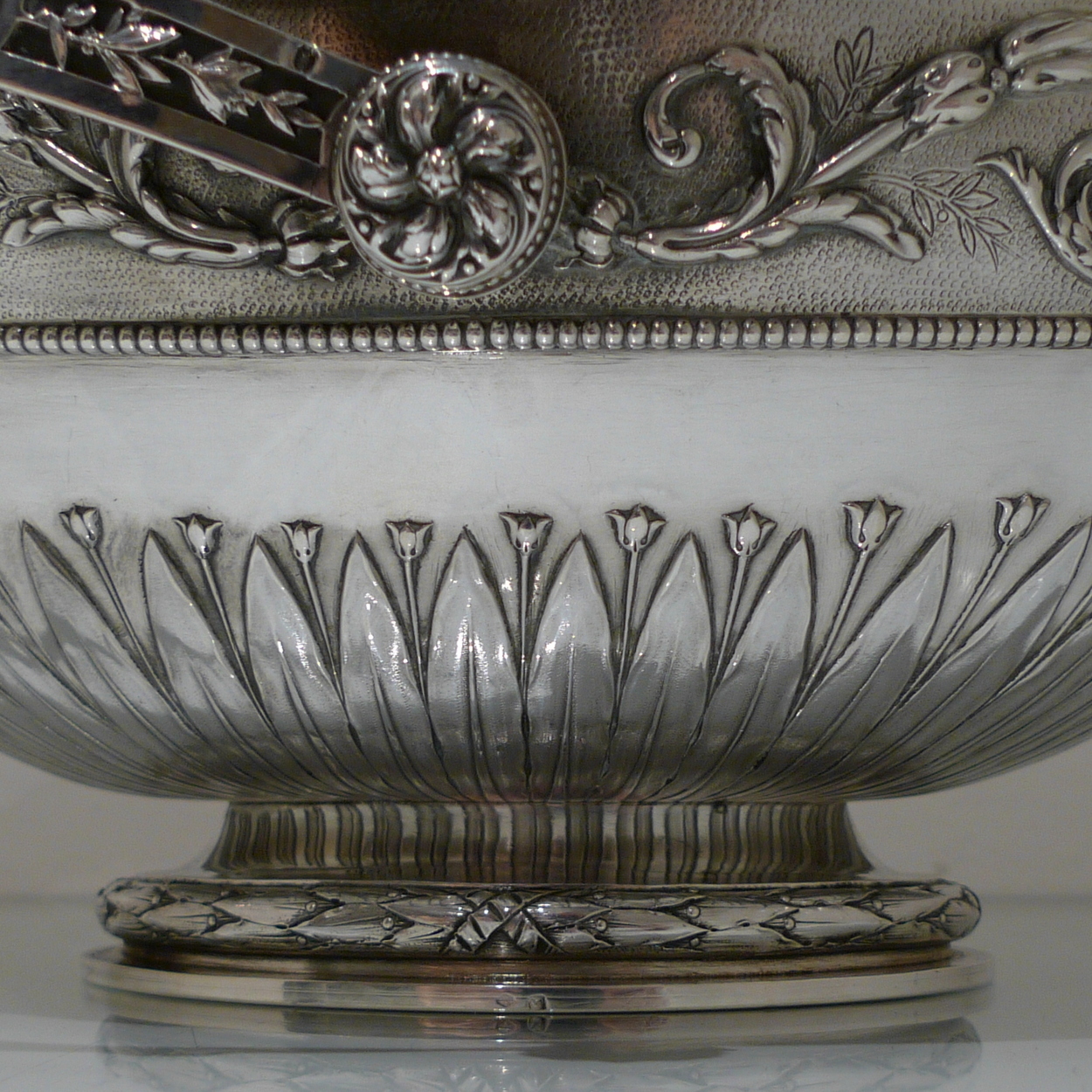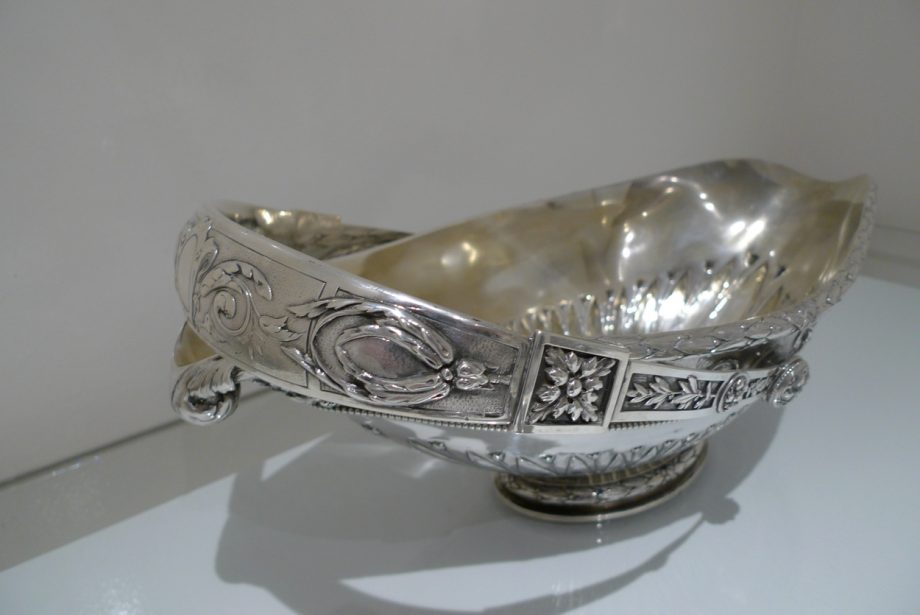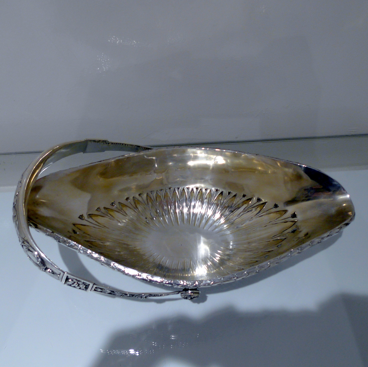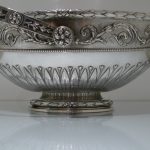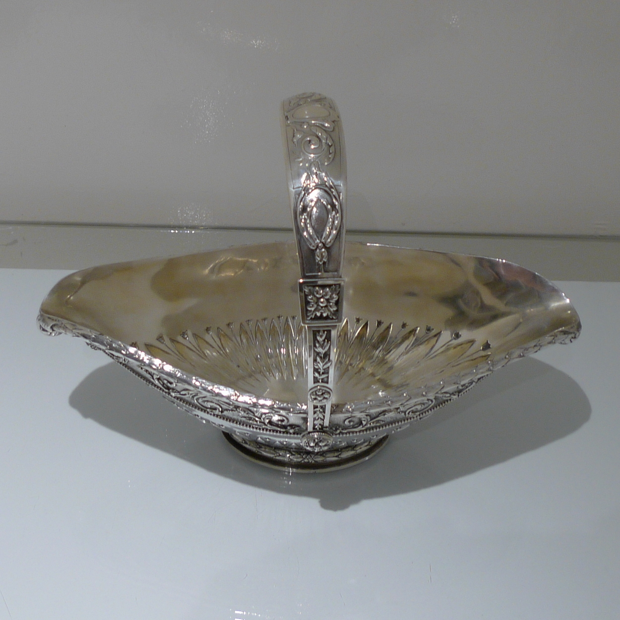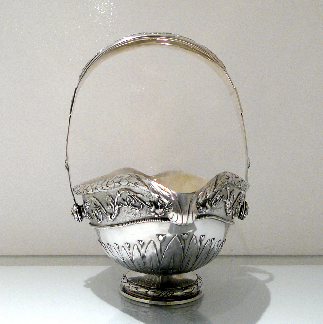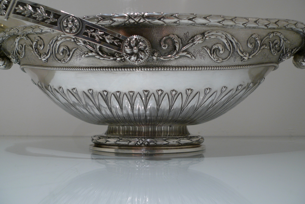 A truly stunning and incredibly large swing handled basket decorated with an ornate applied upper floral border which is set on a matt background and highlighted by an elegant bead border. Â The oval foot and lower section of the bowl has additional decoration for lowlights.