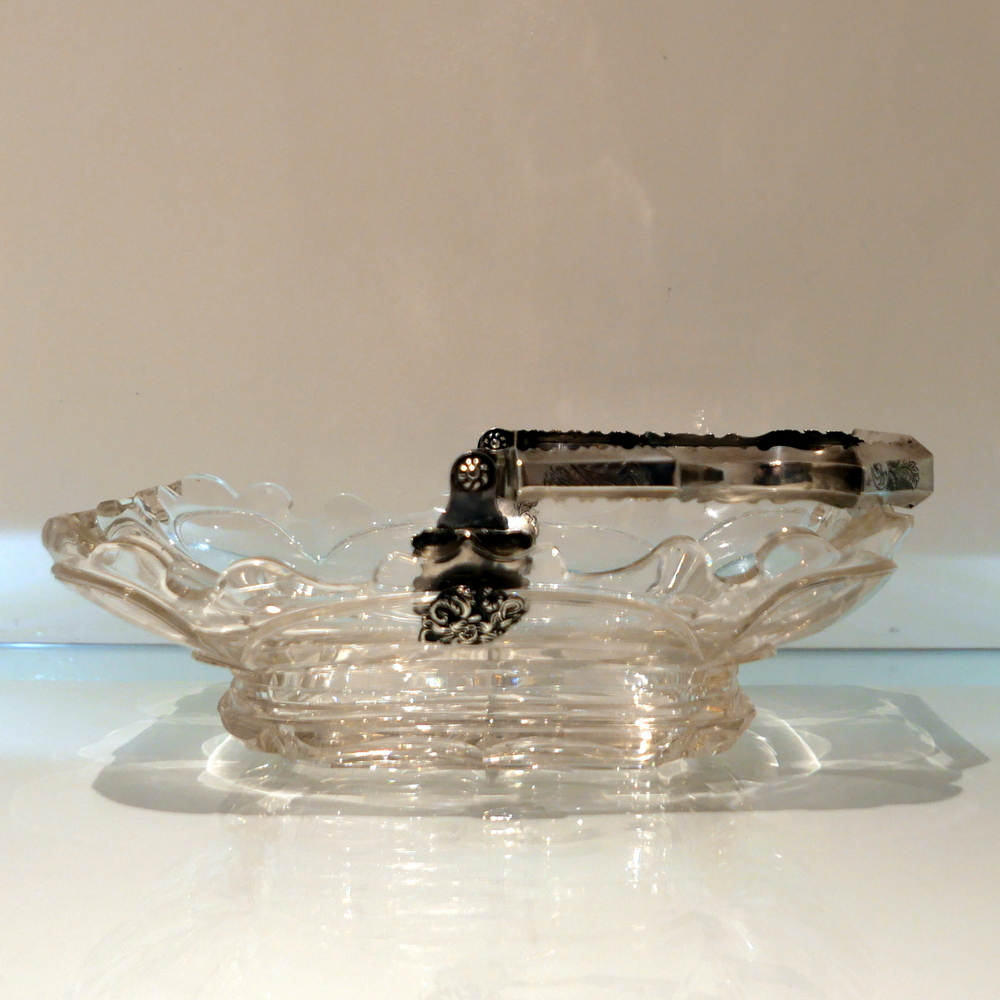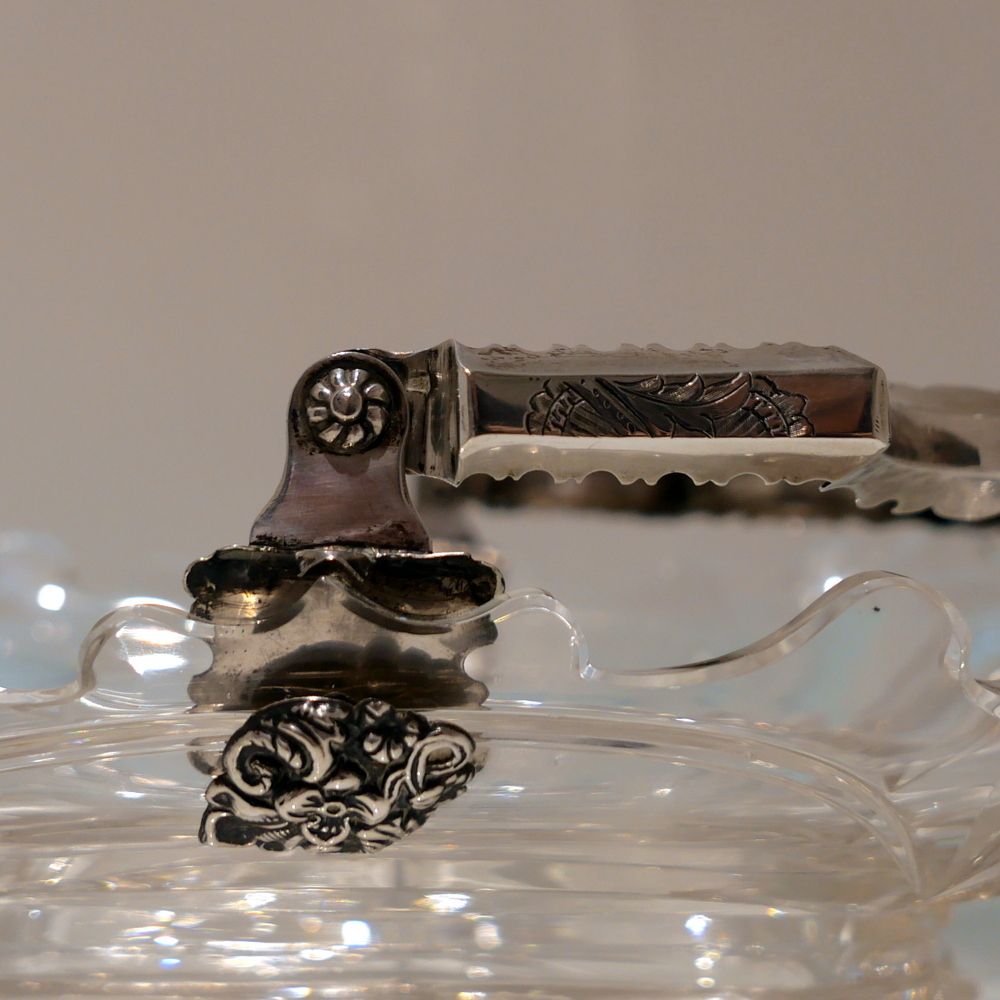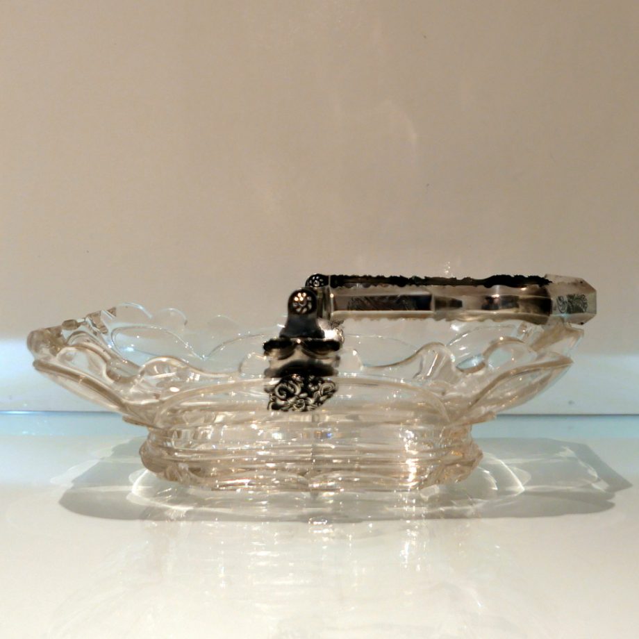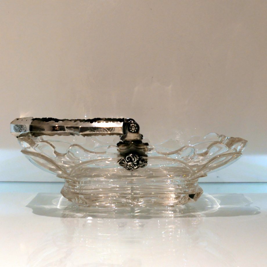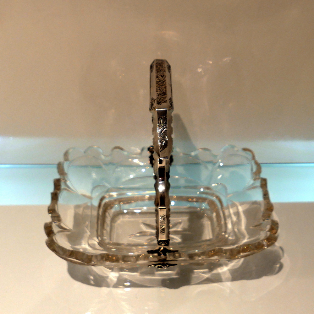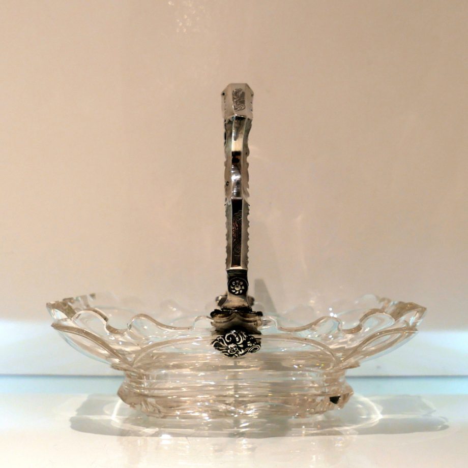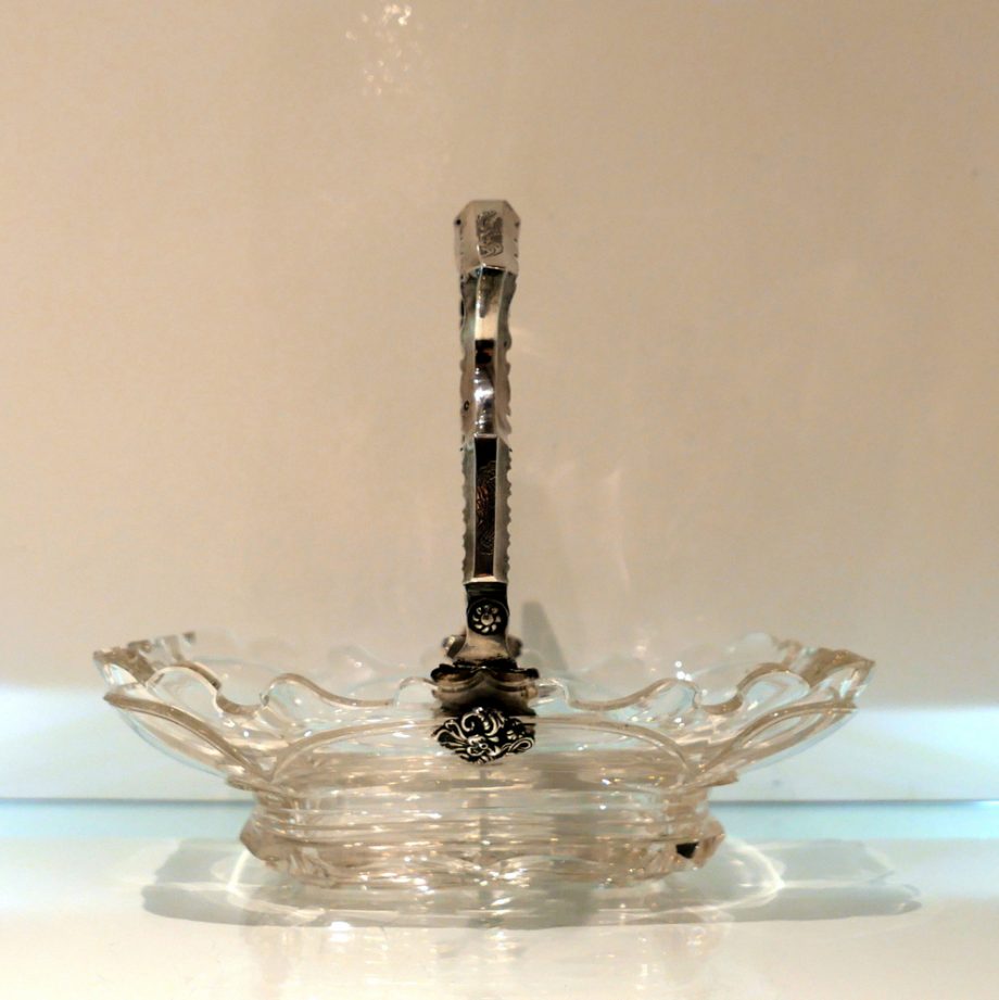 A stylish antique Dutch made silver and crystal cake basket rectangular in design and formed with a ‘wavy’ stylish edge. Â The silver hinged swing handle has elegant intricate hand engraving for highlights.