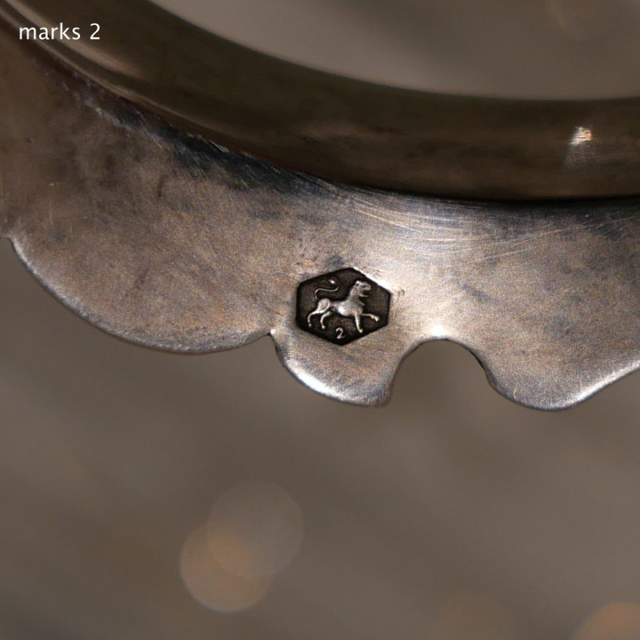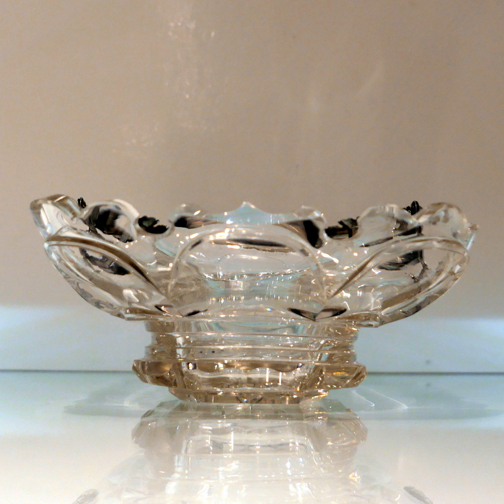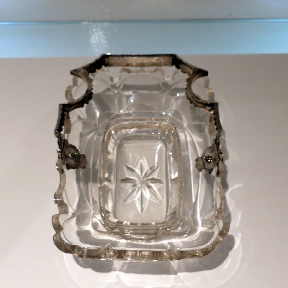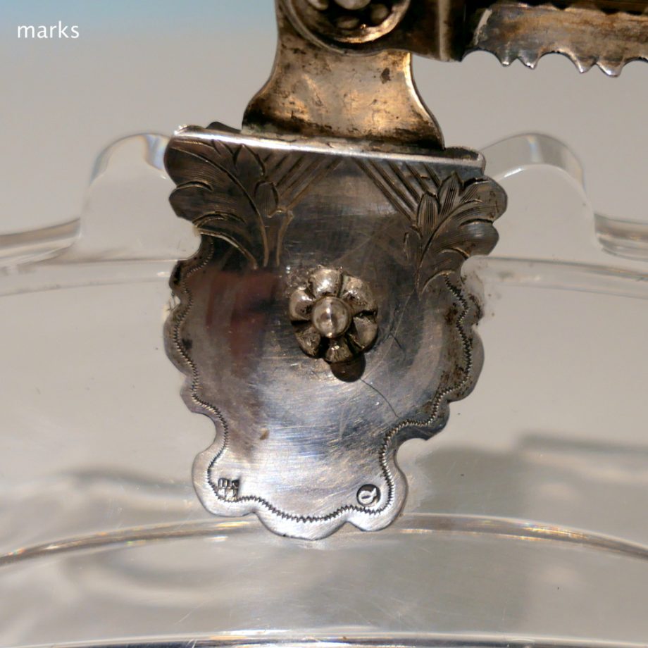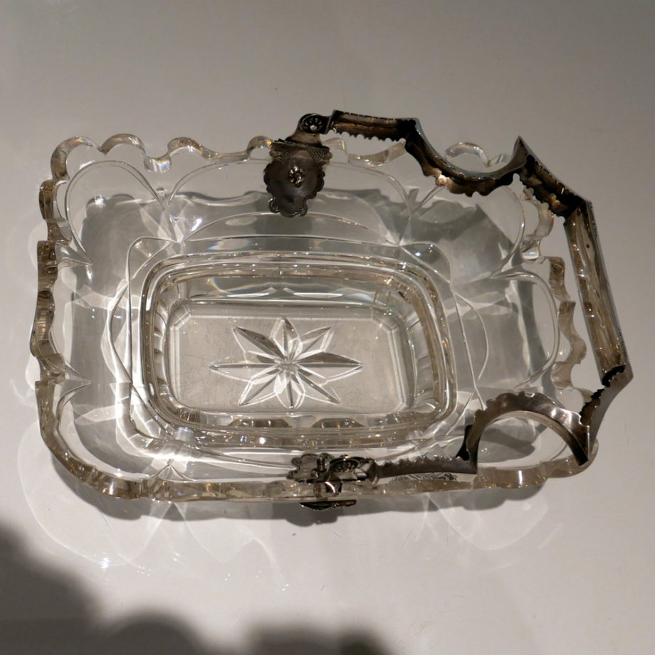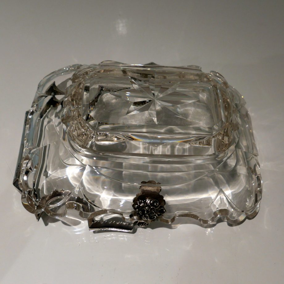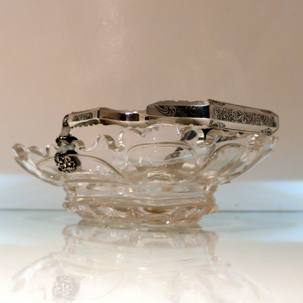 A stylish antique Dutch made silver and crystal cake basket rectangular in design and formed with a ‘wavy’ stylish edge. Â The silver hinged swing handle has elegant intricate hand engraving for highlights.