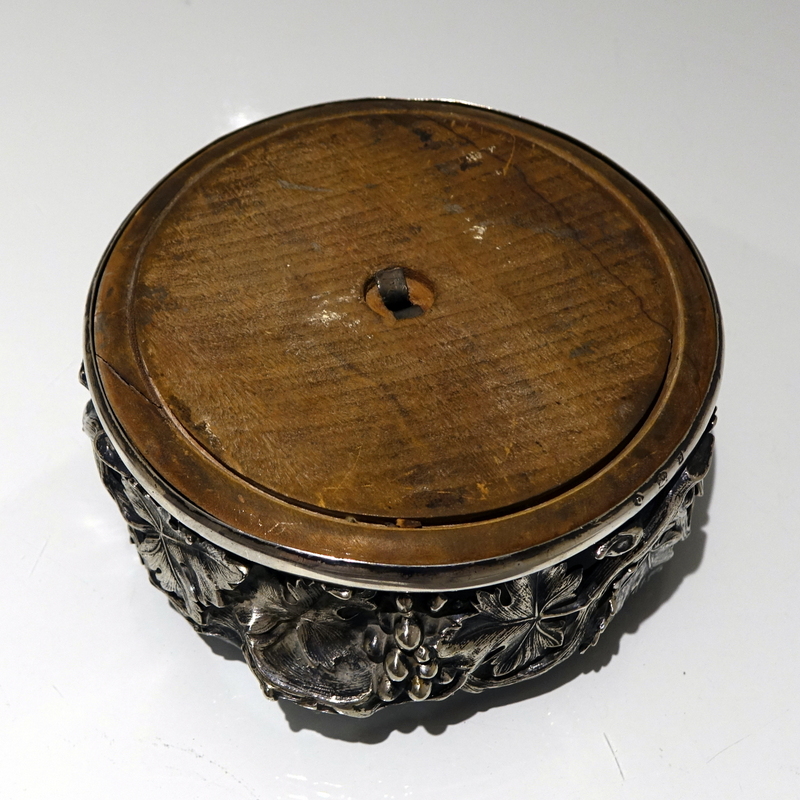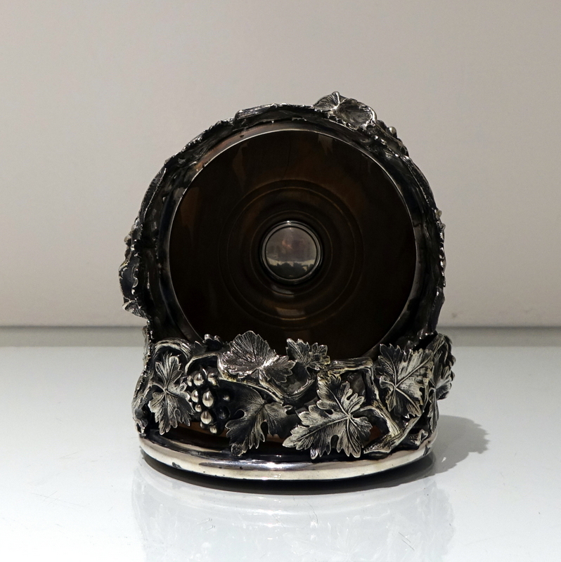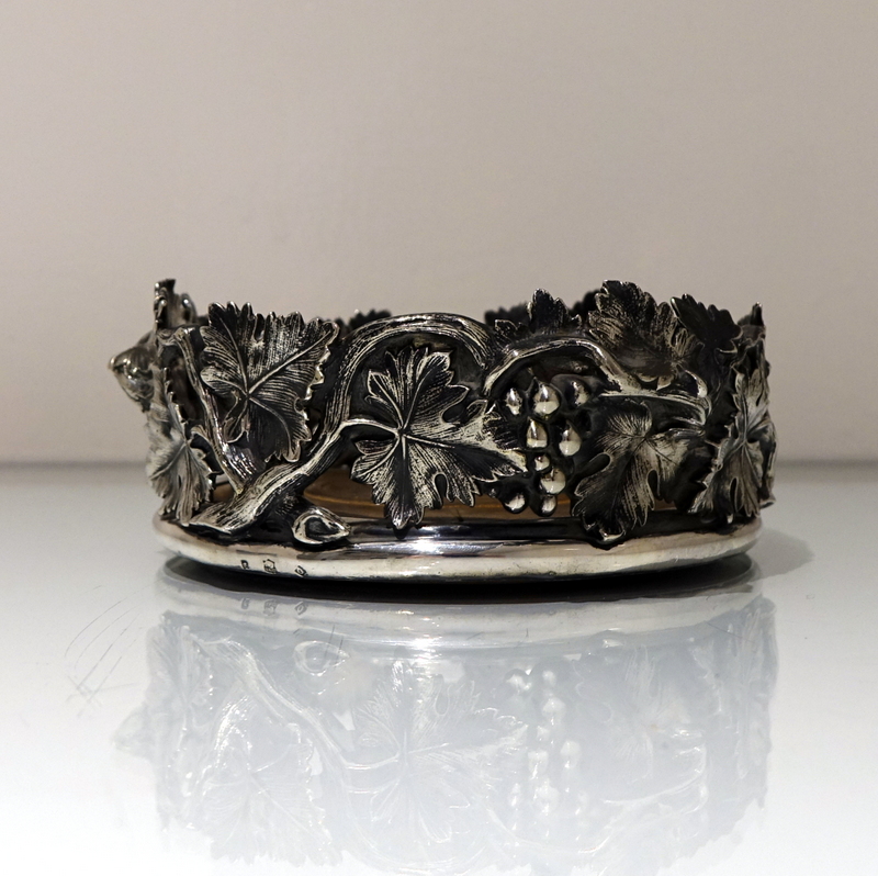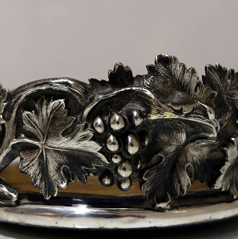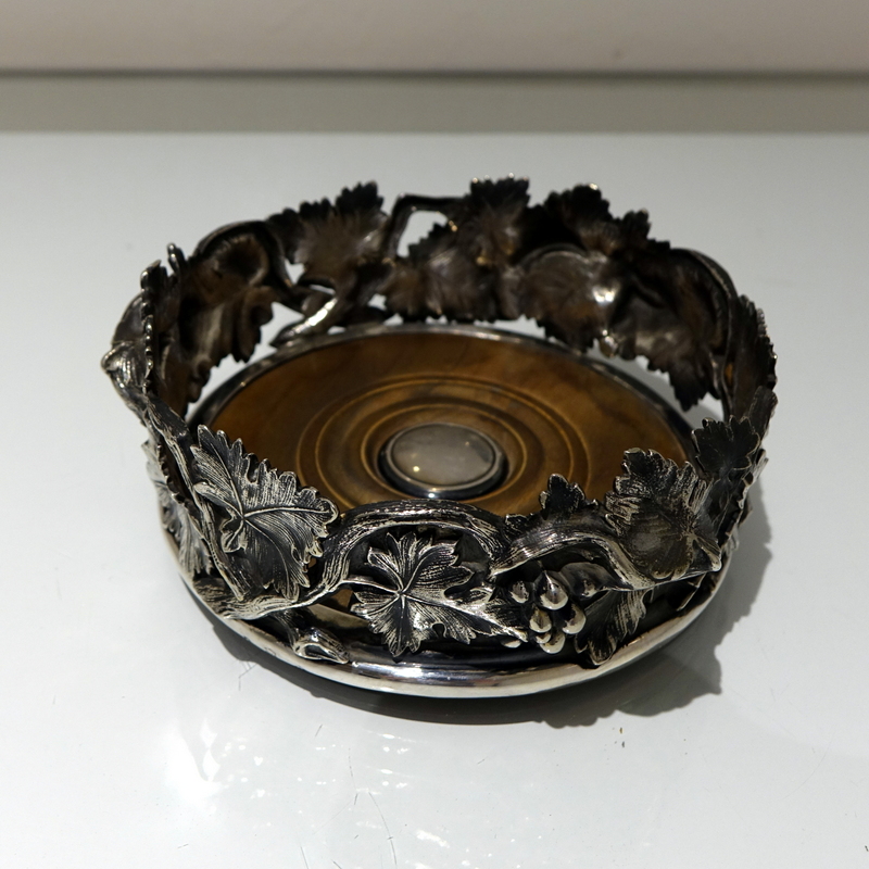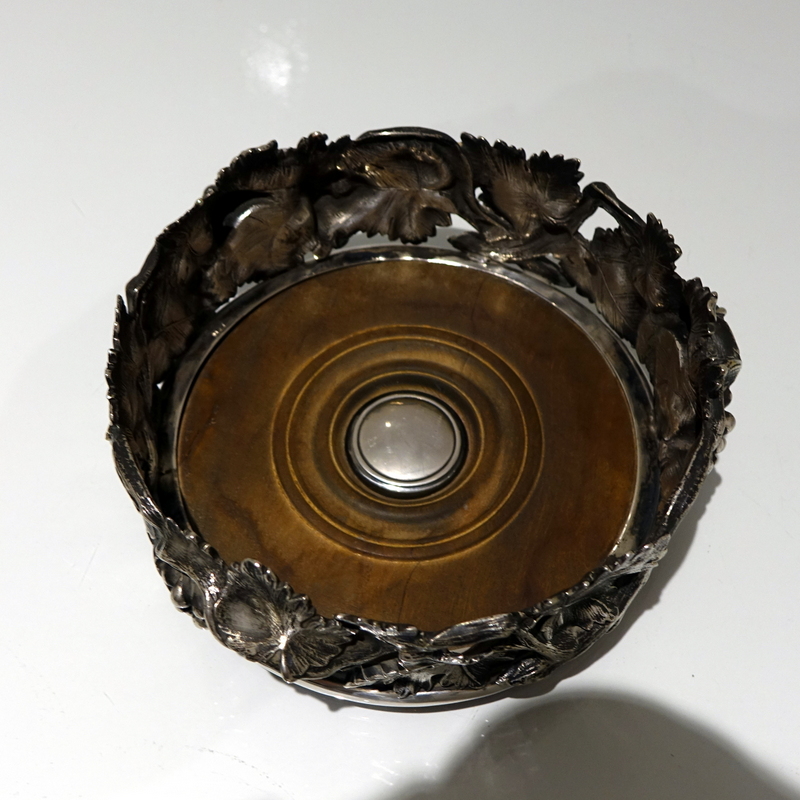 A stunning pair of silver plated Victorian cast grape and vine wine coasters with elegant inner wooden bases which have grooved circular decoration and a silvered button for decorative lowlights