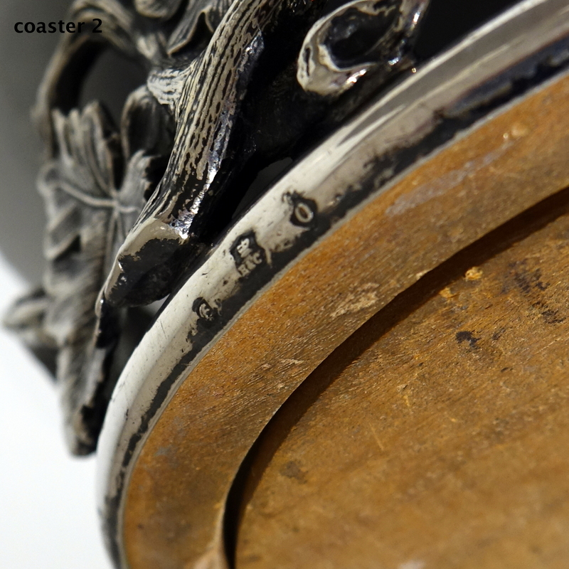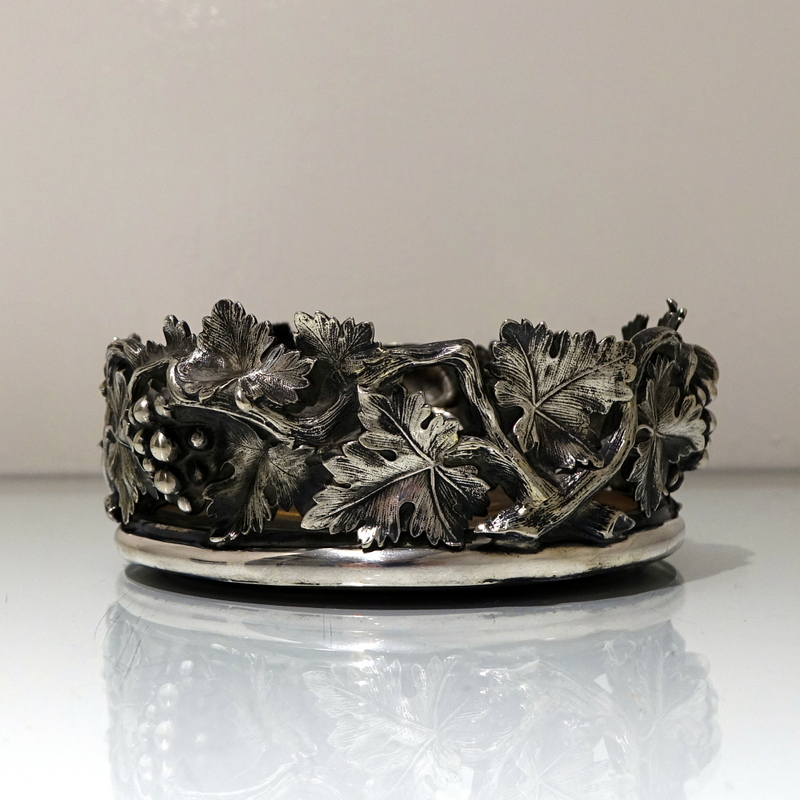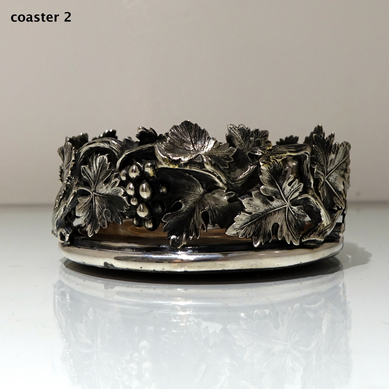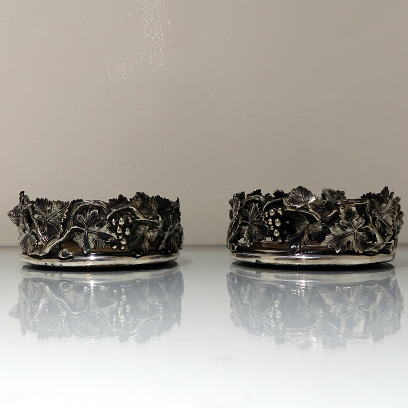 A stunning pair of silver plate Victorian cast grape and vine wine coasters.