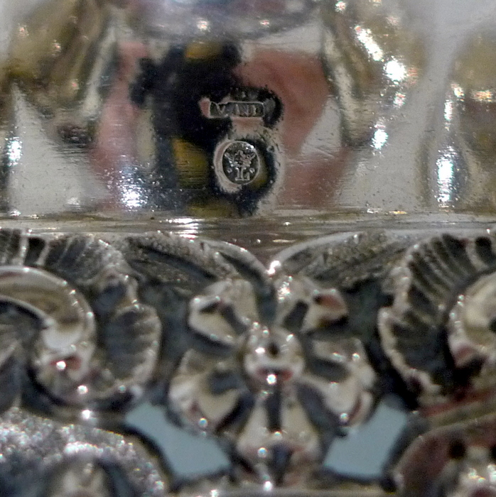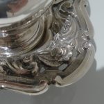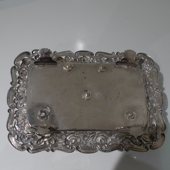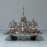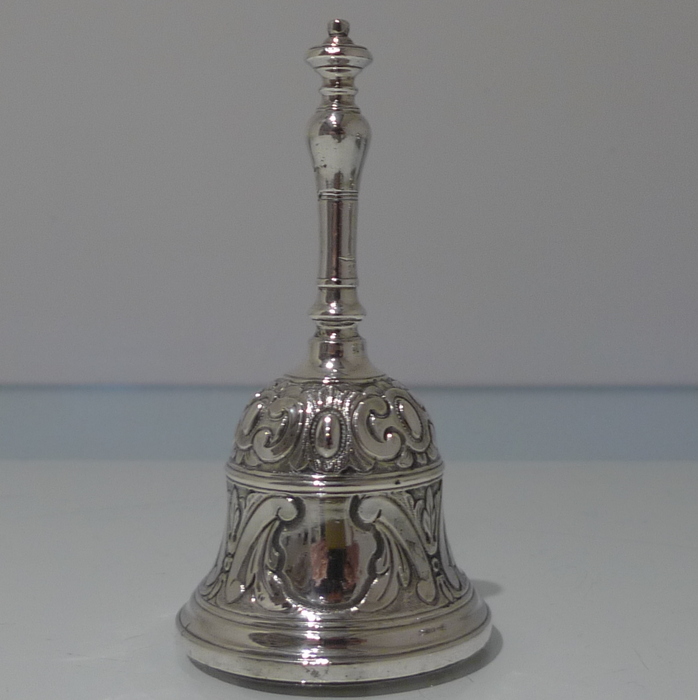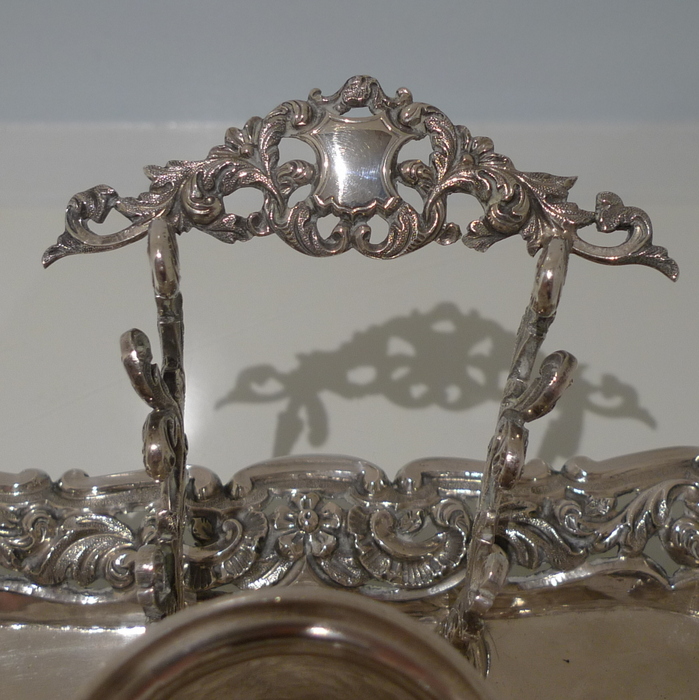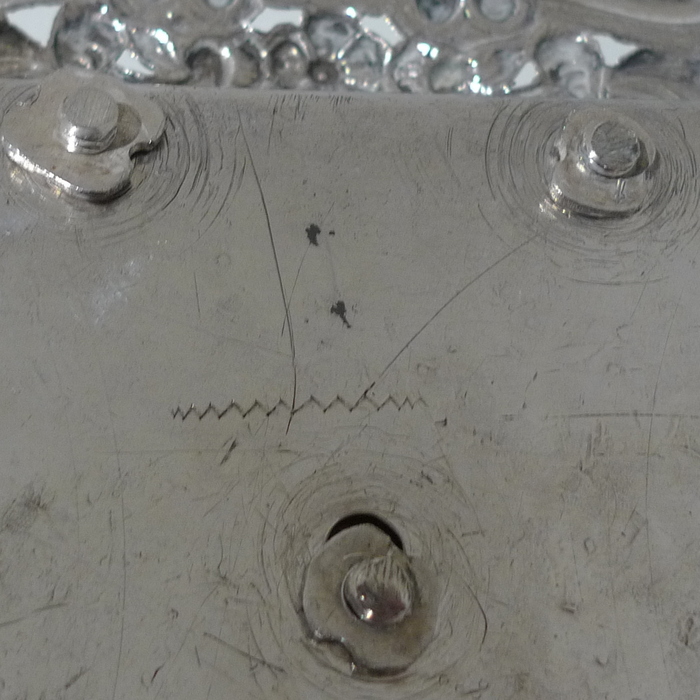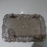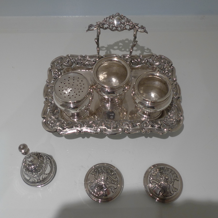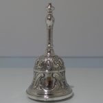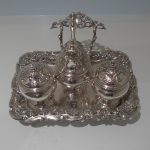 A beautiful early 19th century Portuguese inkstand with pierced ornate floral embossed border for decoration. Â The central compartment is crowned with a stylish bell.