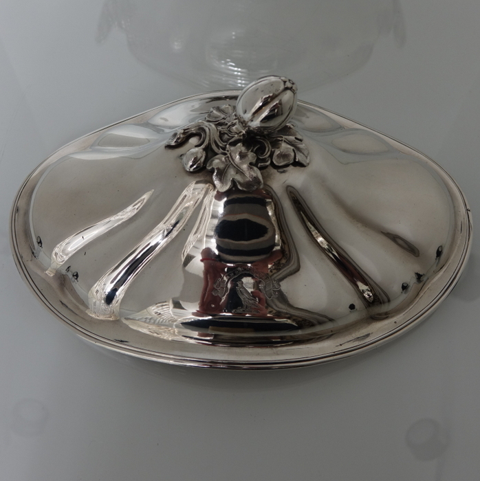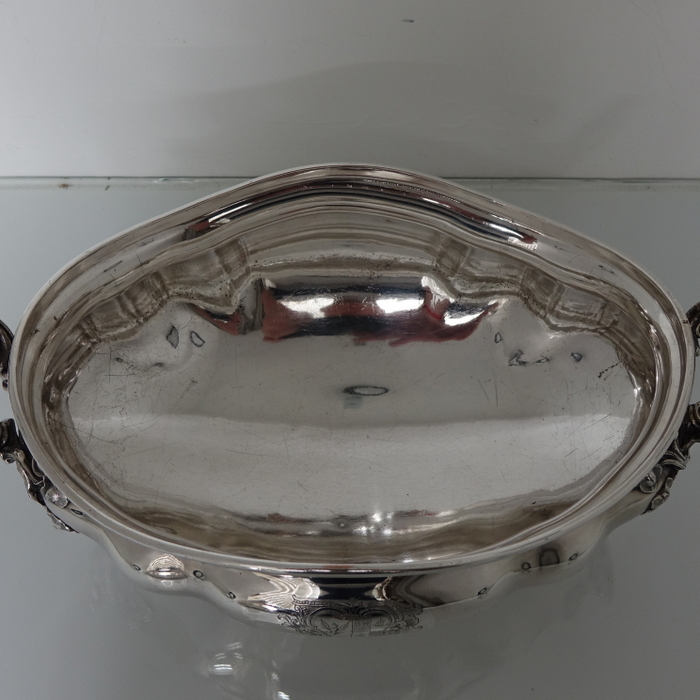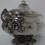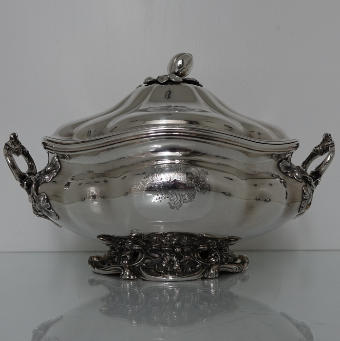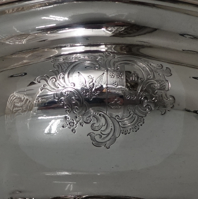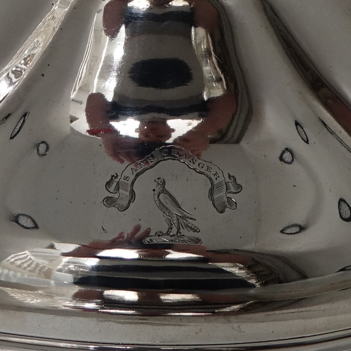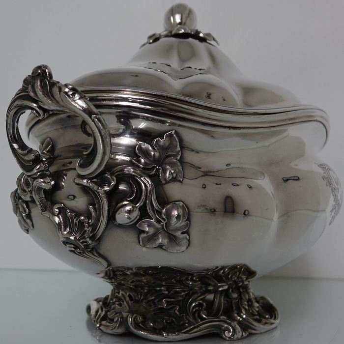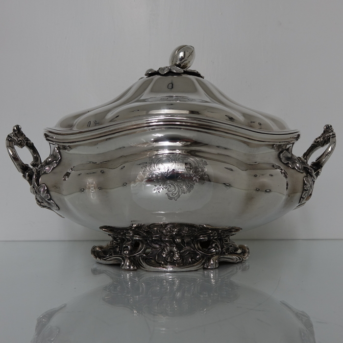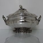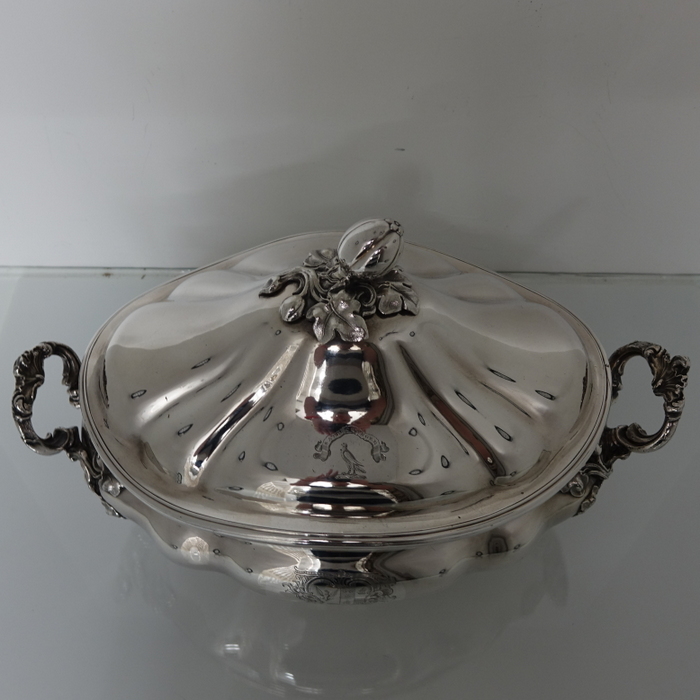 A very fine and extremely rare example of an oval soup tureen with a double silver shield. Â The body of the tureen is stylishly ribbed with two elegant applied applied handles. Â The central front of the soup tureen has a contemporary coat of arms for importance. Â The lid is detachable and has a contemporary crest and is crowned with a beautiful acorn finial. Â The foot of the tureen is stunningly crafted with a floral and foliage theme.