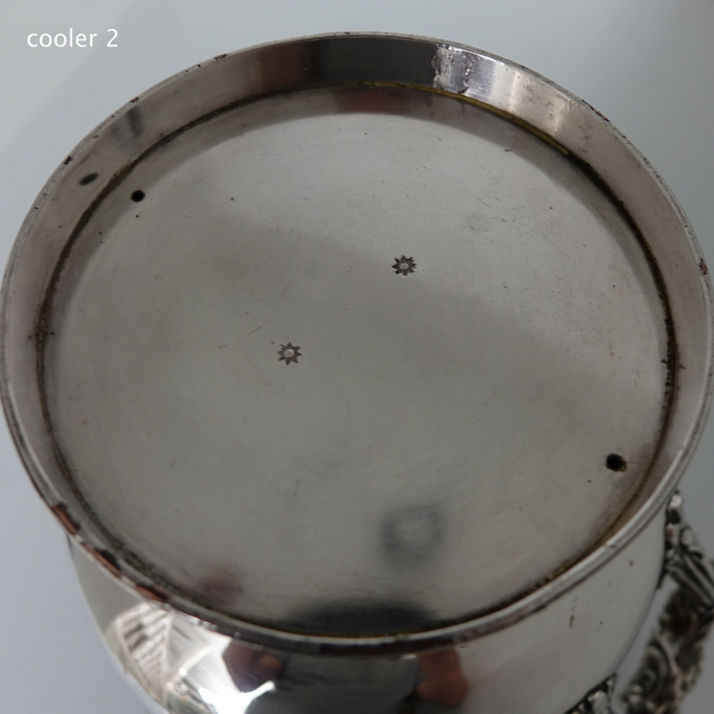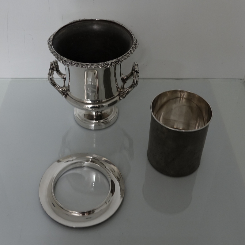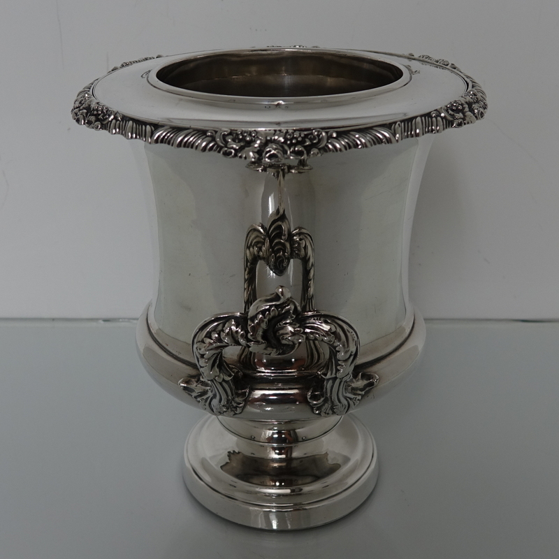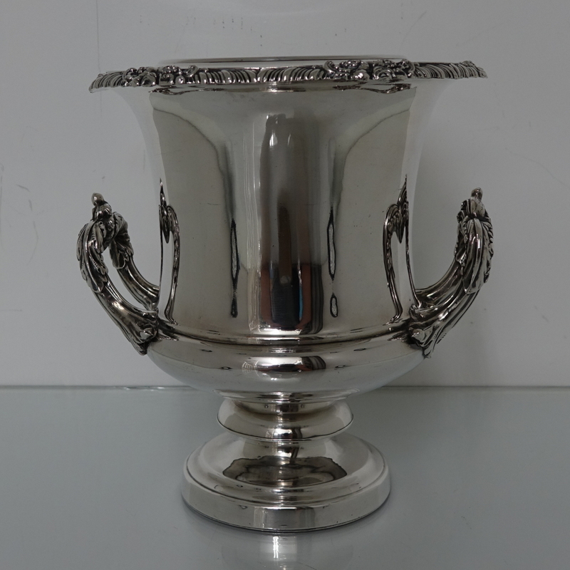 A very impressive and highly collectable pair of campana shaped wine coolers with shaped floral, grape and gadroon border for highlights. The coolers are plain formed and sit on a circular raised pedestal foot with two ornate applied handles for additional highlights. The center has a very elegant armorial. The inner sleeve of the wine coolers is detachable.