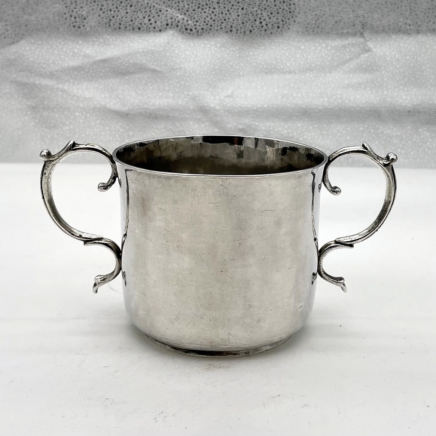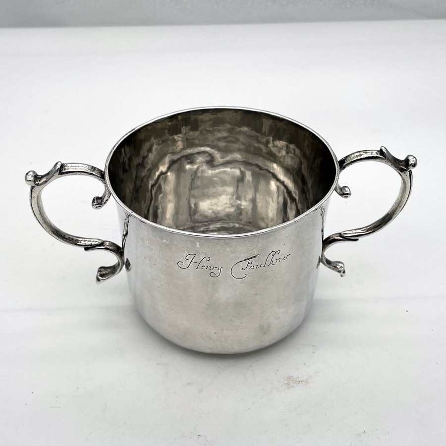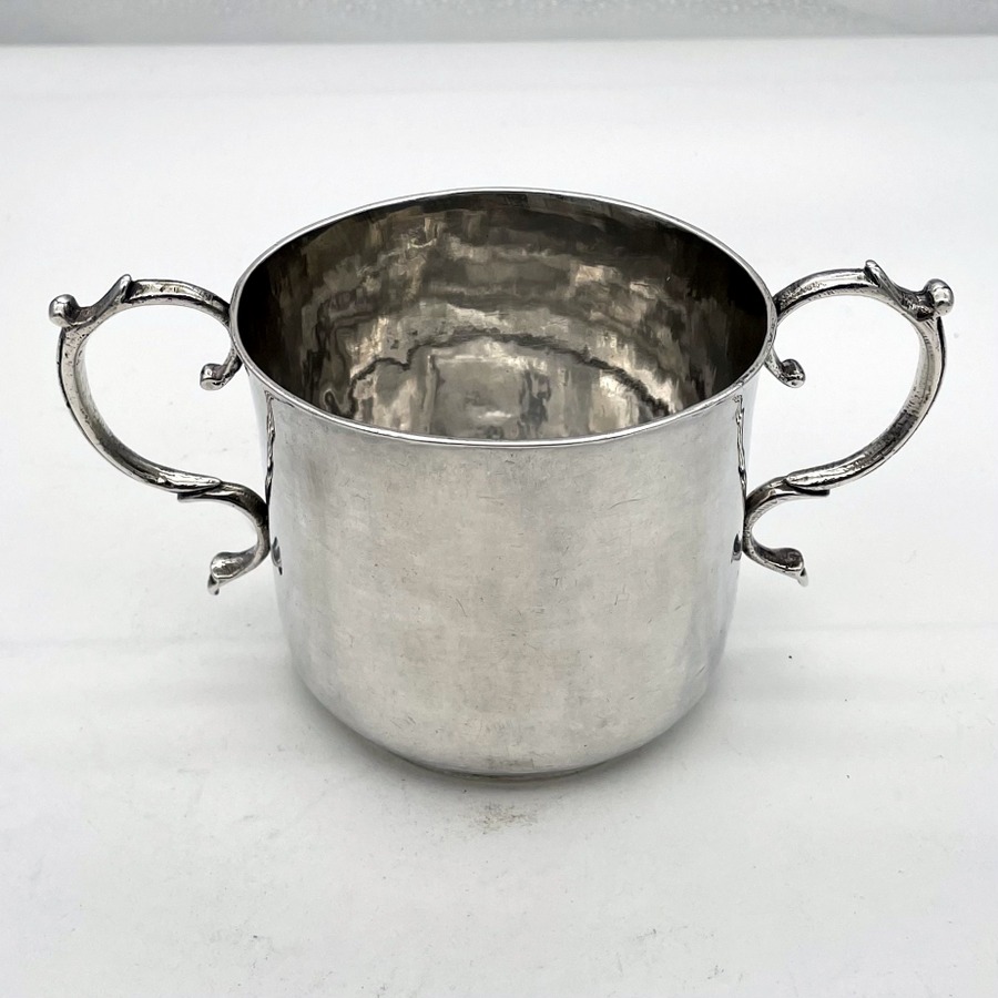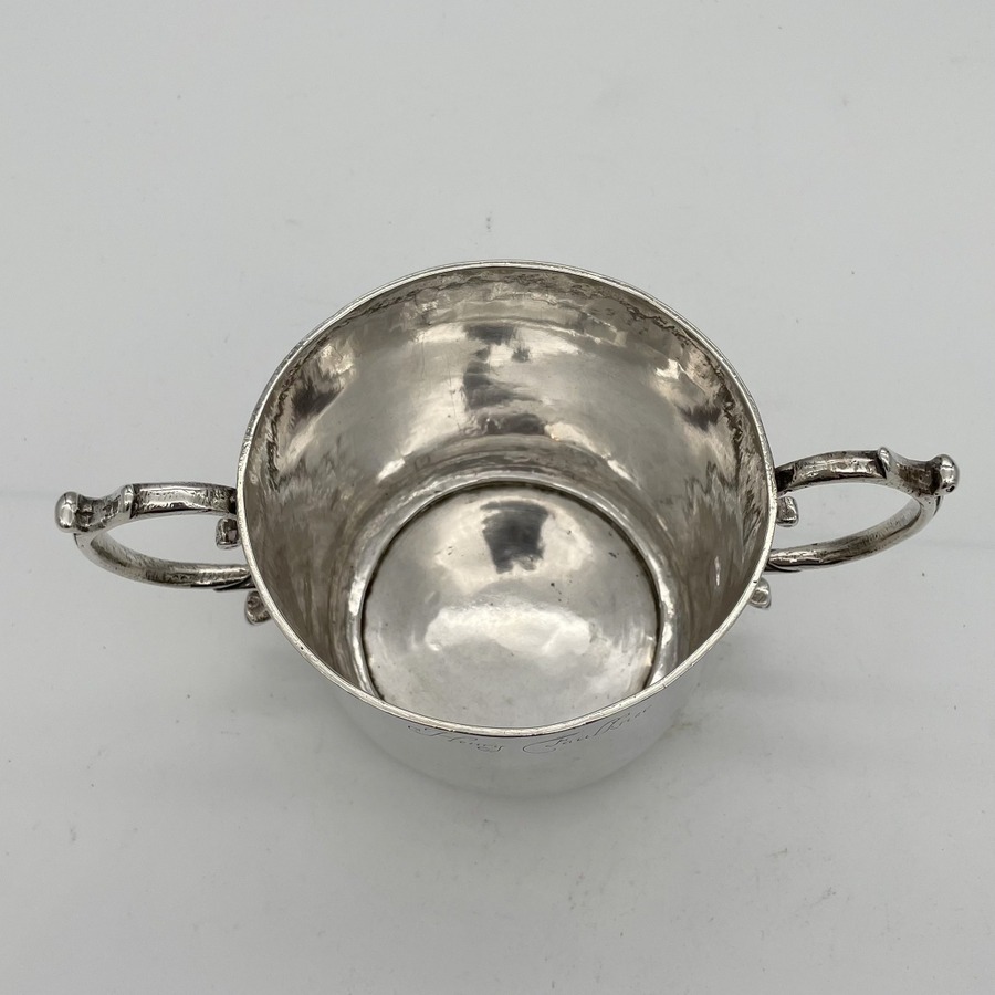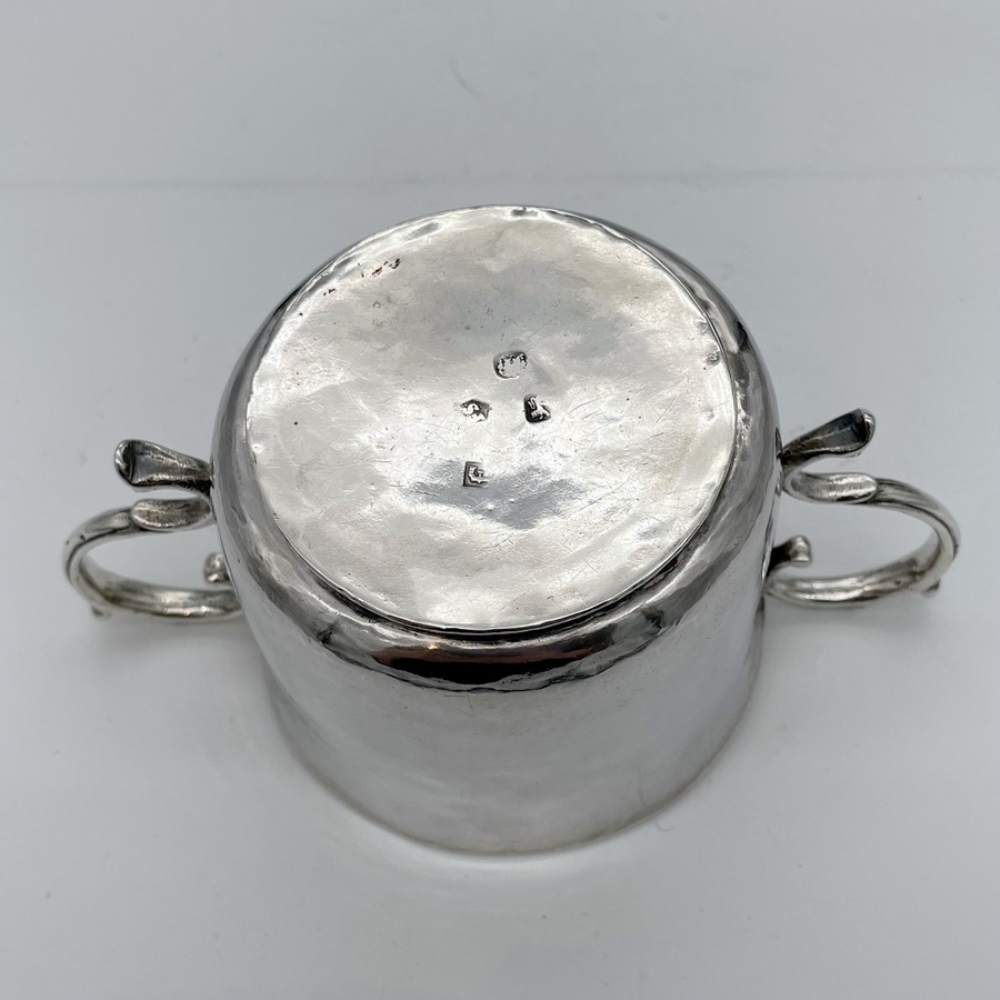 A truly fine Charles II silver porringer designed with a beautifully shaped plain formed bowl and two stylish applied scroll handles. Â The wonderfully hammered bowl has a pristine patina and a sweet presentational contemporary hand engraved inscription.