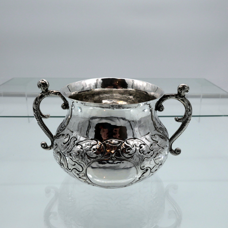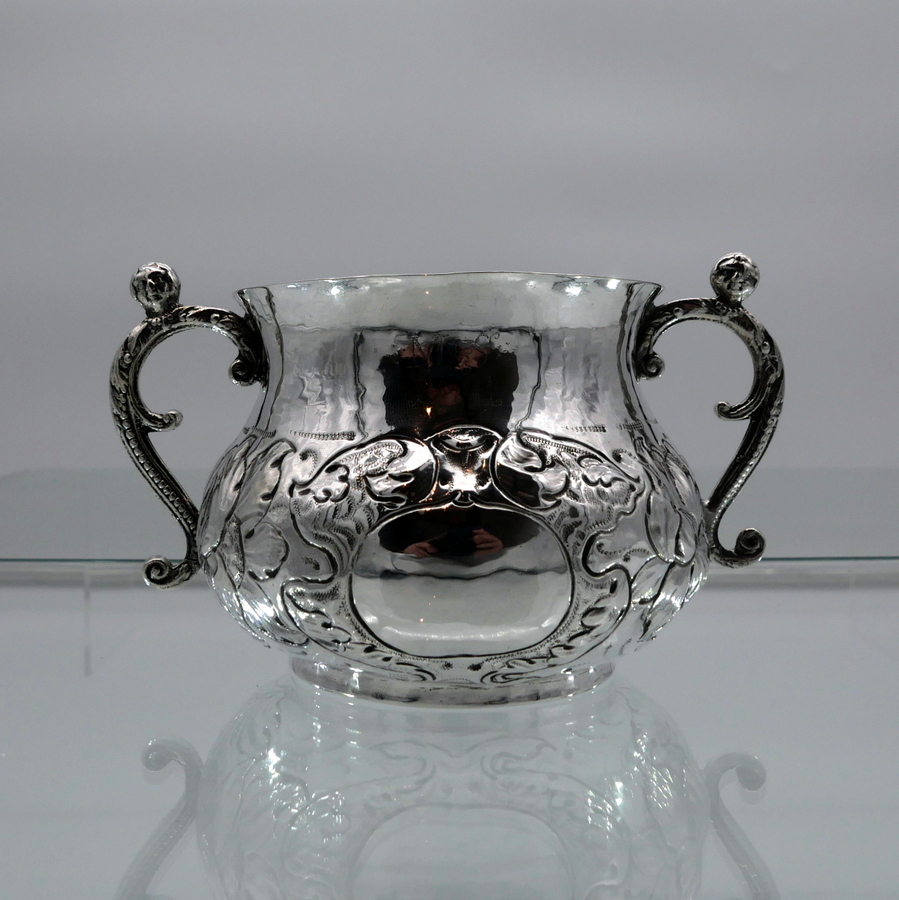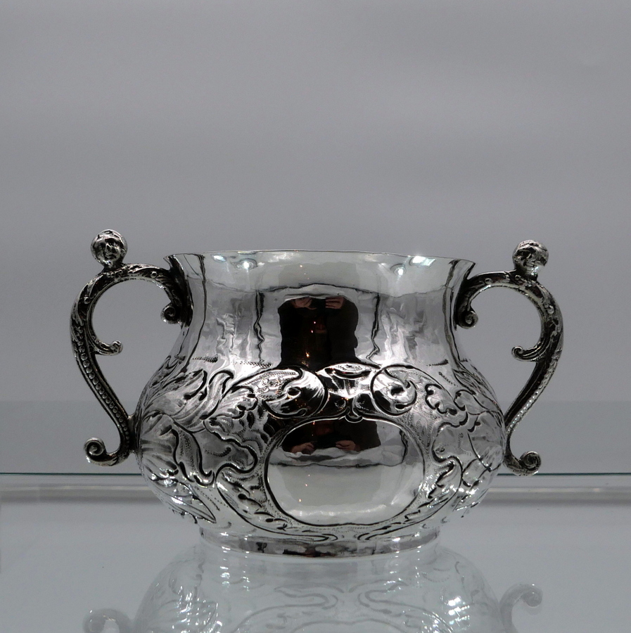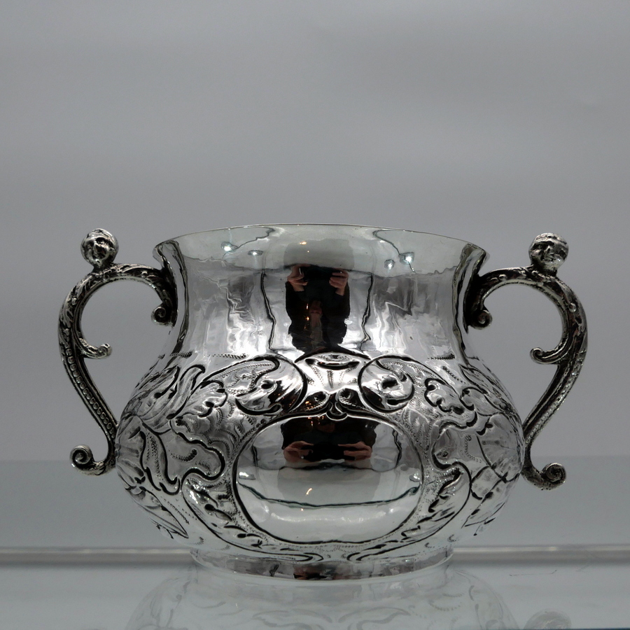 A rare and highly collectable 17th century Charles II porringer decorated with elegant floral embellishing to the lower bowl that also incorporates oval cartouches for lowlights. The handles are caryatid scroll form and there are contemporary pin pricked engraved initials for importance.