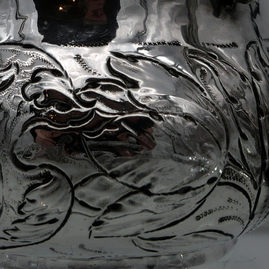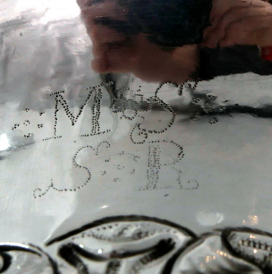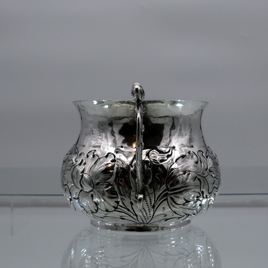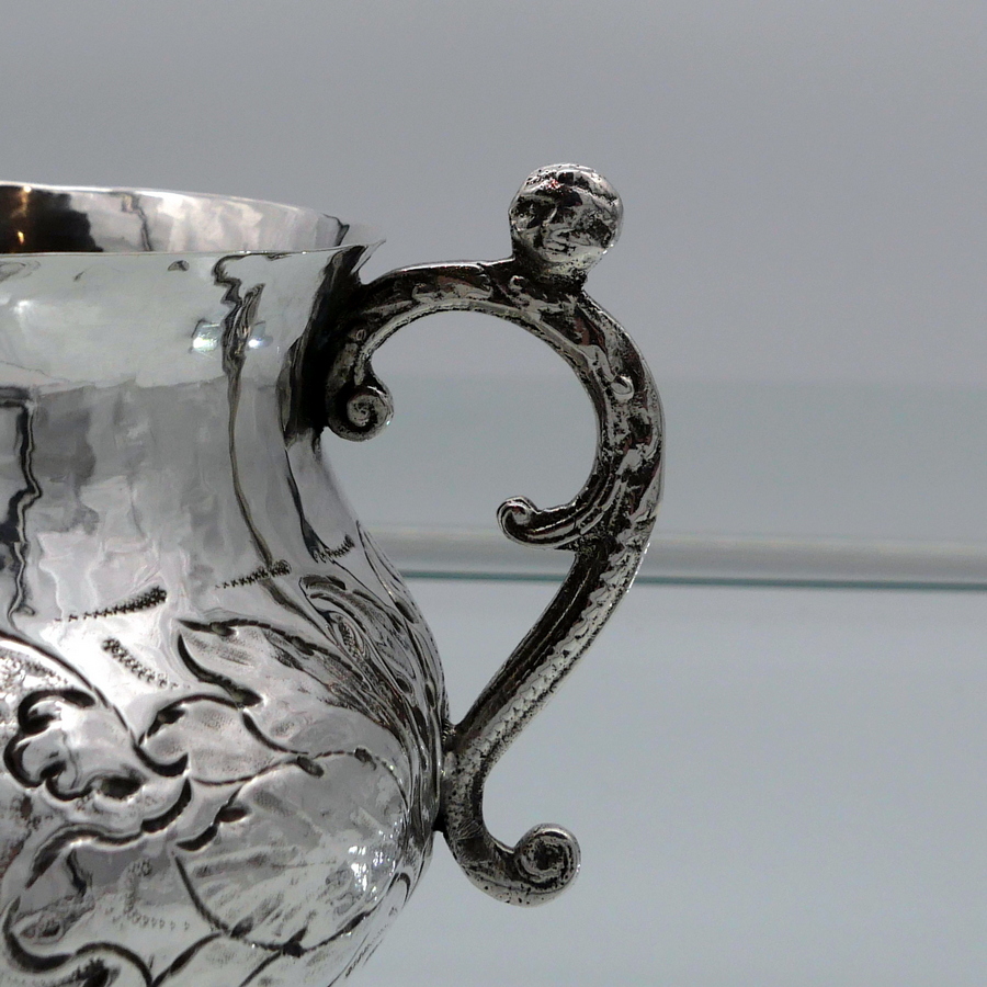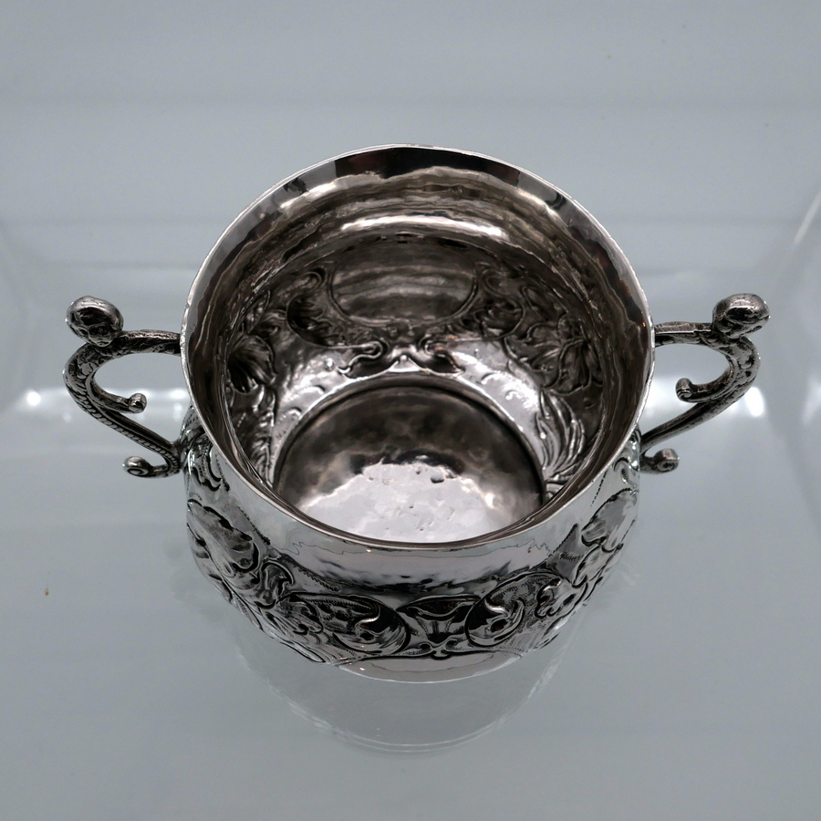 A rare and highly collectable 17th century Charles II porringer decorated with elegant floral embellishing to the lower bowl that also incorporates oval cartouches for lowlights. The handles are caryatid scroll form and there are contemporary pin pricked engraved initials for importance.