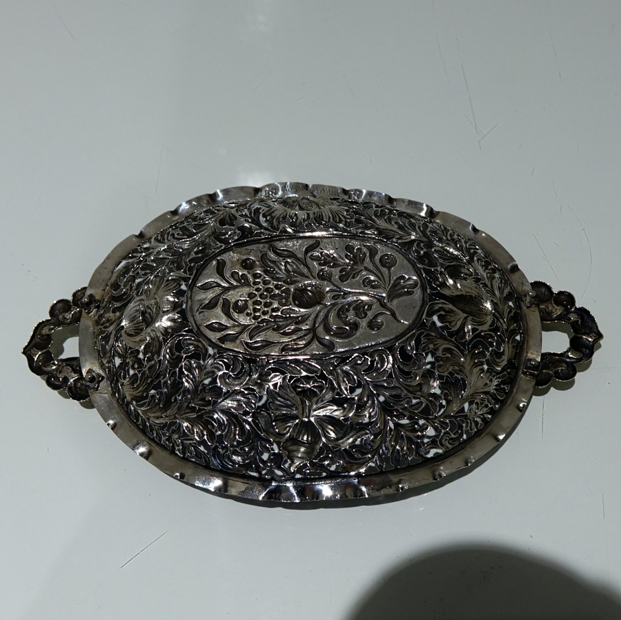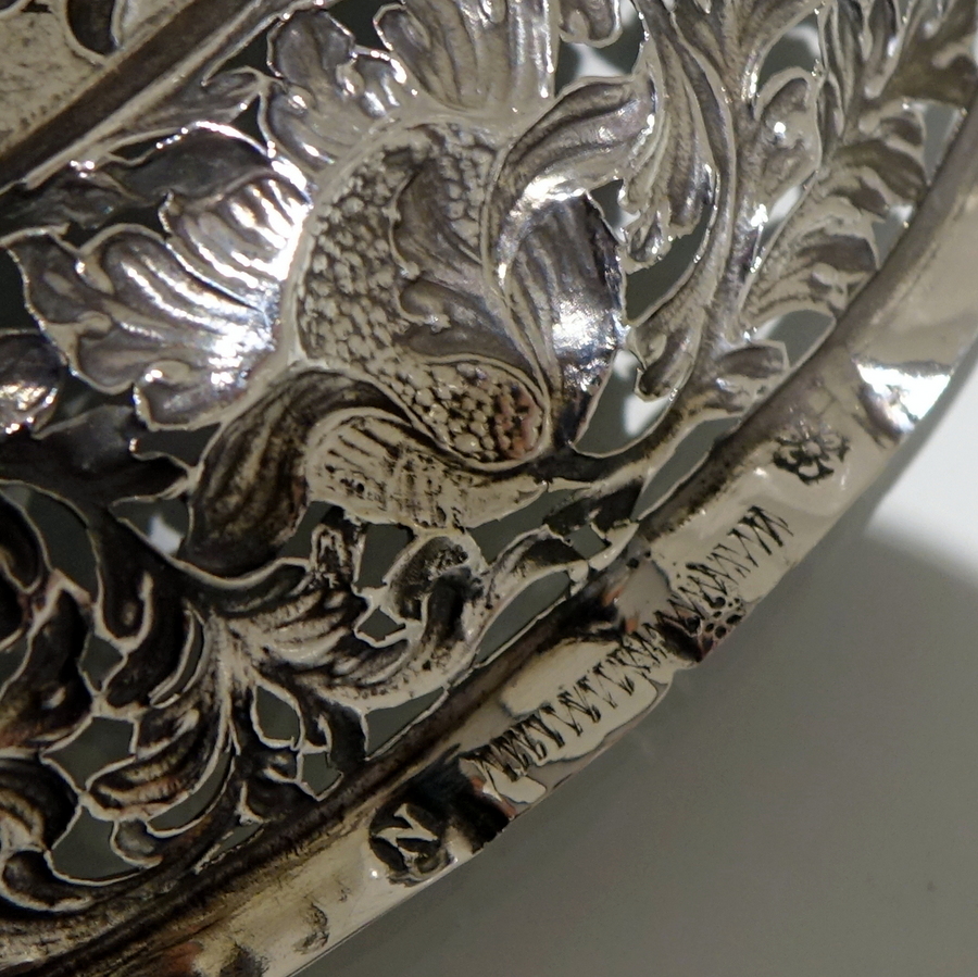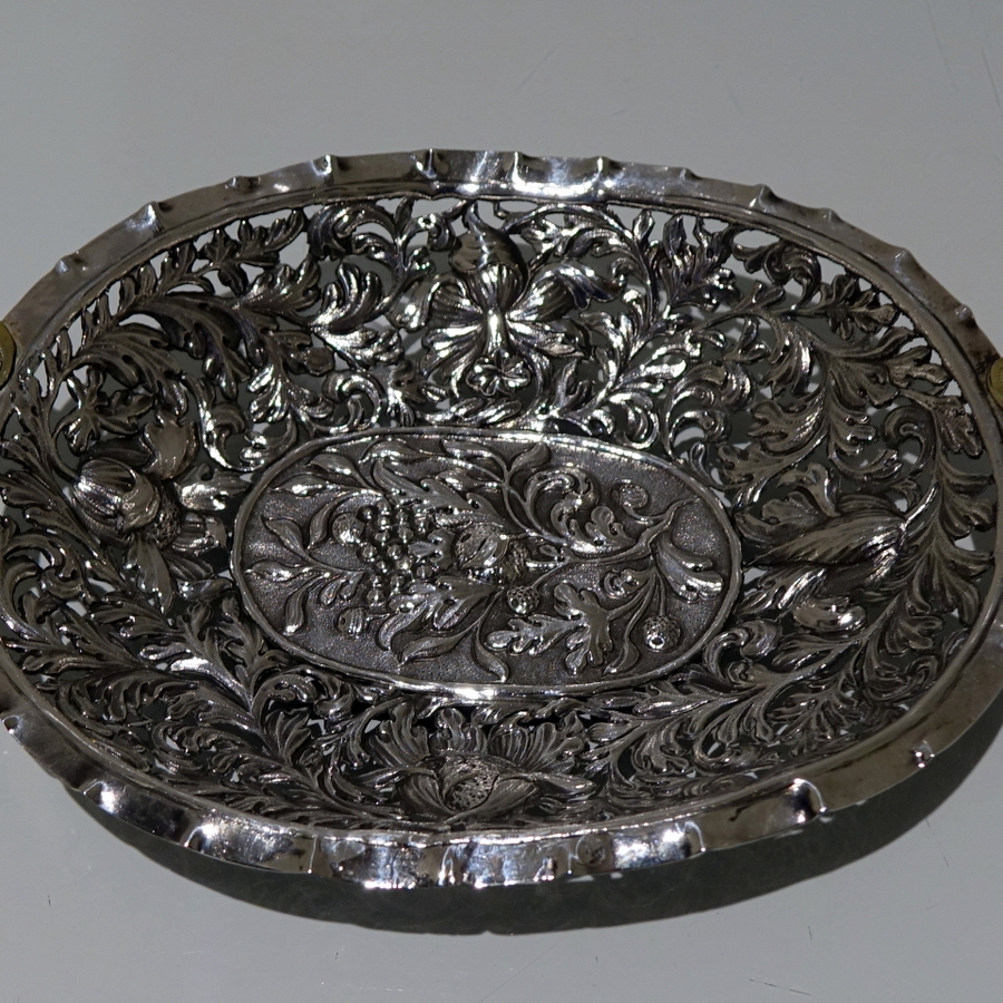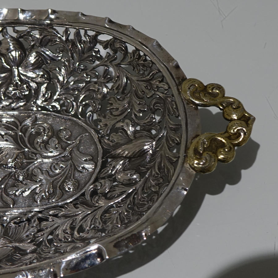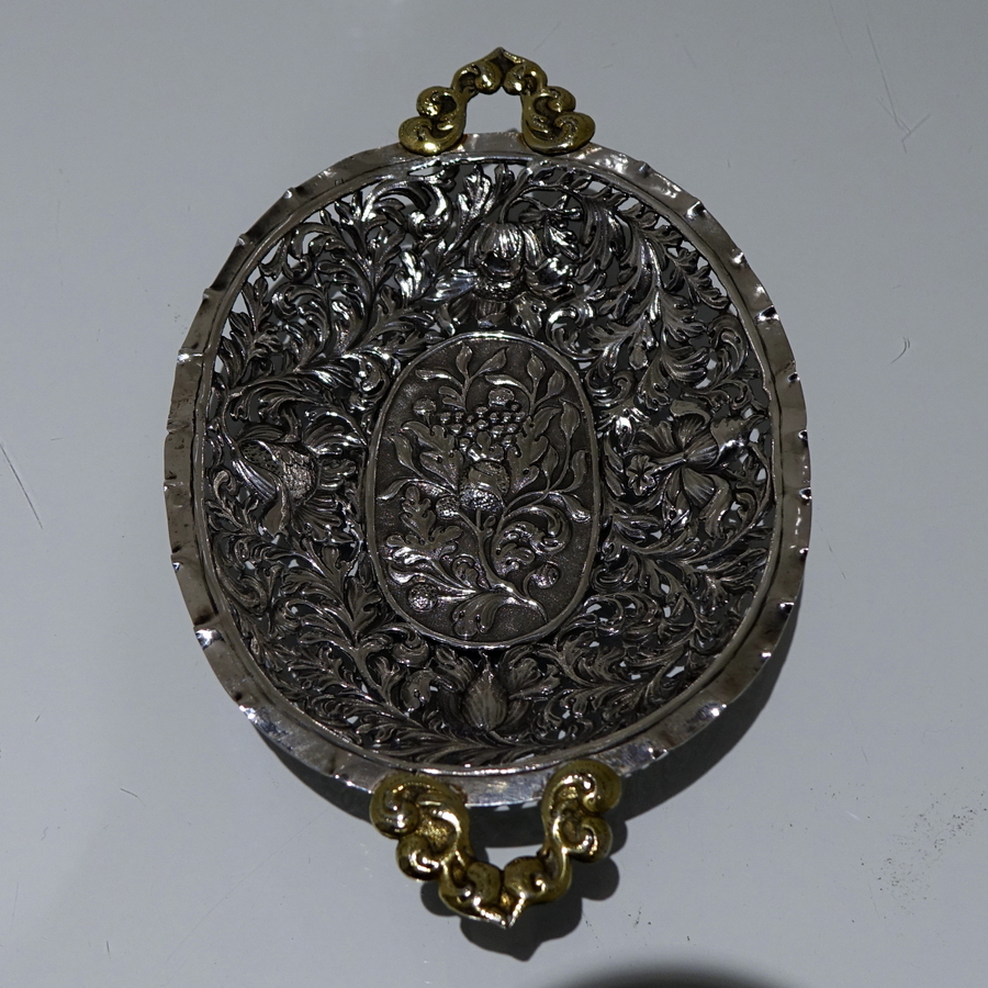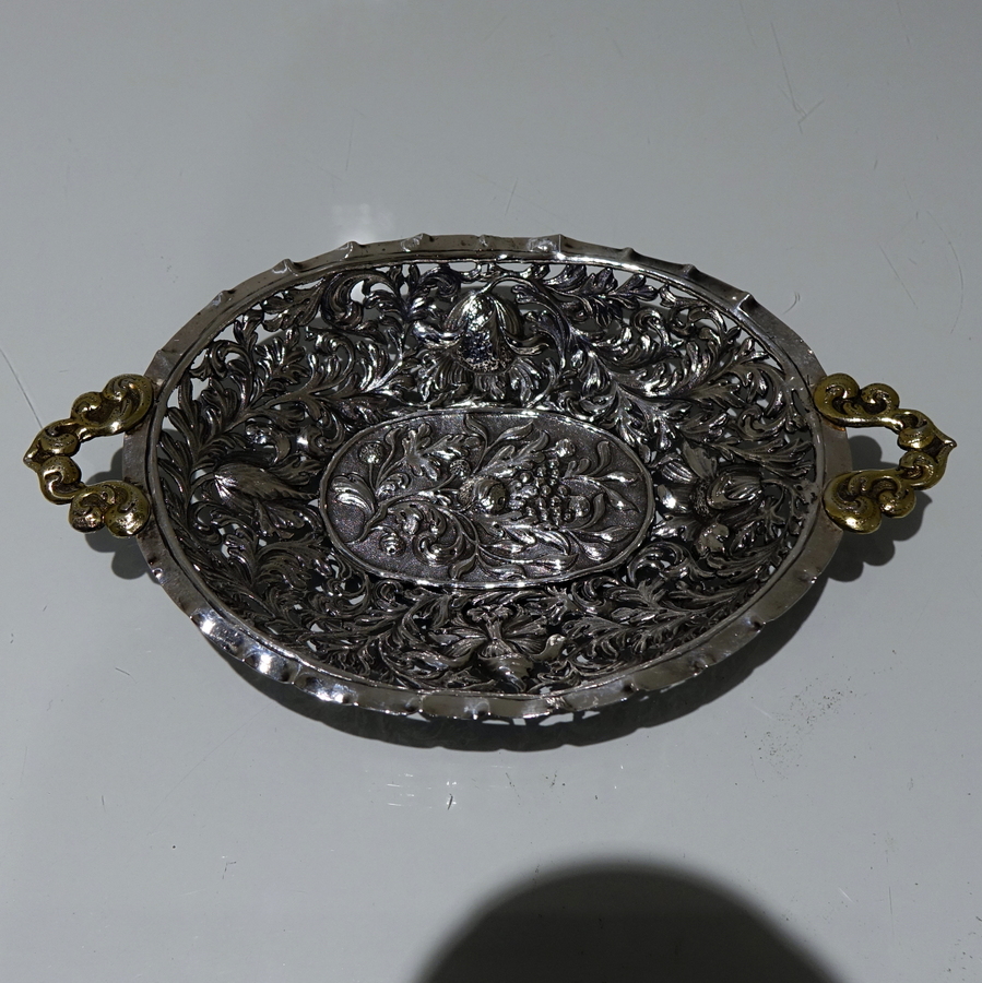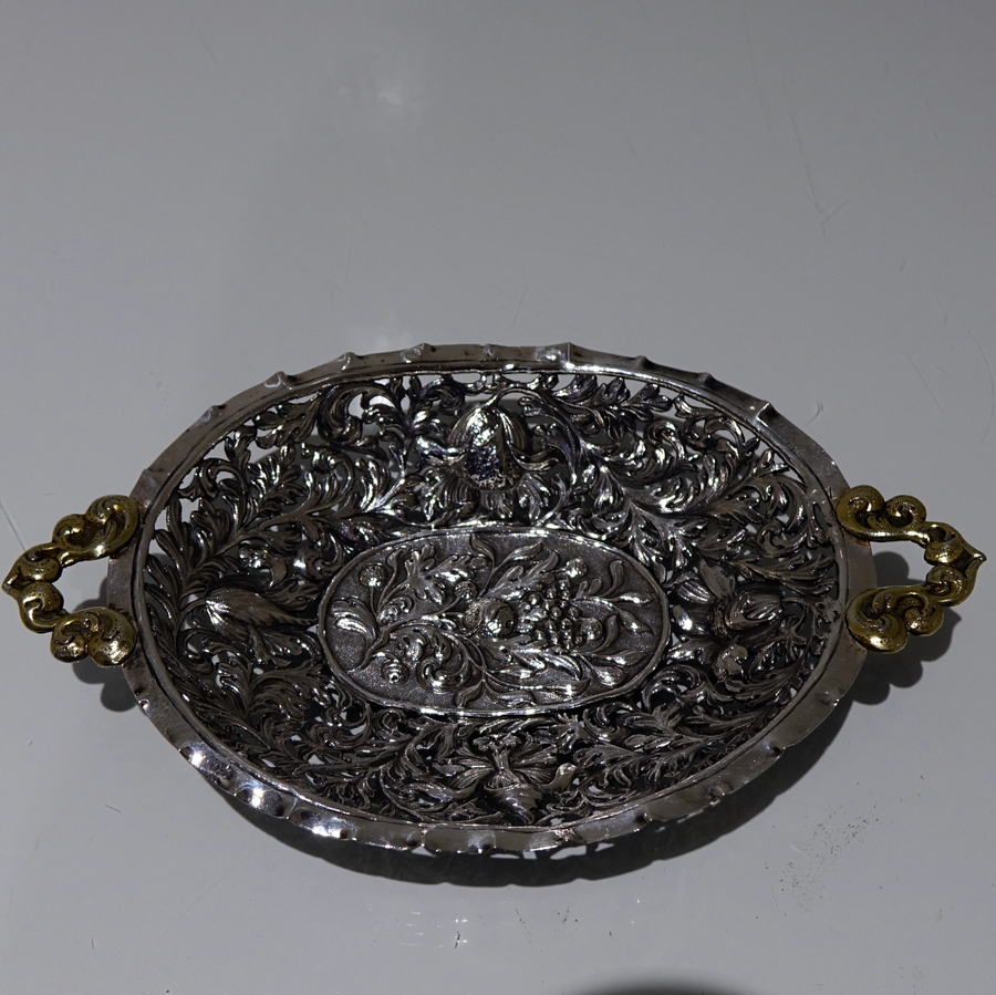 A very early and highly collectable silver dish decorated with elegant floral hand chasing which is entwined within stylish hand piercing. Â The elegant handles have been gilded for decorative contrast.