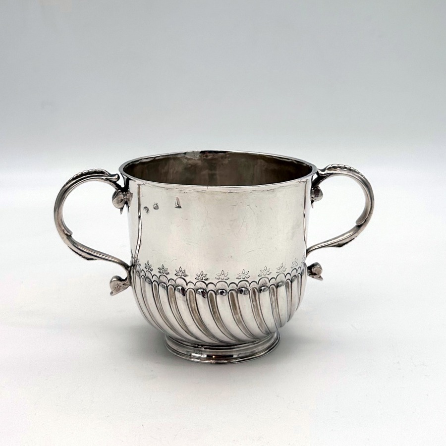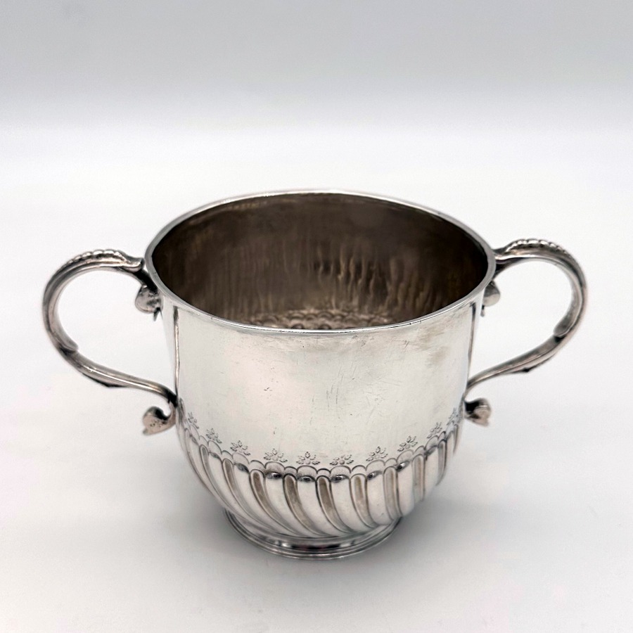Rare and incredibly fine 17th century half swirl fluted porringer decorated with stylish pin prick floral motifs and designed with elegant wire work scroll handles capped with simple but elegant bead thumbpieces.
