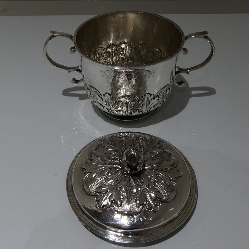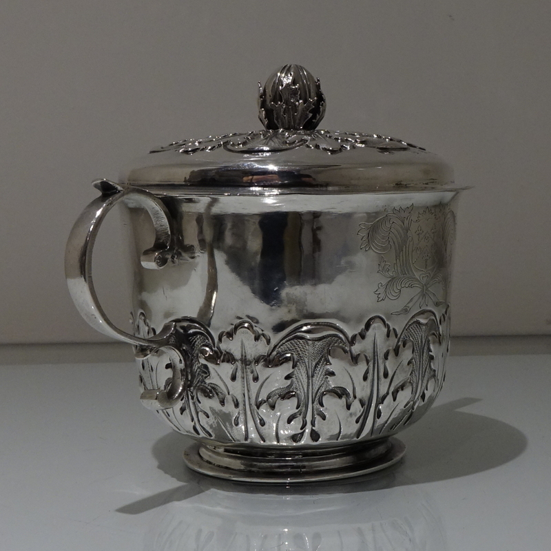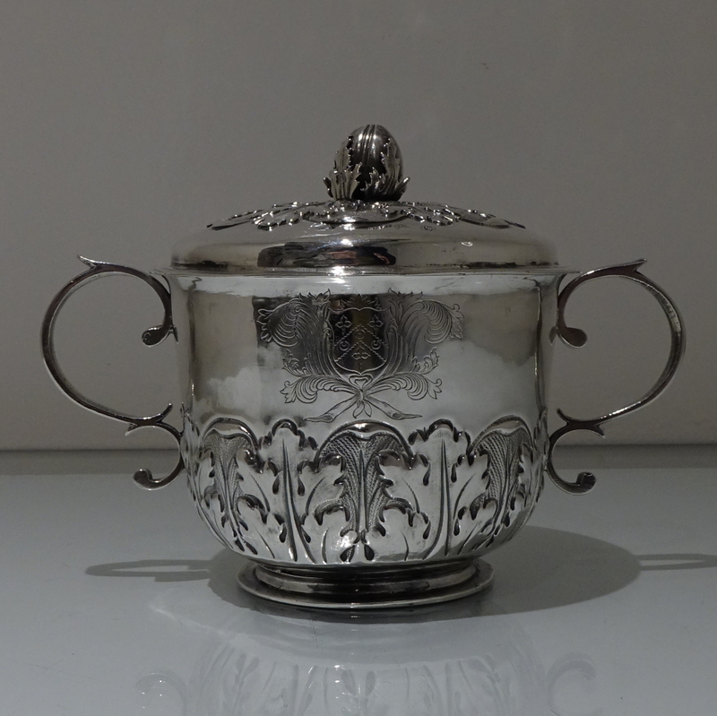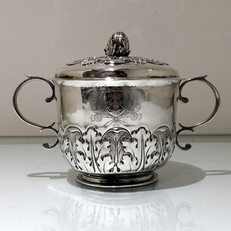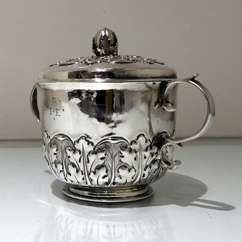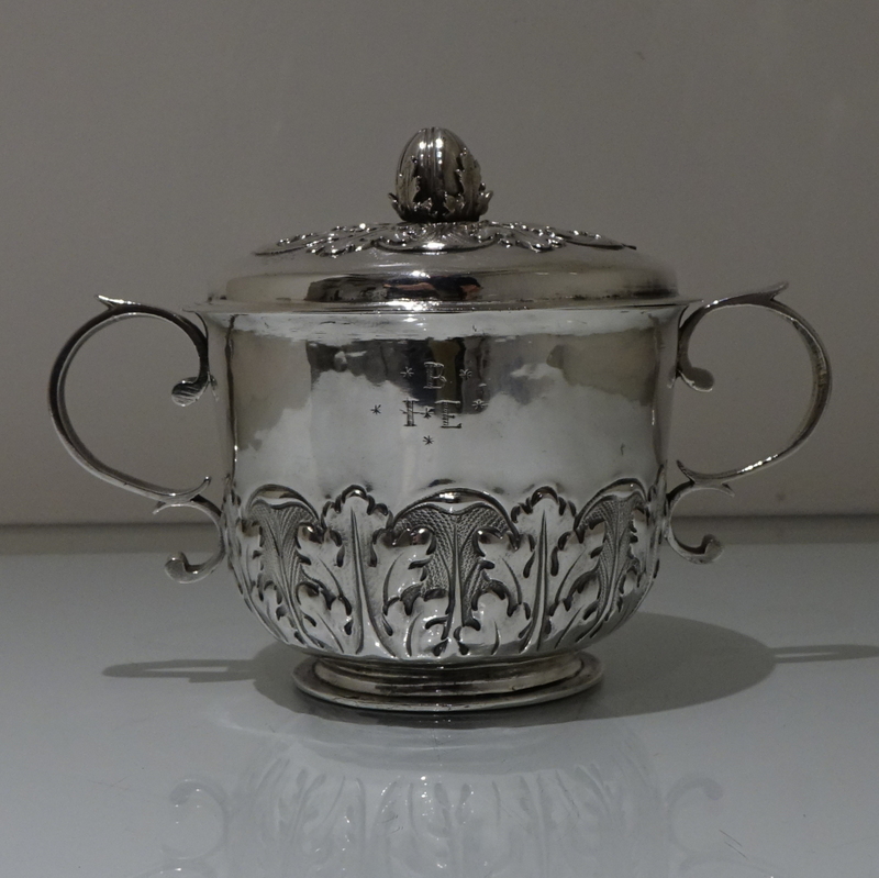 A stunning James II silver porringer and cover decorated with elegant acanthus leaf designs to the lower bowl. Â The centre front and back have elegant contemporary armorial/initials for importance. Â The ornate lid is detachable and crowned with a decorative finial.
