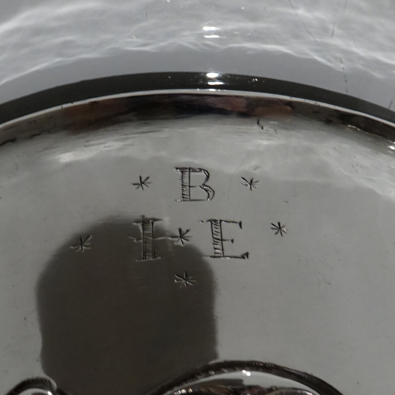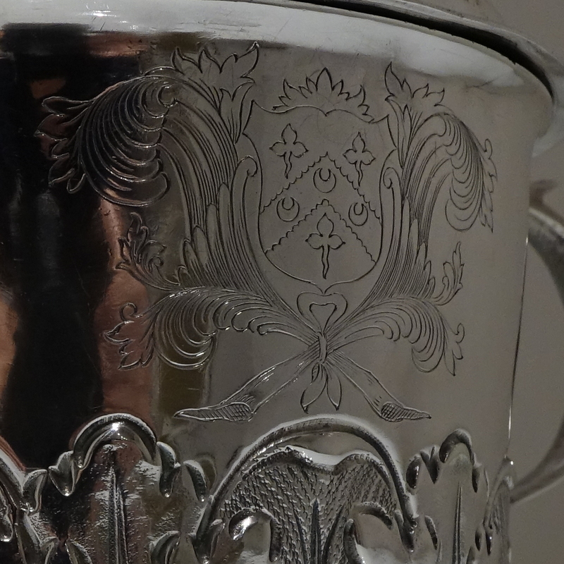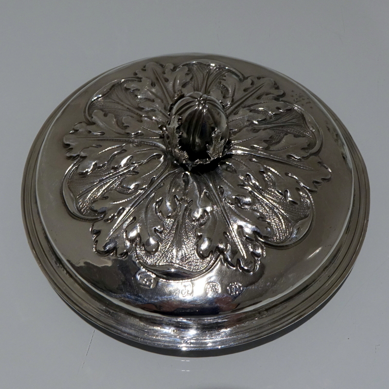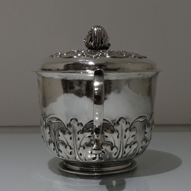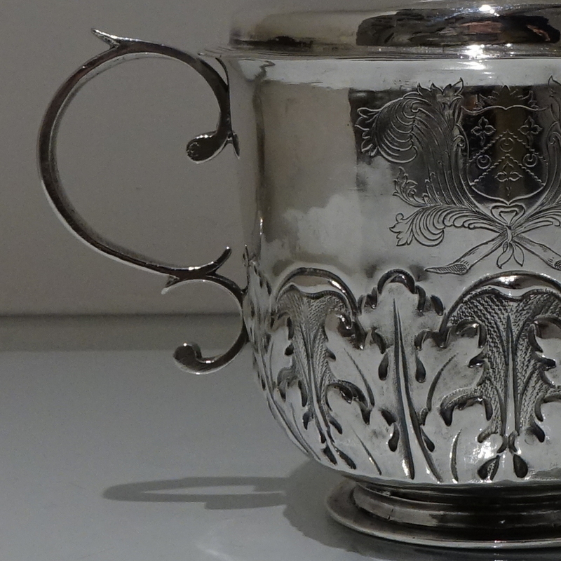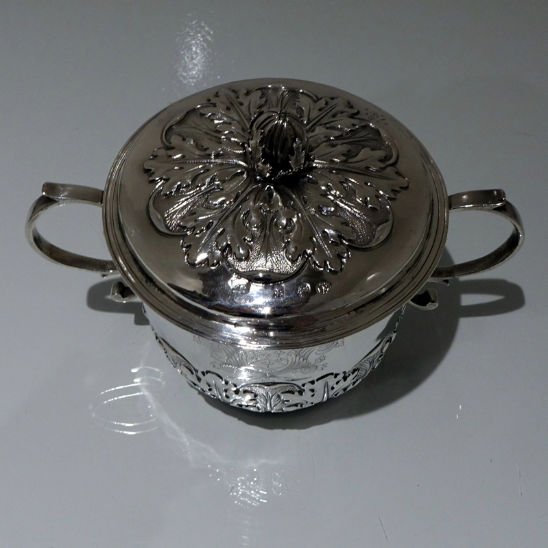A stunning James II silver porringer and cover decorated with elegant acanthus leaf designs to the lower bowl. Â The centre front and back have elegant contemporary armorial/initials for importance. Â The ornate lid is detachable and crowned with a decorative finial.