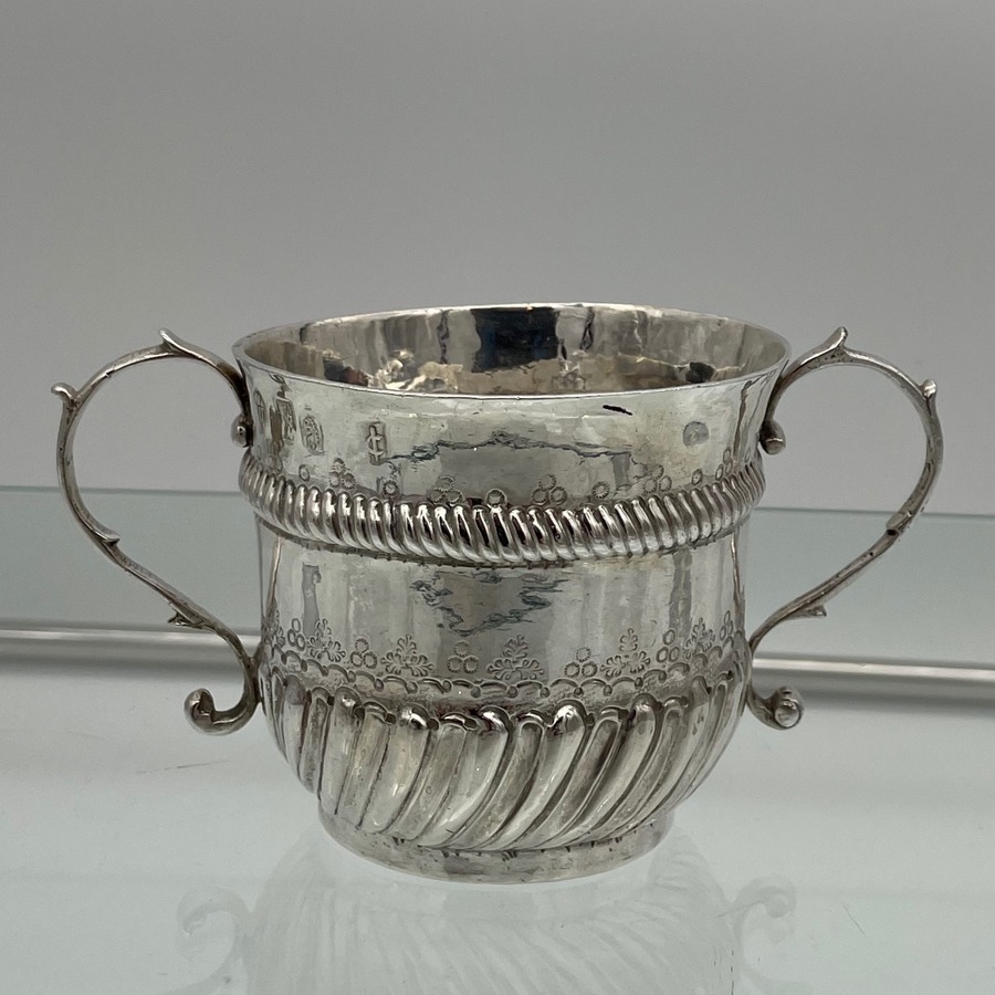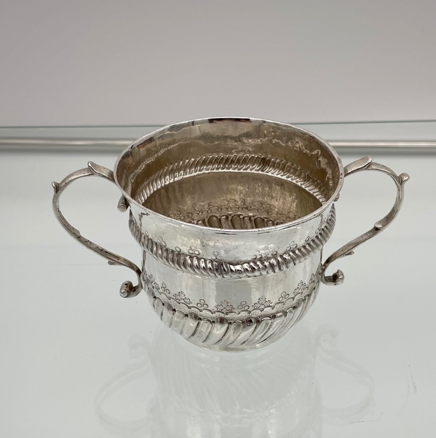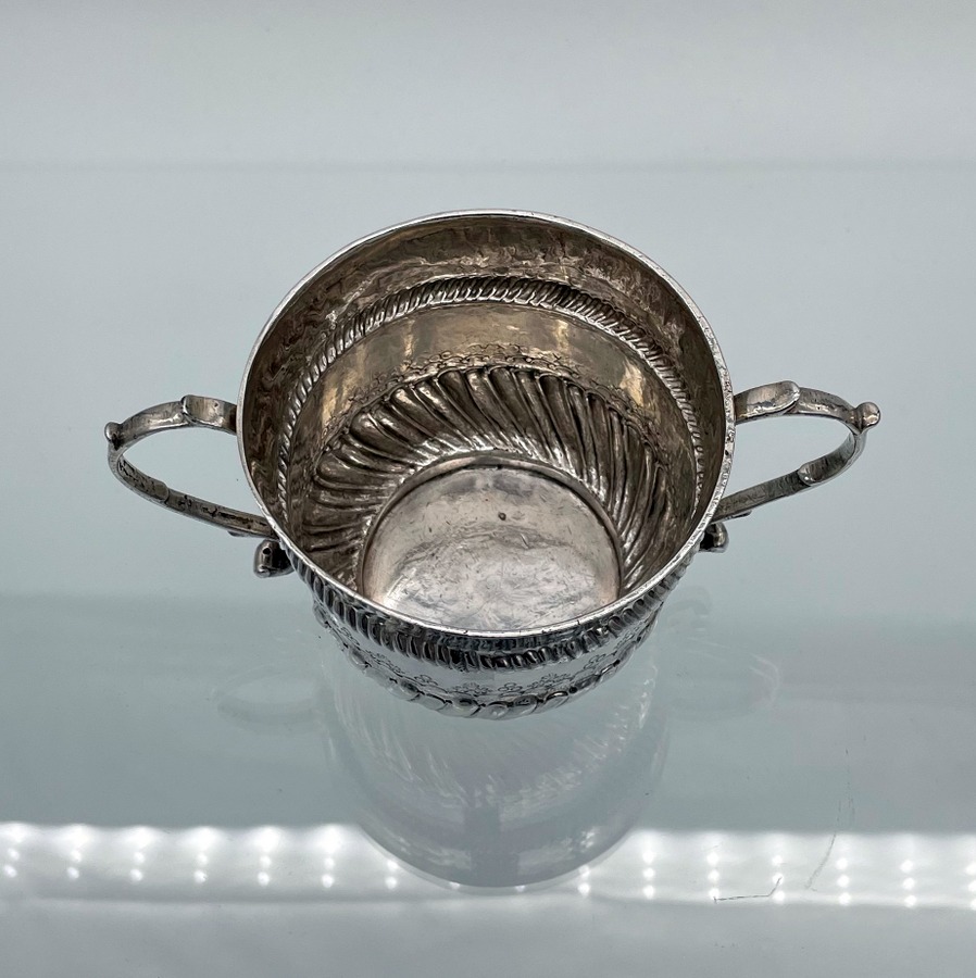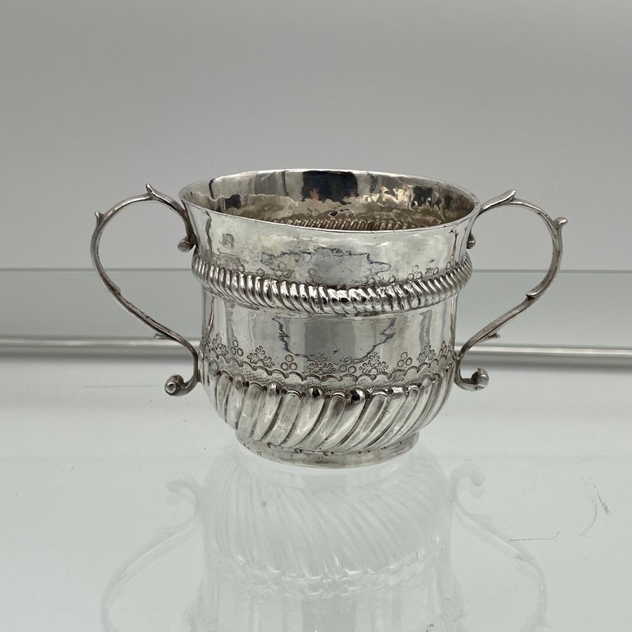 A beautiful 17th century silver porringer decorated with elegant curved lobes and flutes to the lower body. Â The upper section has additional lobe gallery band for highlights.