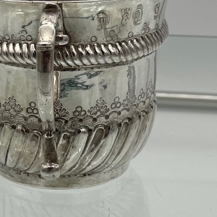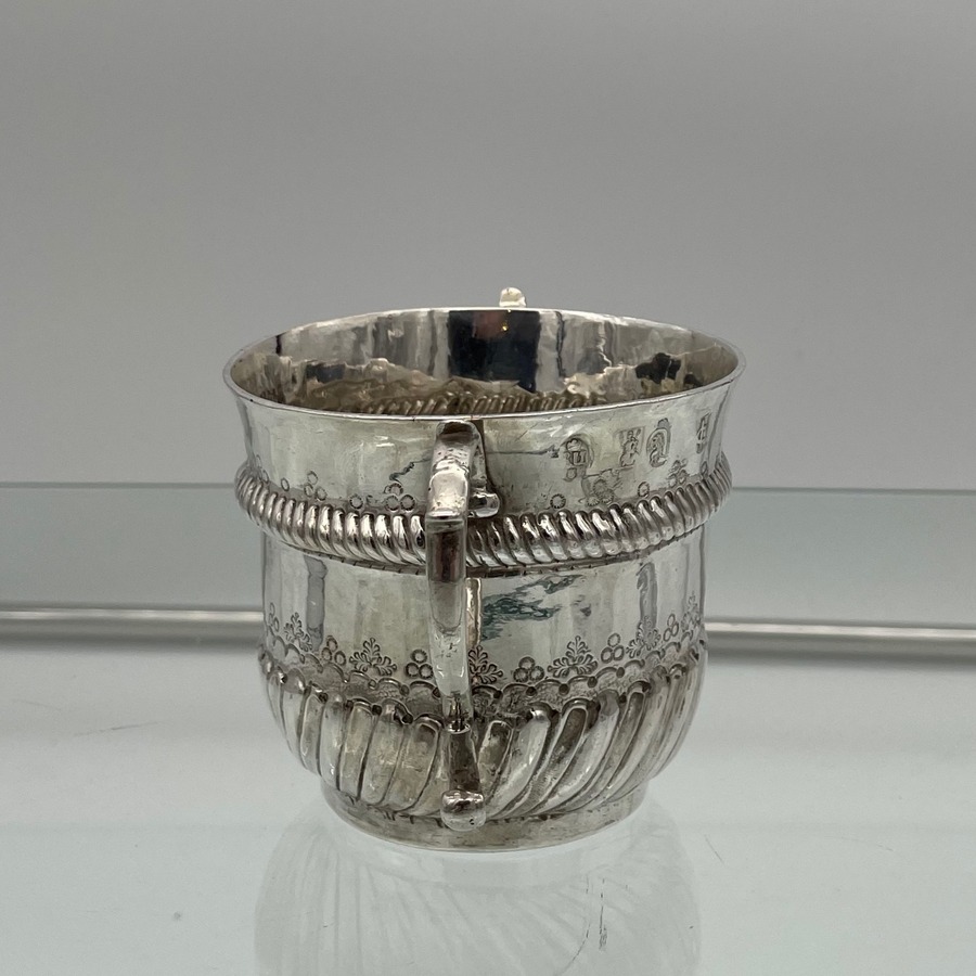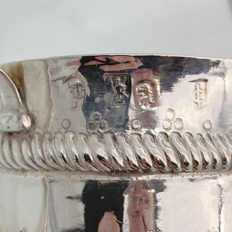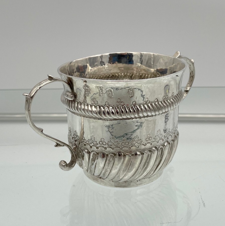 A beautiful 17th century silver porringer decorated with elegant curved lobes and flutes to the lower body. Â The upper section has additional lobe gallery band for highlights.