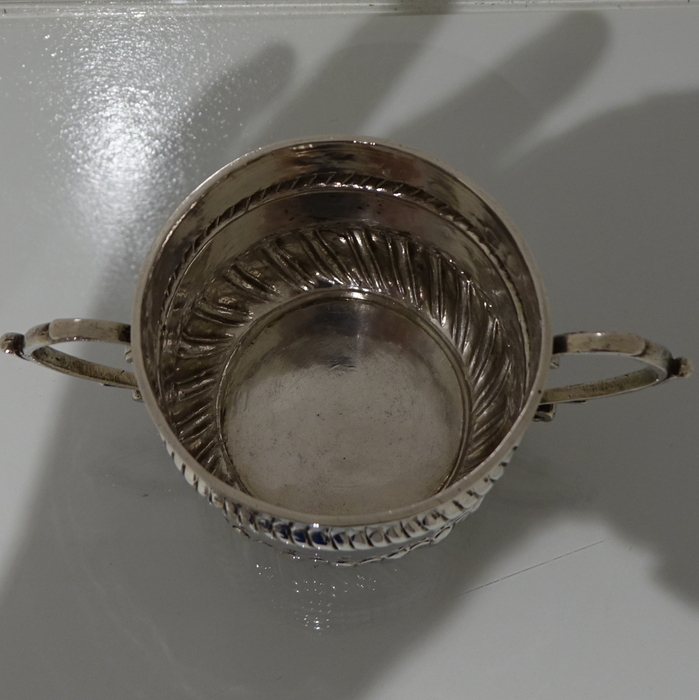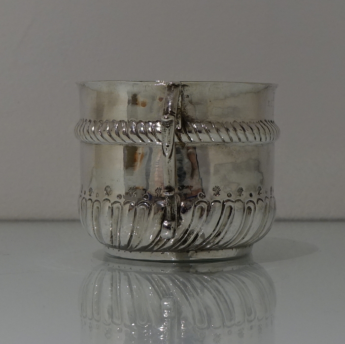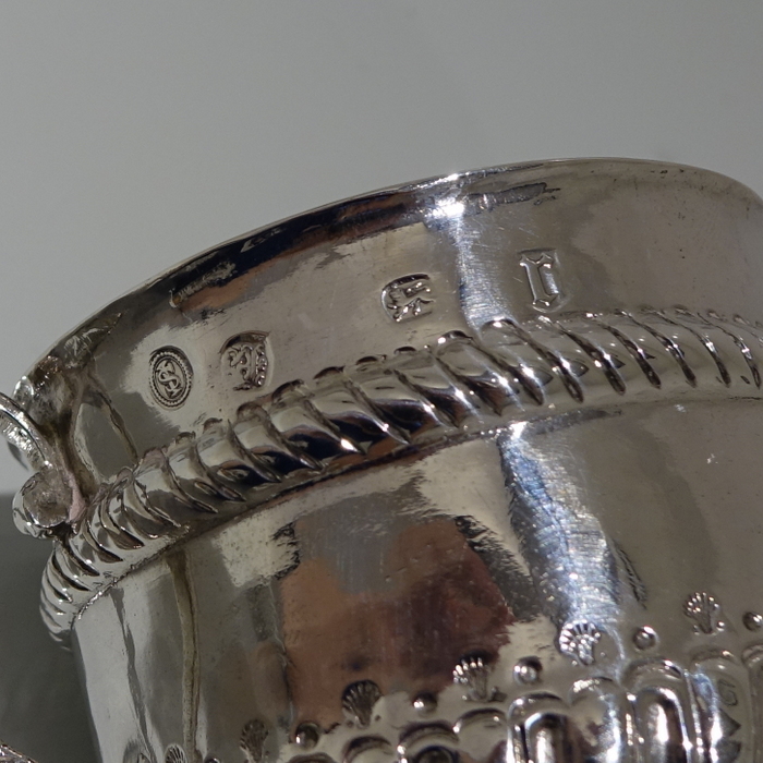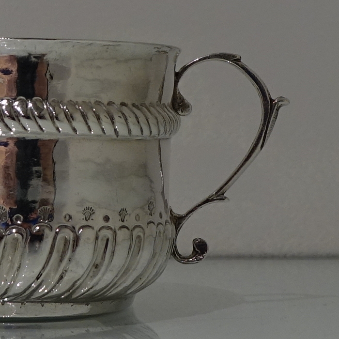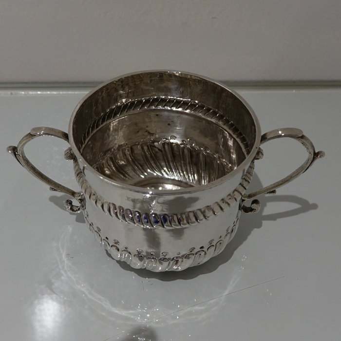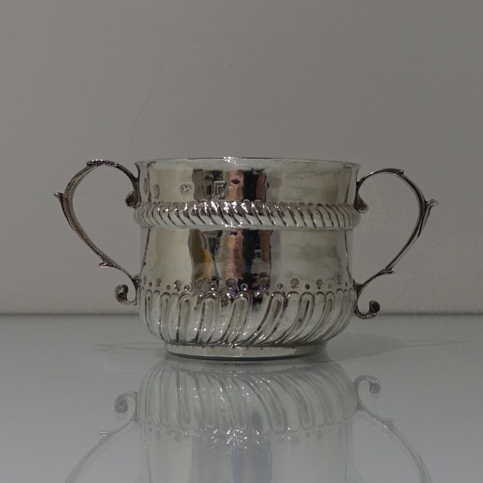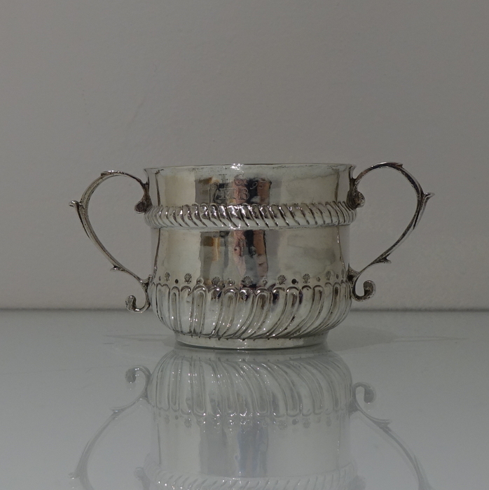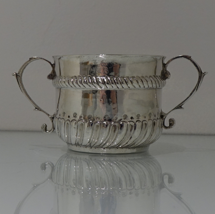 A rare and highly collectable William and Mary porringer with elegant swirl fluting for decoration to the lower section of the bowl and stylish scroll handles either side. Â The upper section has an elegant hand chased gadroon style gallery border for highlights.